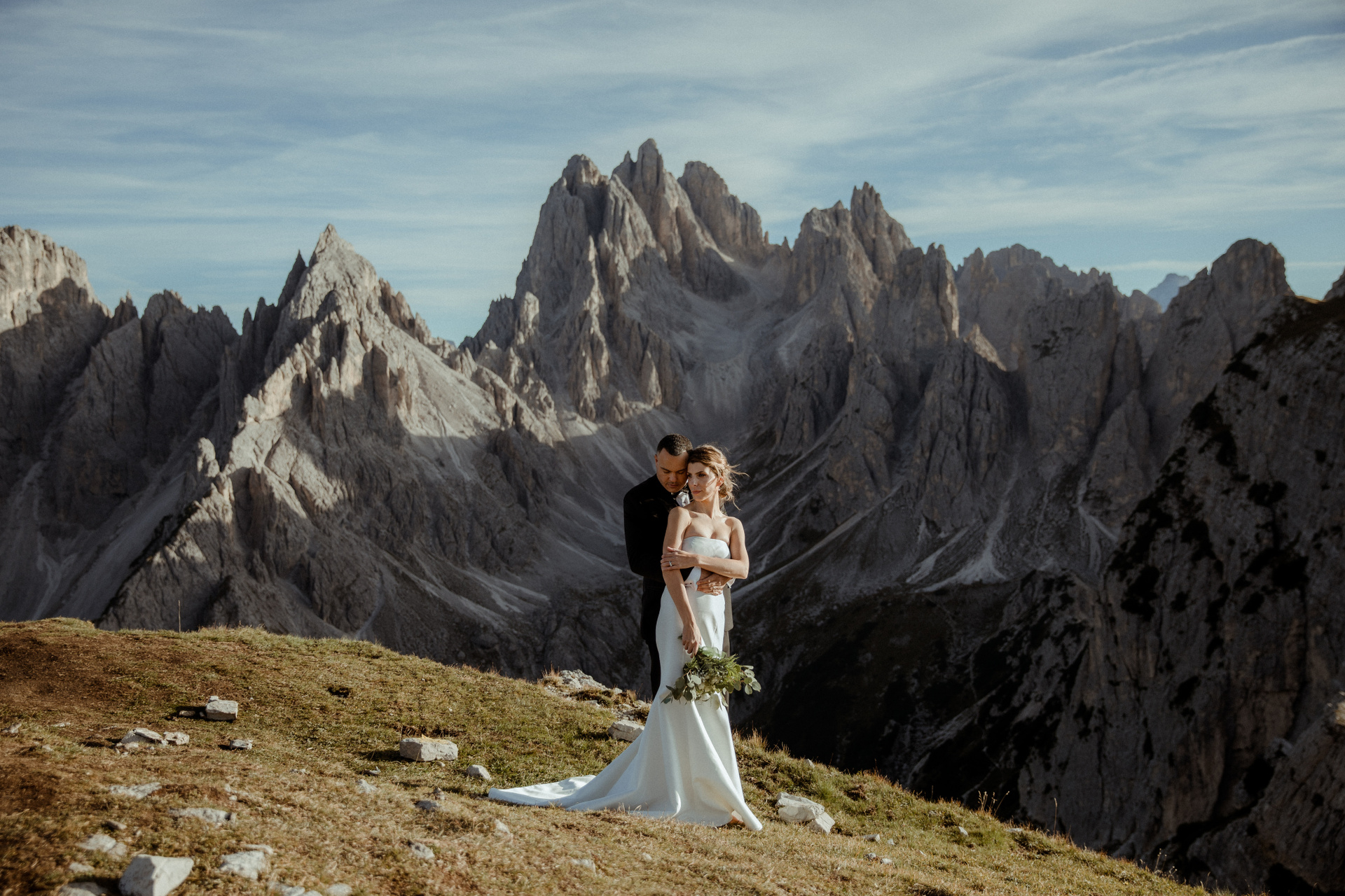 By the way, you can even stay overnight in Italian mountain huts (called Rifugios), that’s the perfect choice for a sunrise ceremony in the mountains as you can wake up early in the mountains and enjoy stunning locations without other tourists! This also can be a perfect option for your multi day adventure elopement in Dolomites!