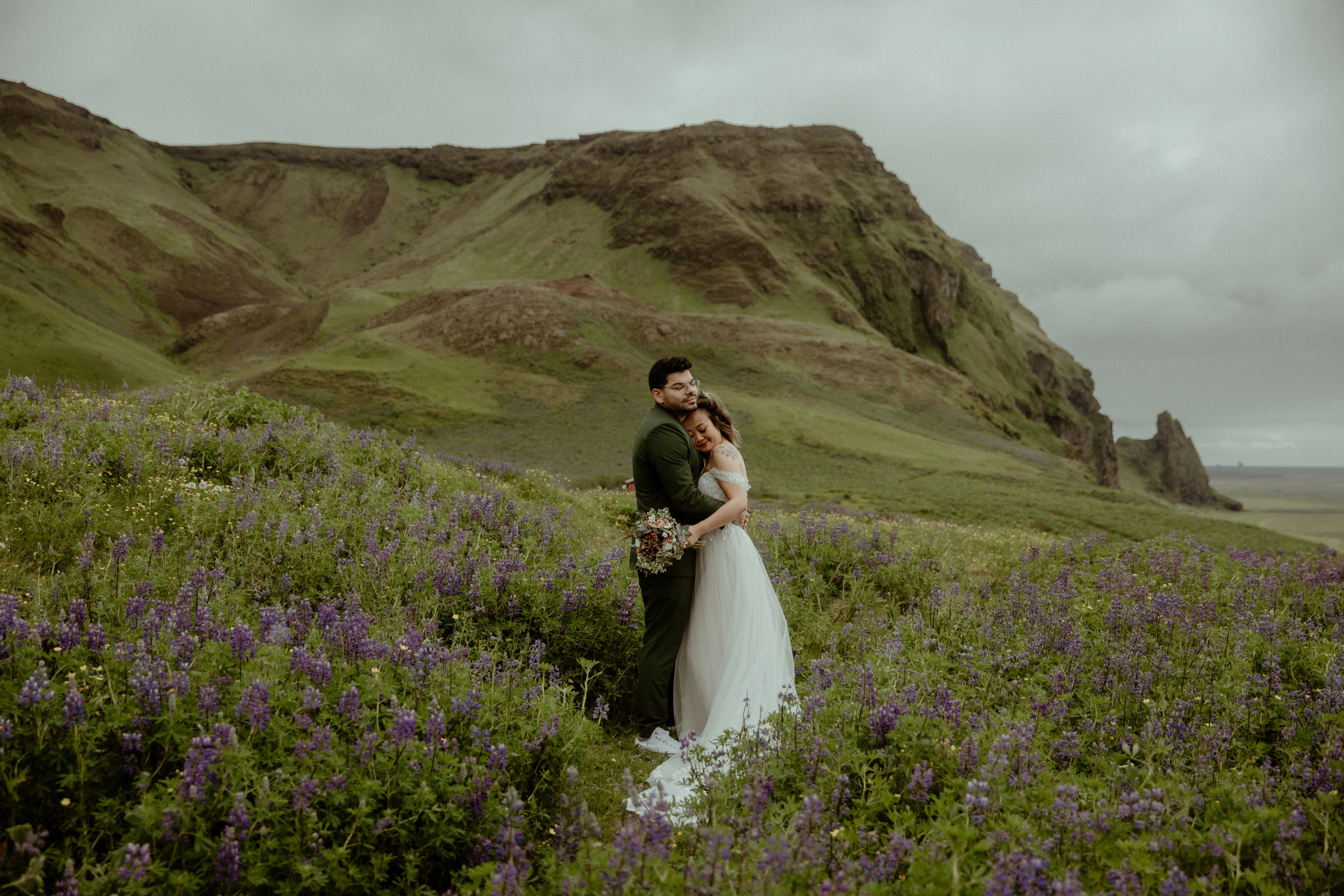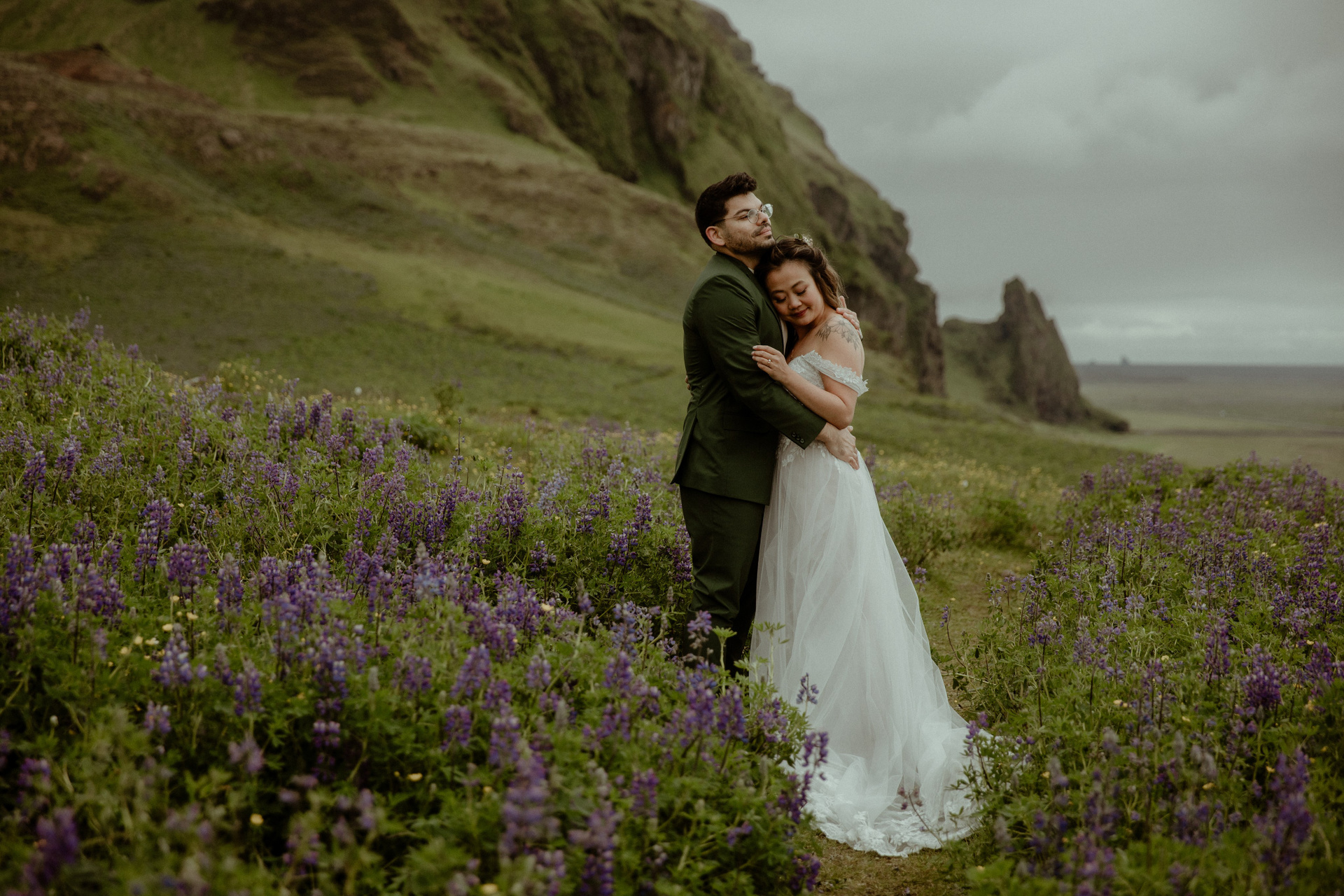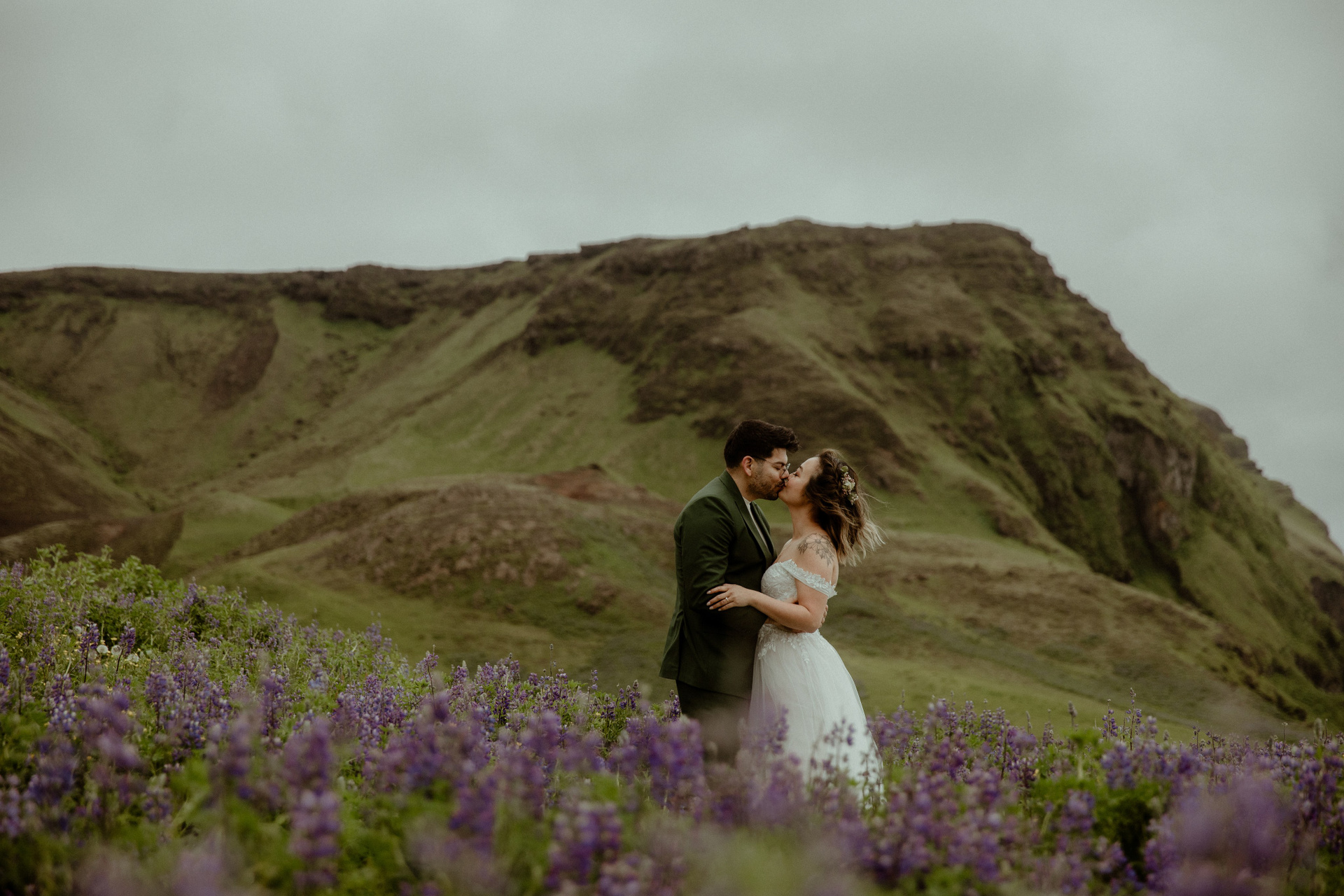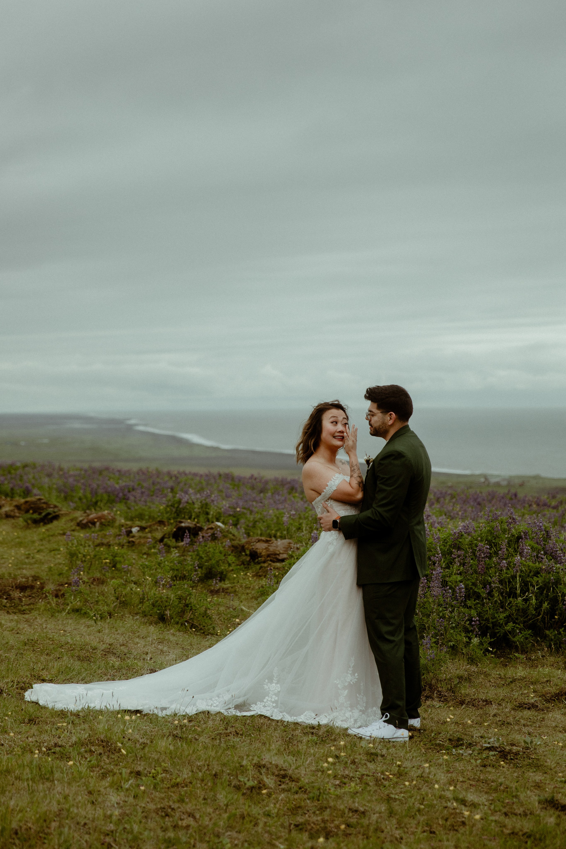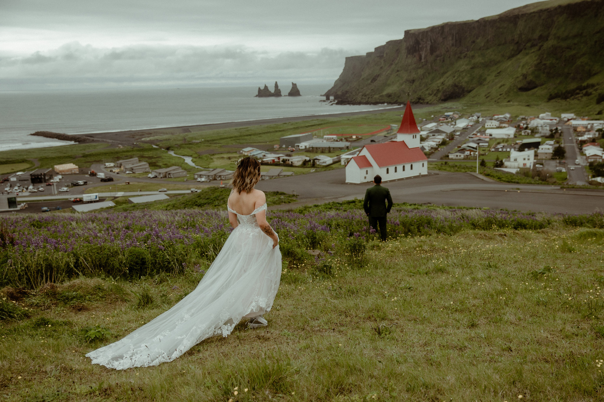 Their first look was picture-perfect in front red-roofed church in Vik, surrounded by the vibrant purples of lupines —making stunning background for their wedding photos.