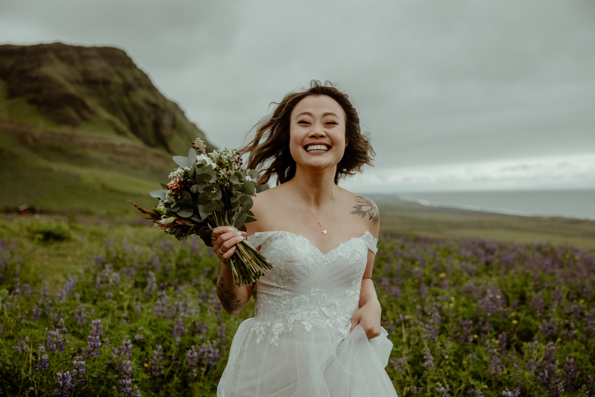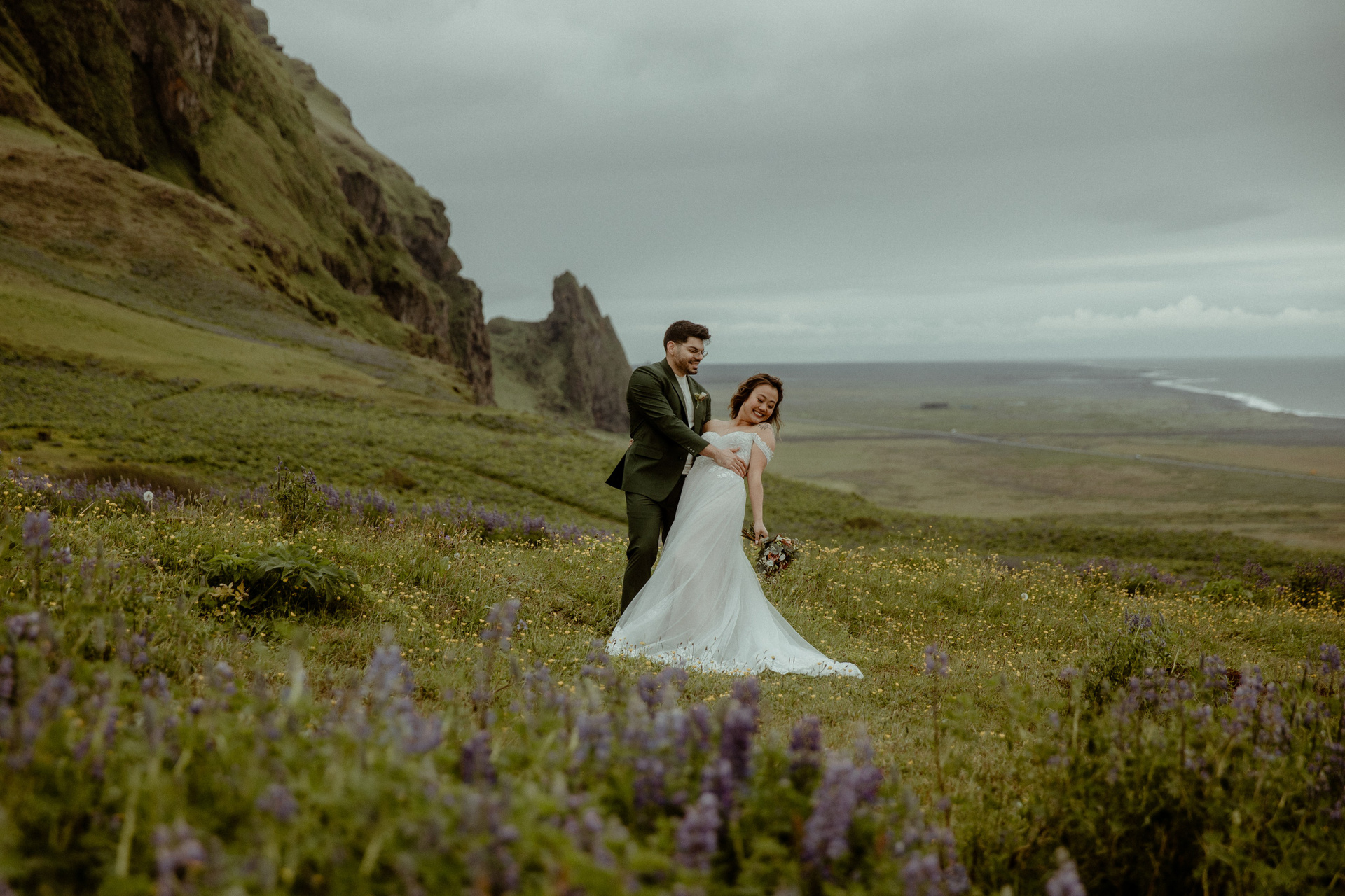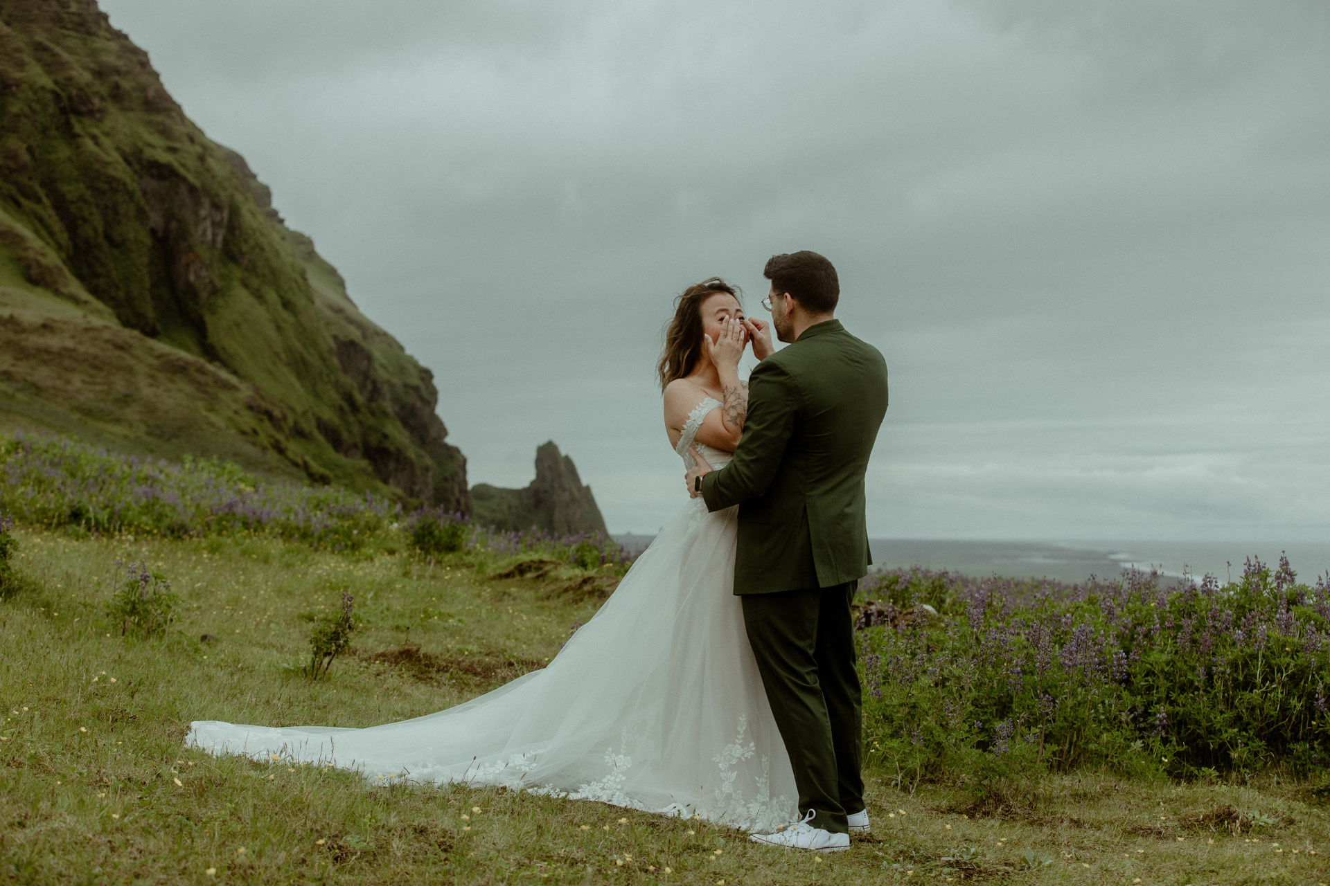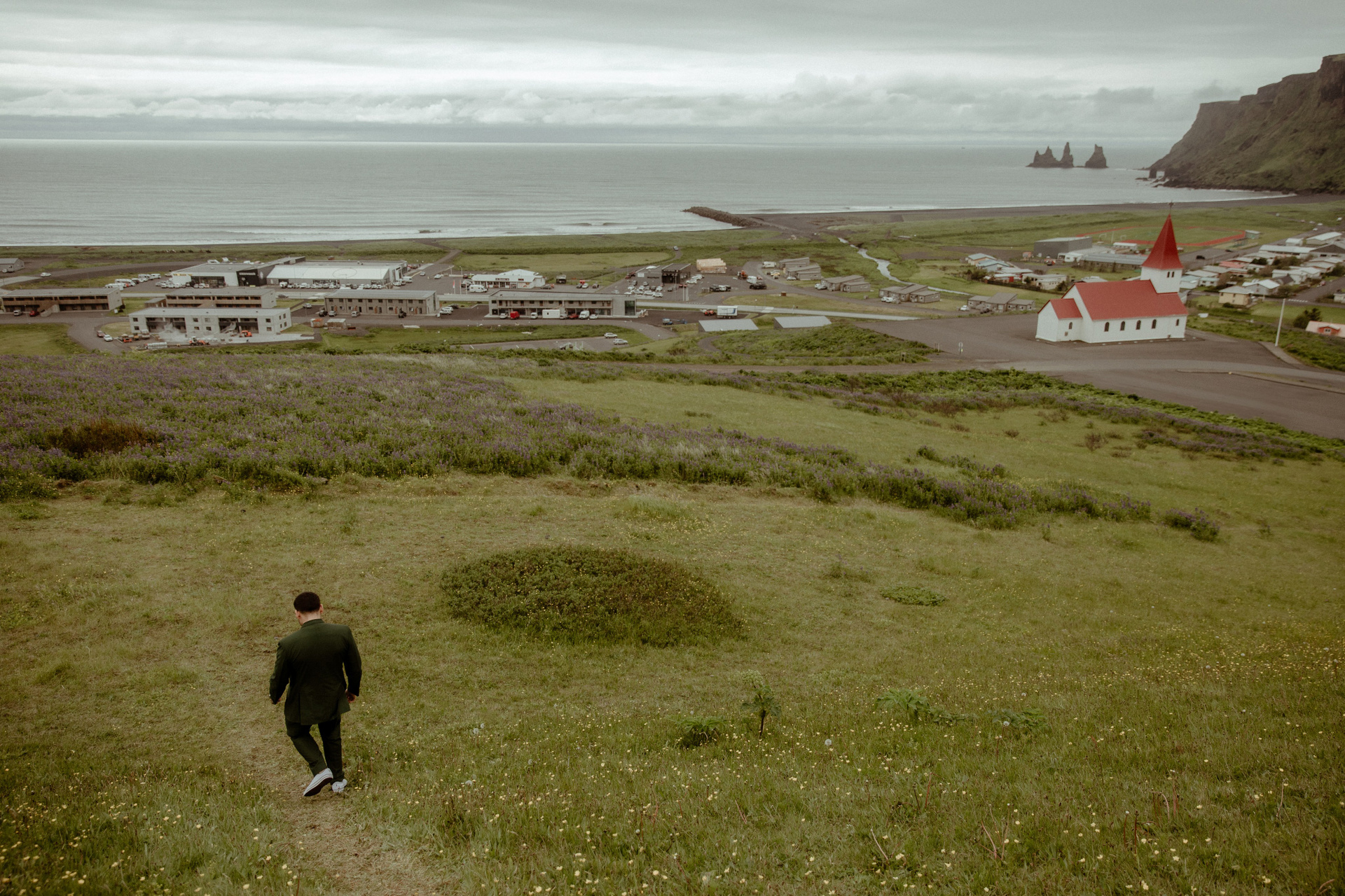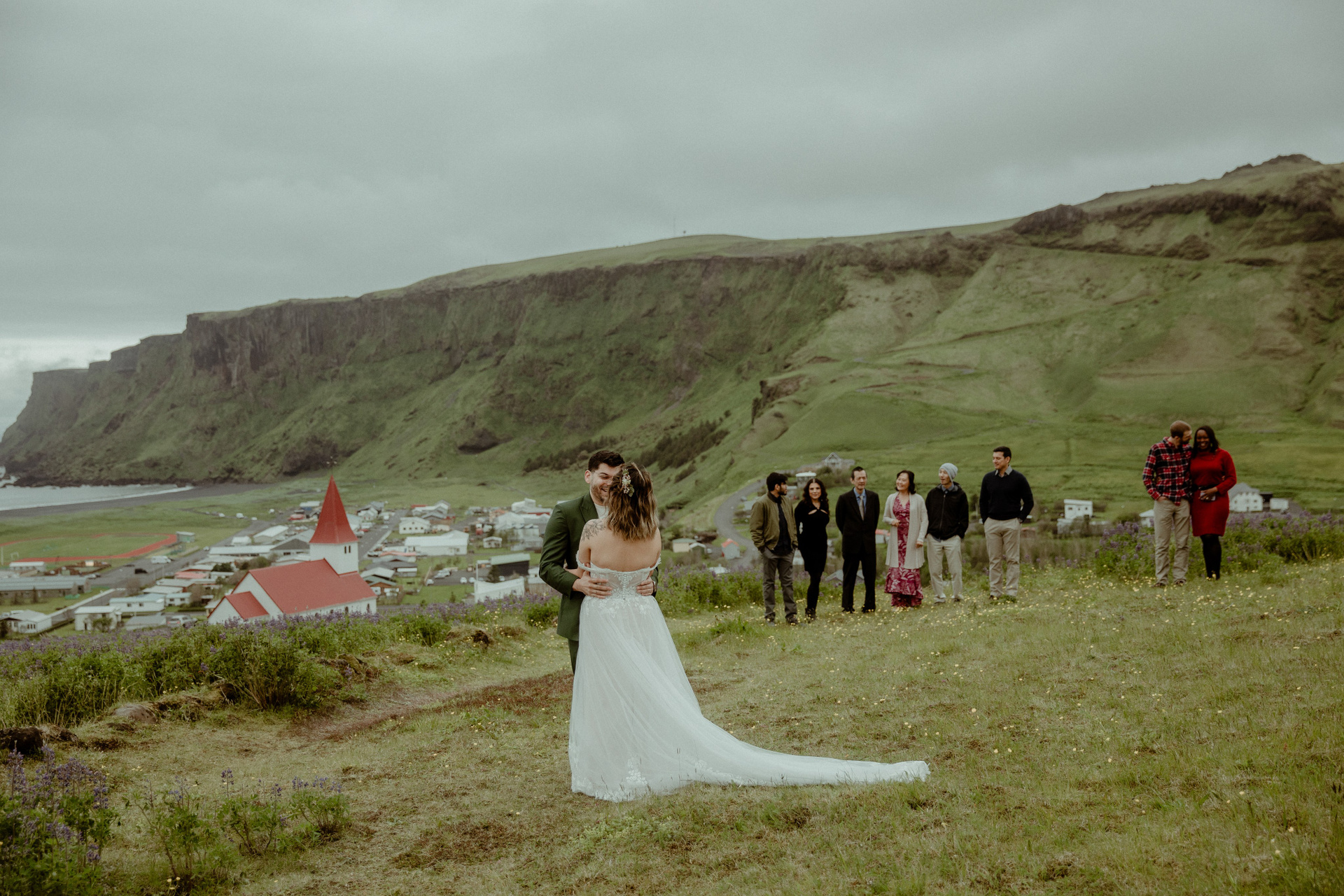 Their first look was picture-perfect in front red-roofed church in Vik, surrounded by the vibrant purples of lupines —making stunning background for their wedding photos.