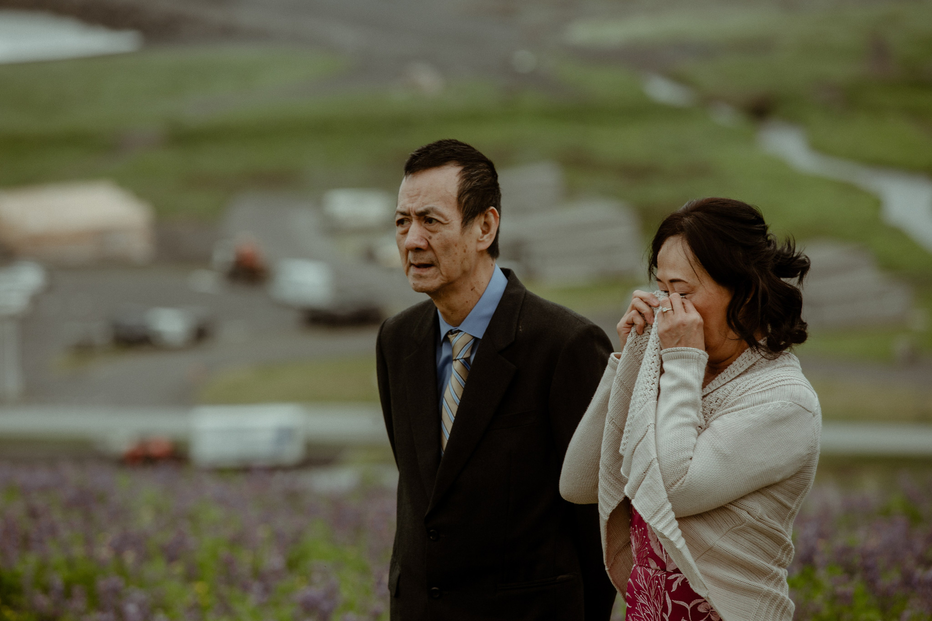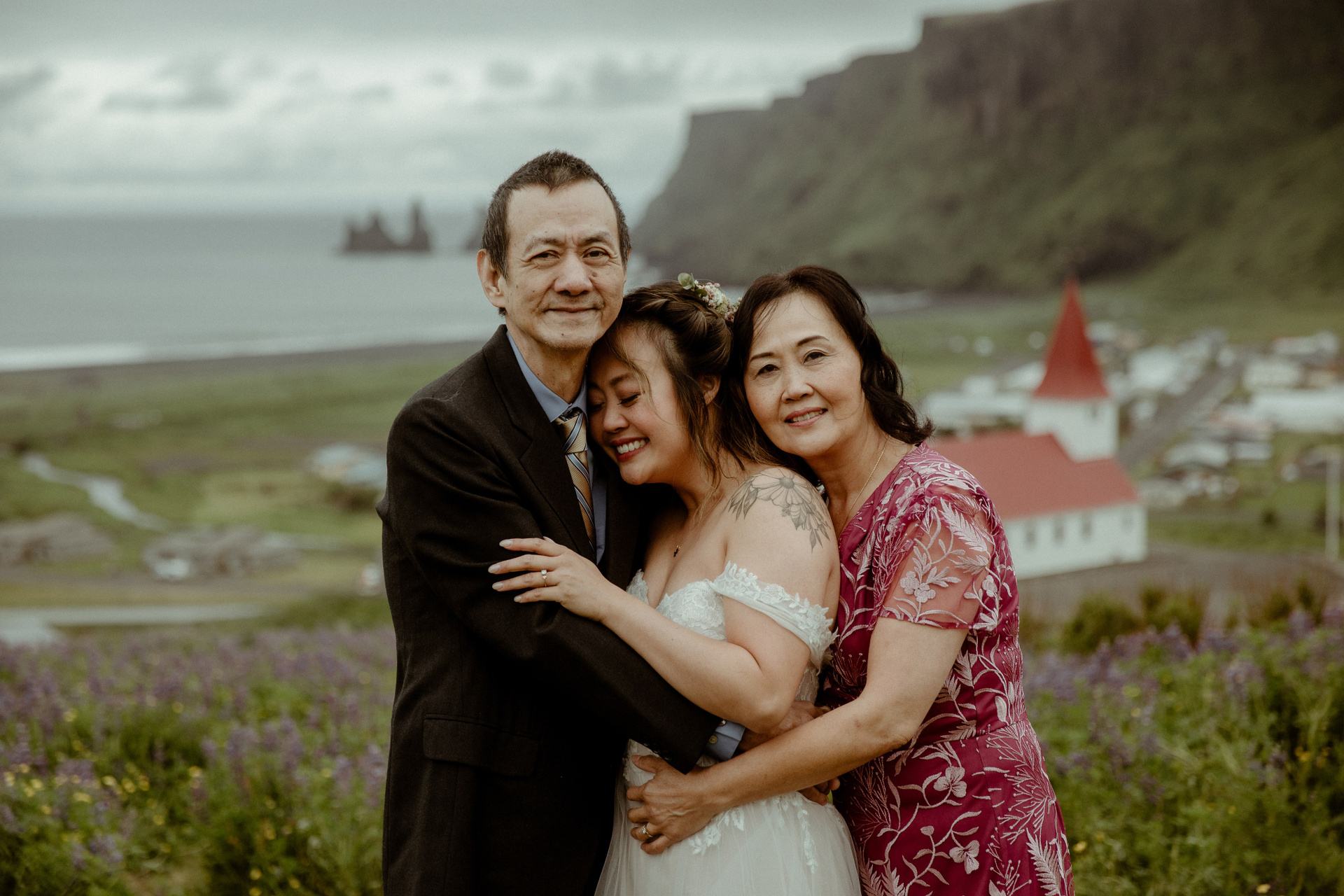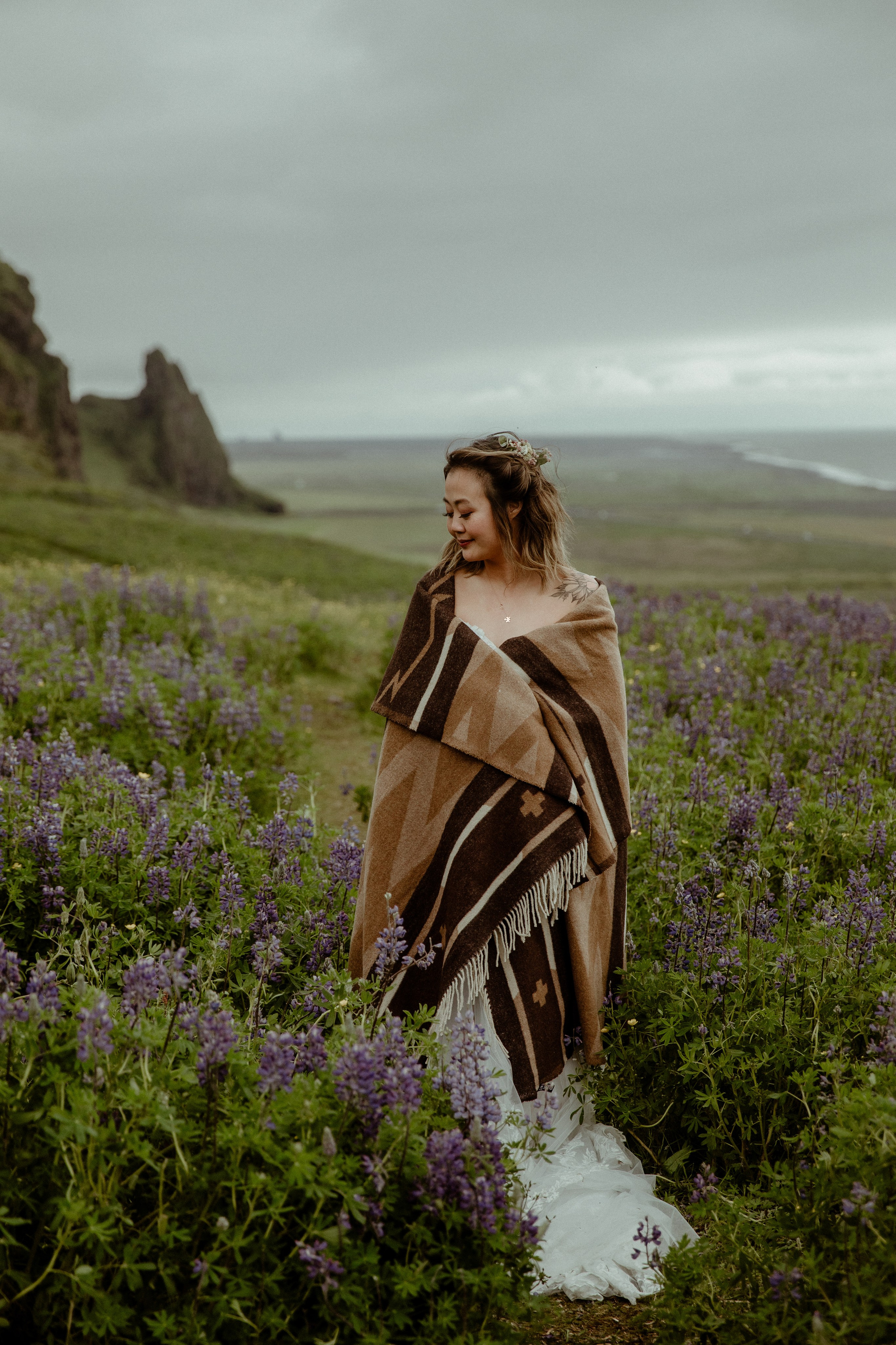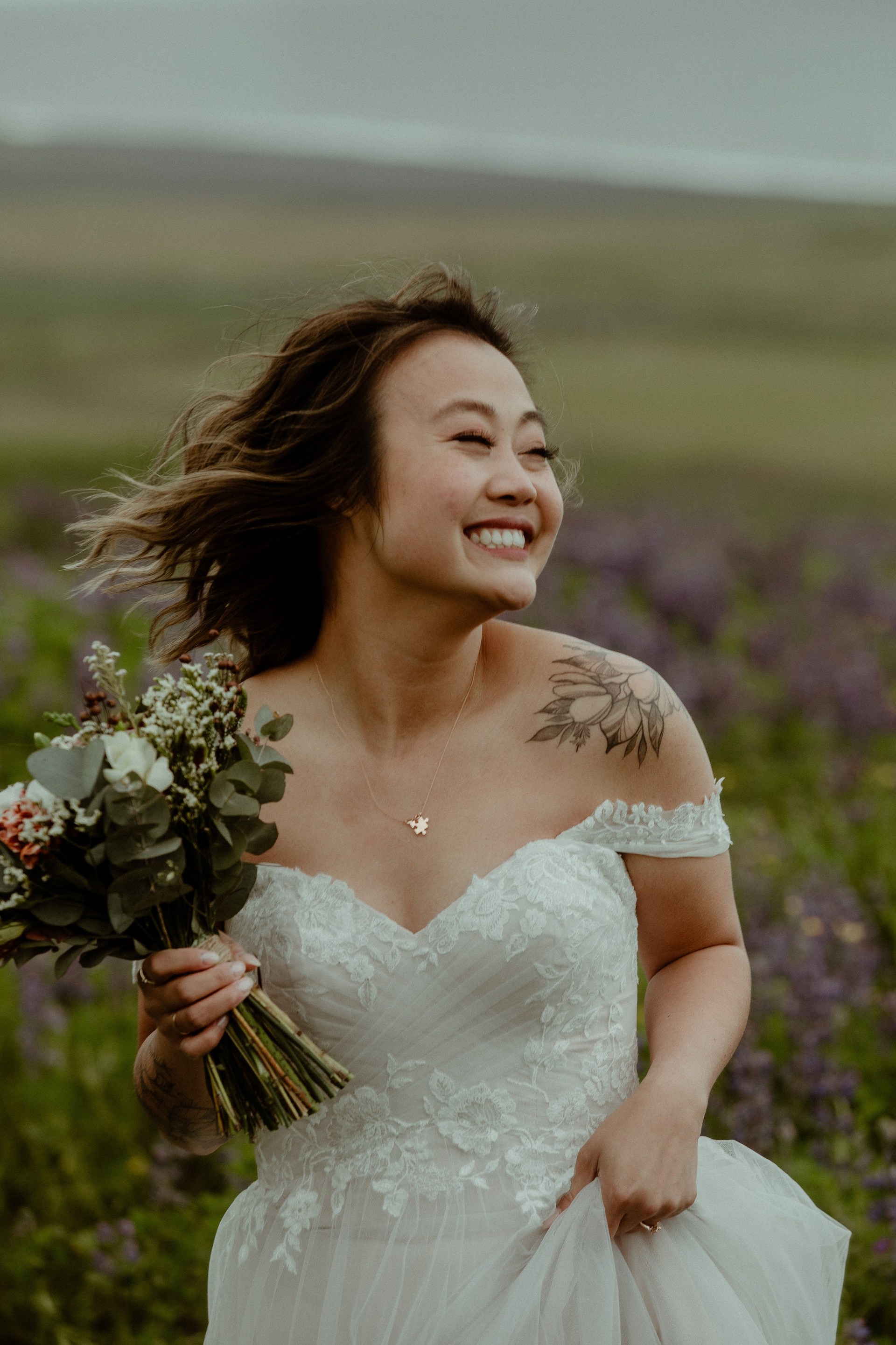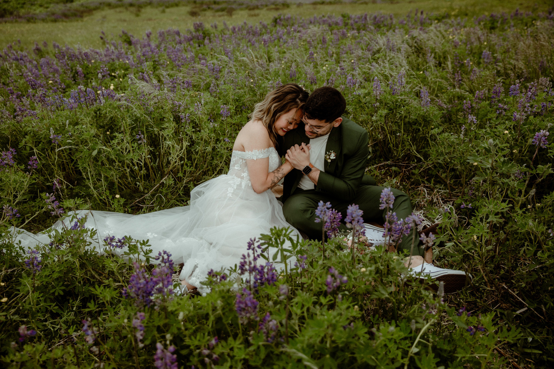 Their first look was picture-perfect in front red-roofed church in Vik, surrounded by the vibrant purples of lupines —making stunning background for their wedding photos.