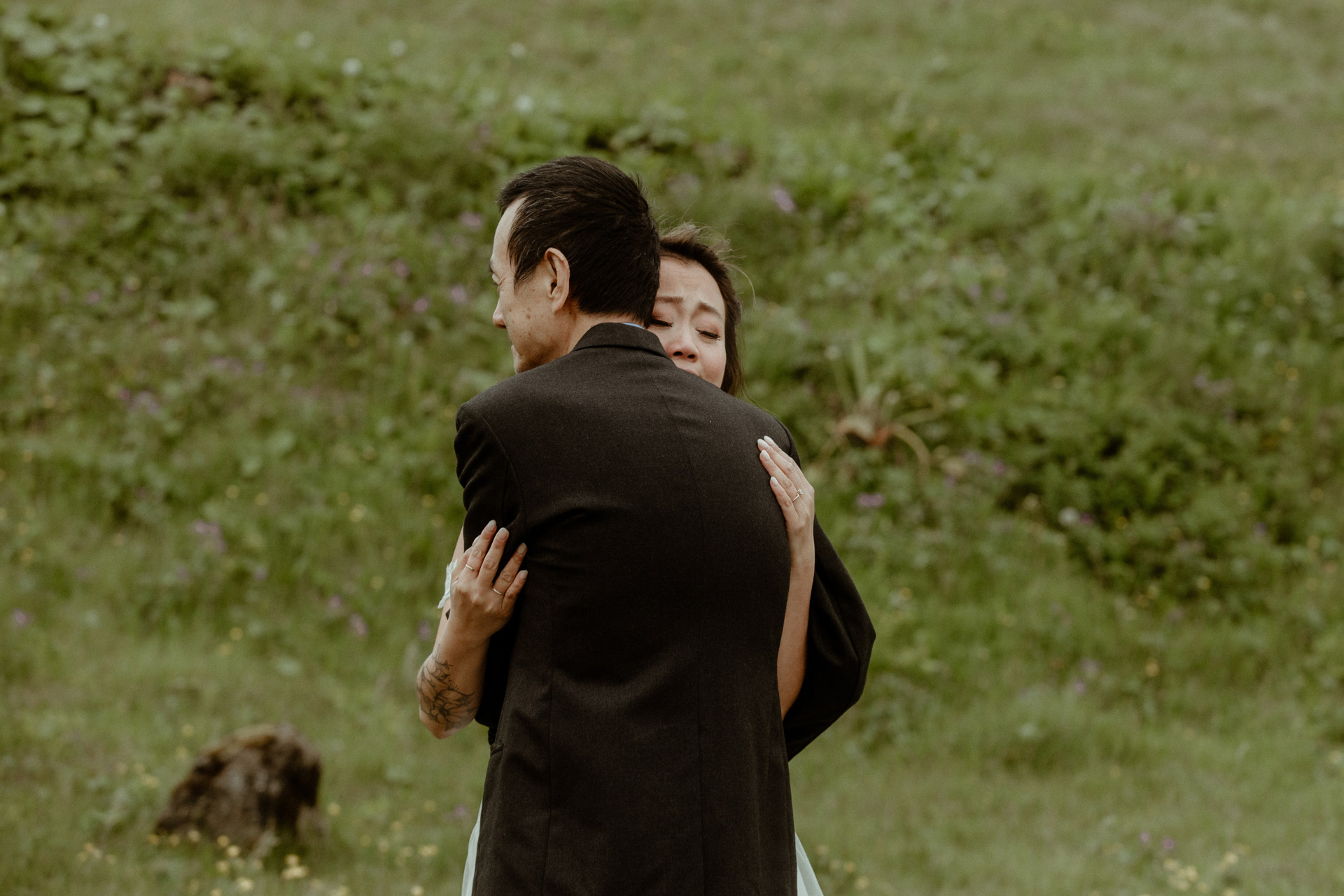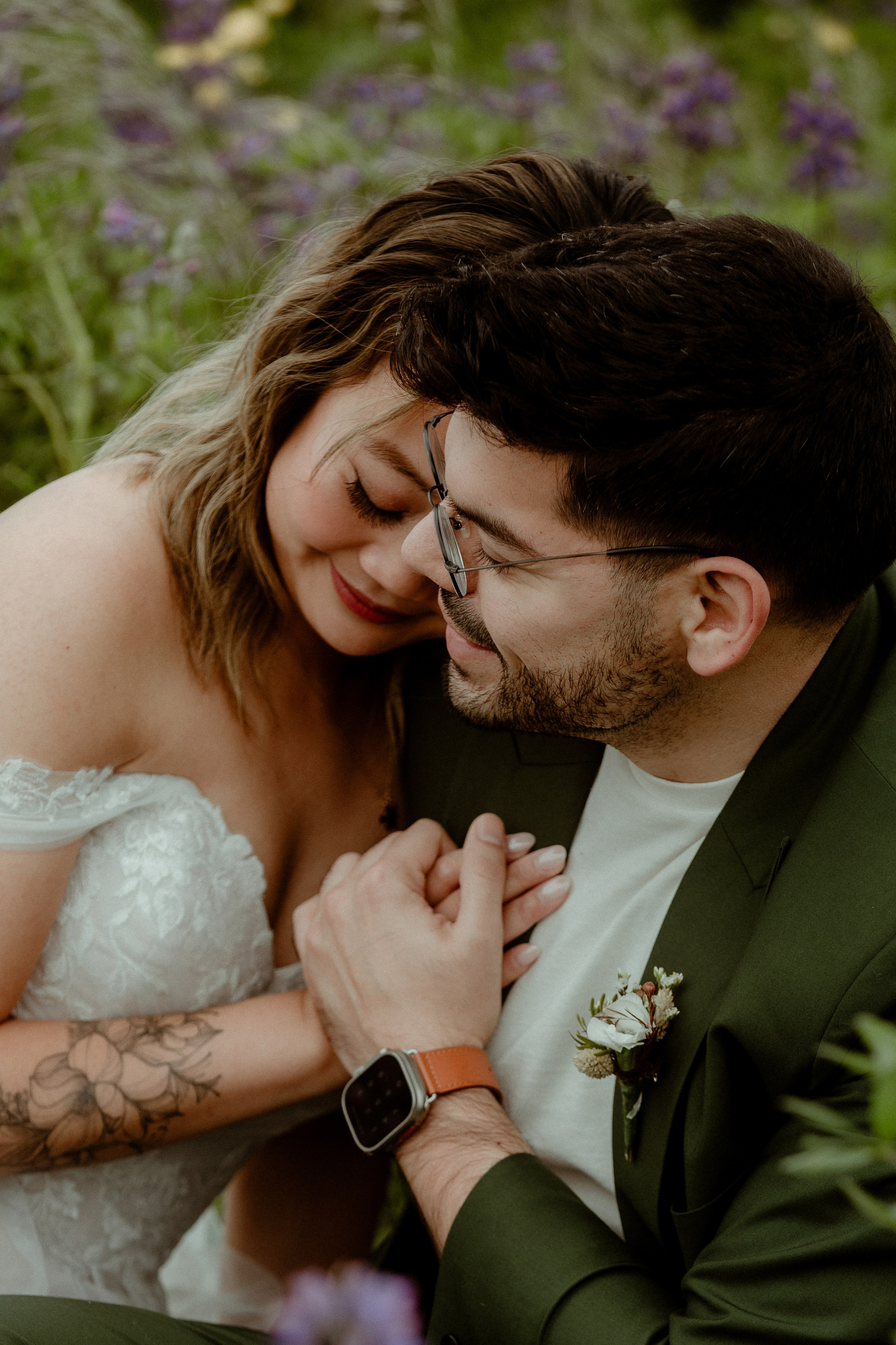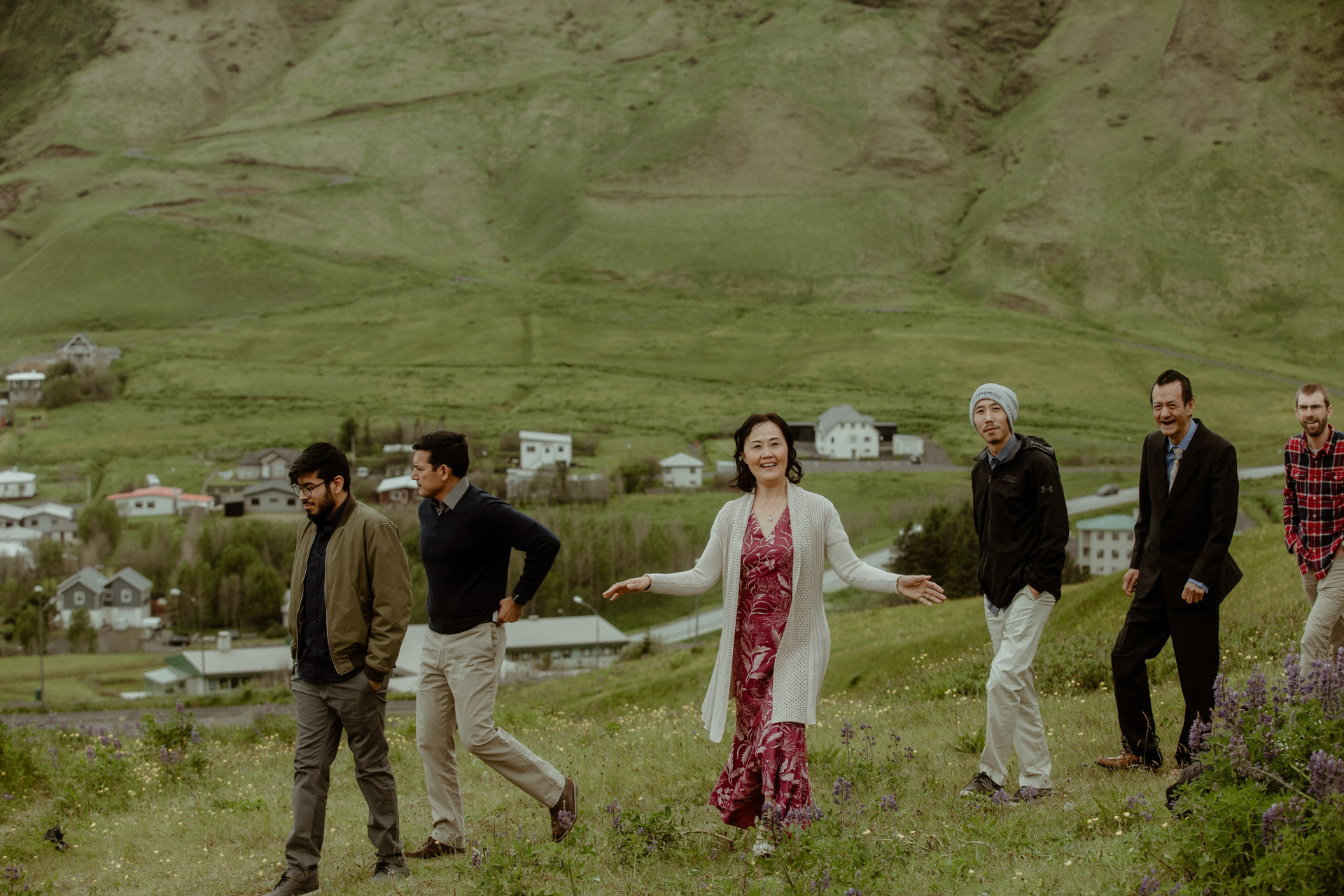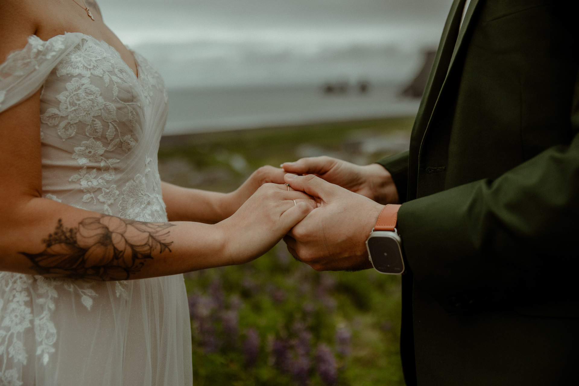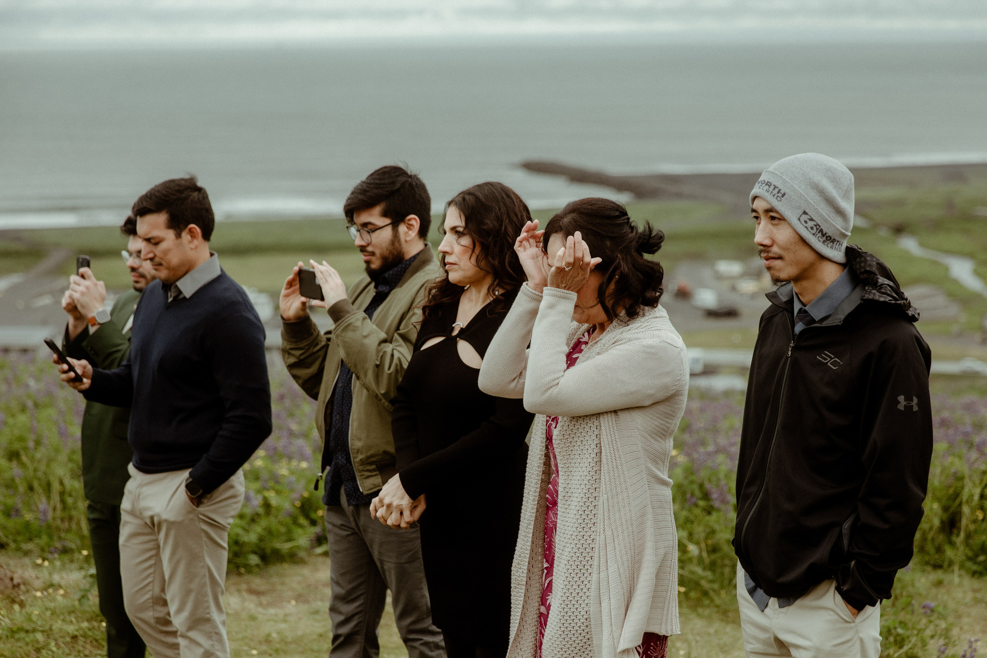 Their first look was picture-perfect in front red-roofed church in Vik, surrounded by the vibrant purples of lupines —making stunning background for their wedding photos.