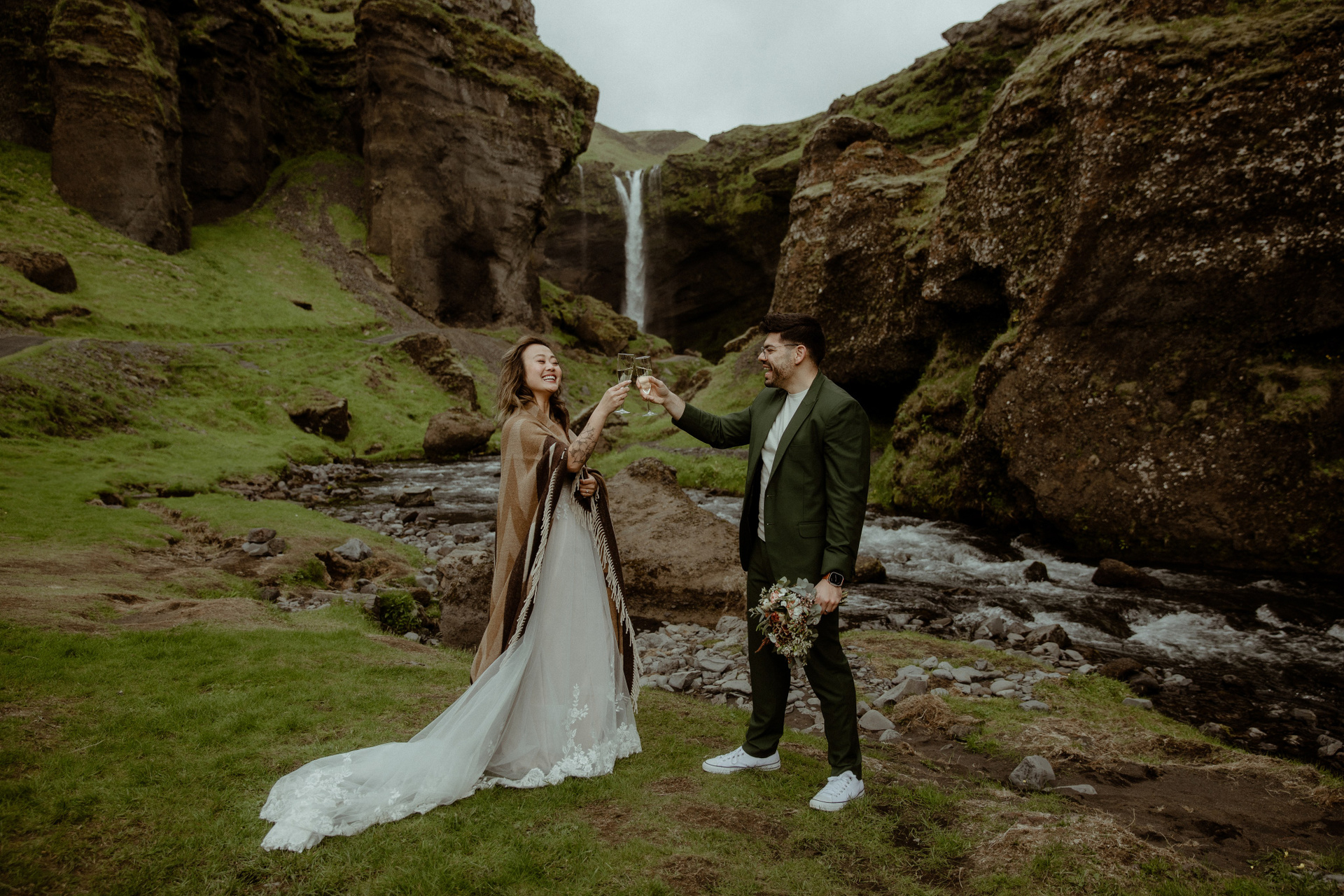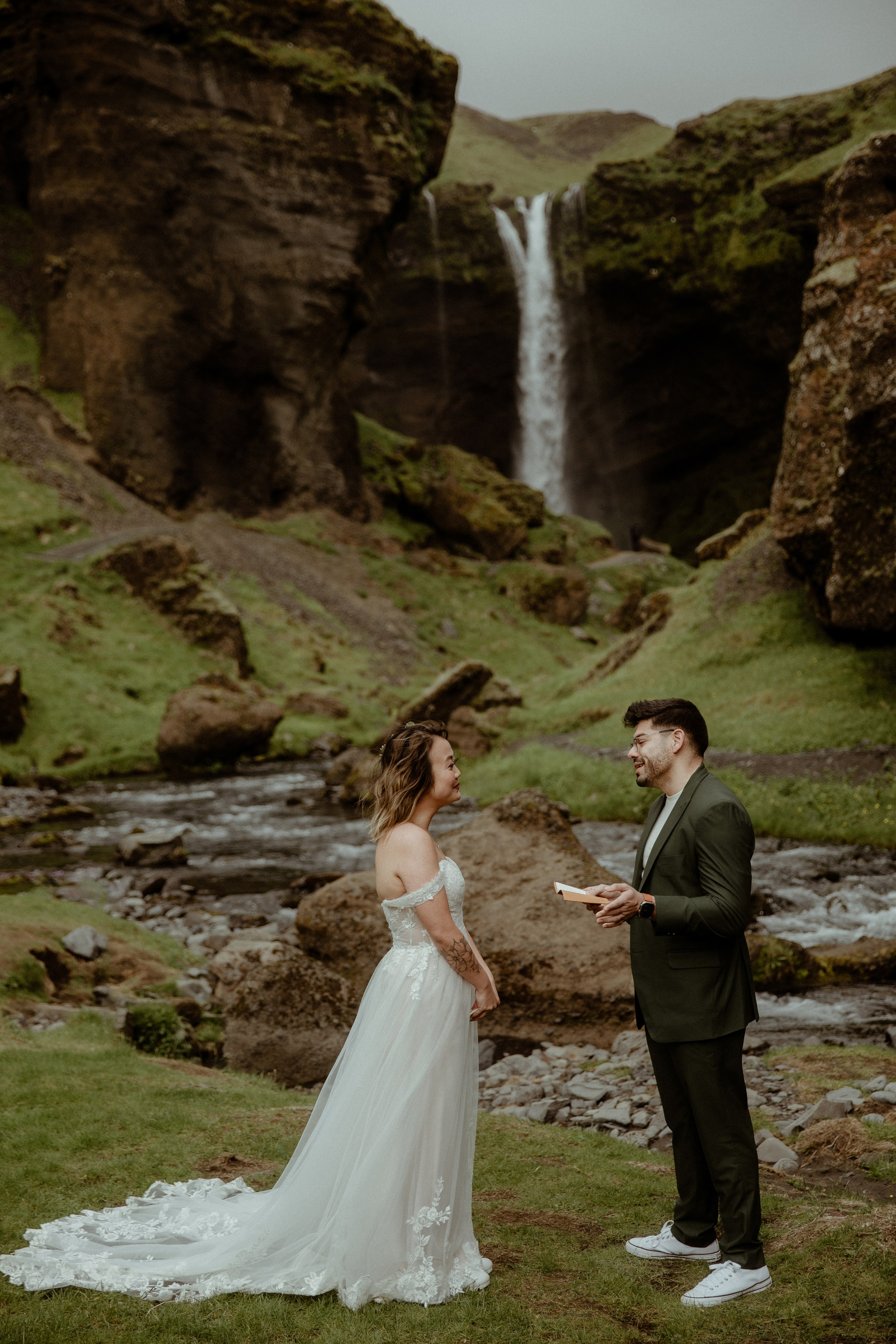 Linda and Ronaldo’s dream to get married in Iceland came true with an unforgettable wedding at Kvernufoss waterfall. Their day began in Vik, with views of the black sand beach setting the scene for a day full of love and adventure.