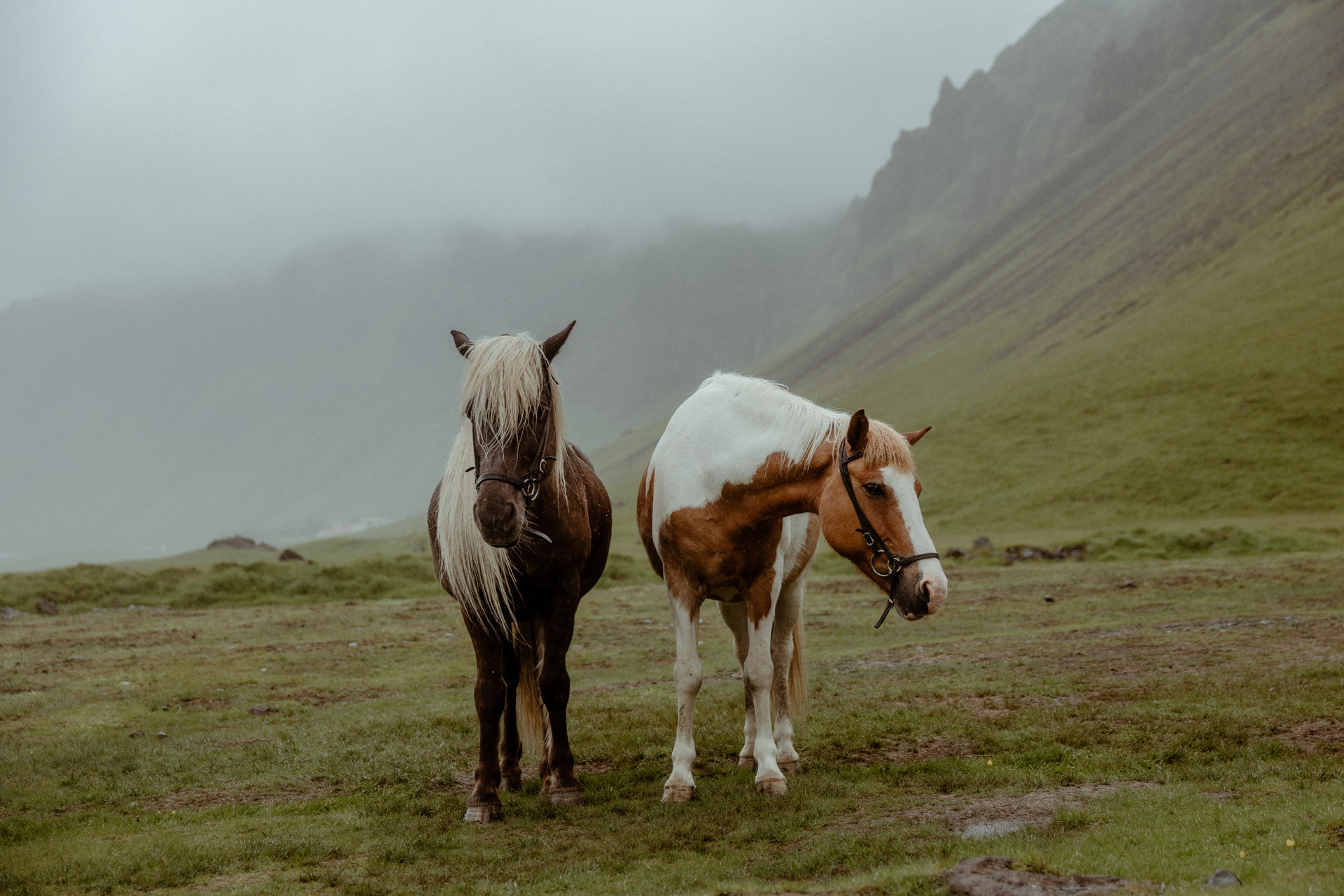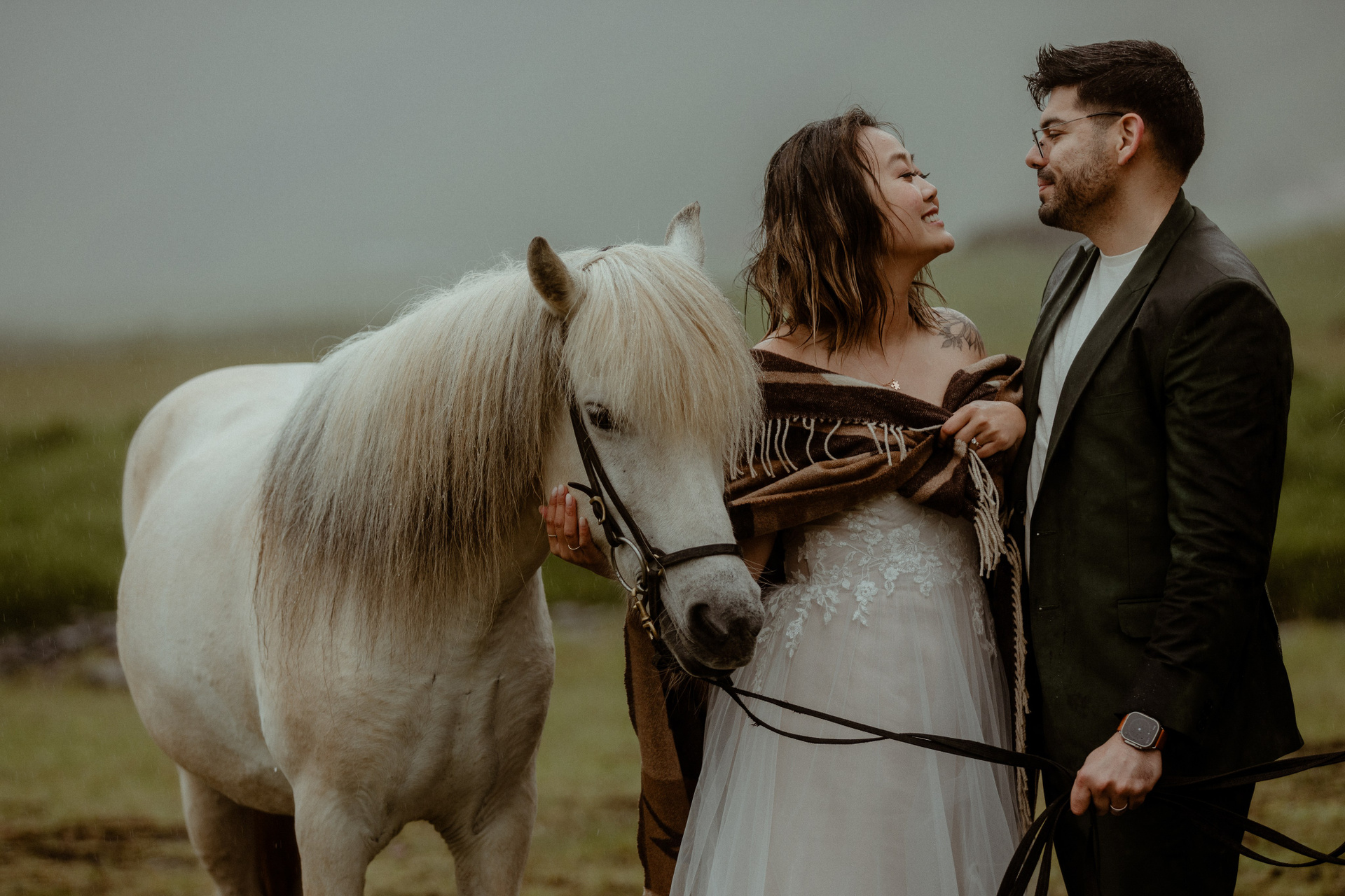 Linda and Ronaldo hiked behind the waterfall for some epic shots and then spent some time with the friendliest locals around — the plan was to have wedding photoshoot with Icelandic horses! Despite the rain, their spirits (and the horses) were high, adding a fun and quirky touch to their wedding day in Iceland.