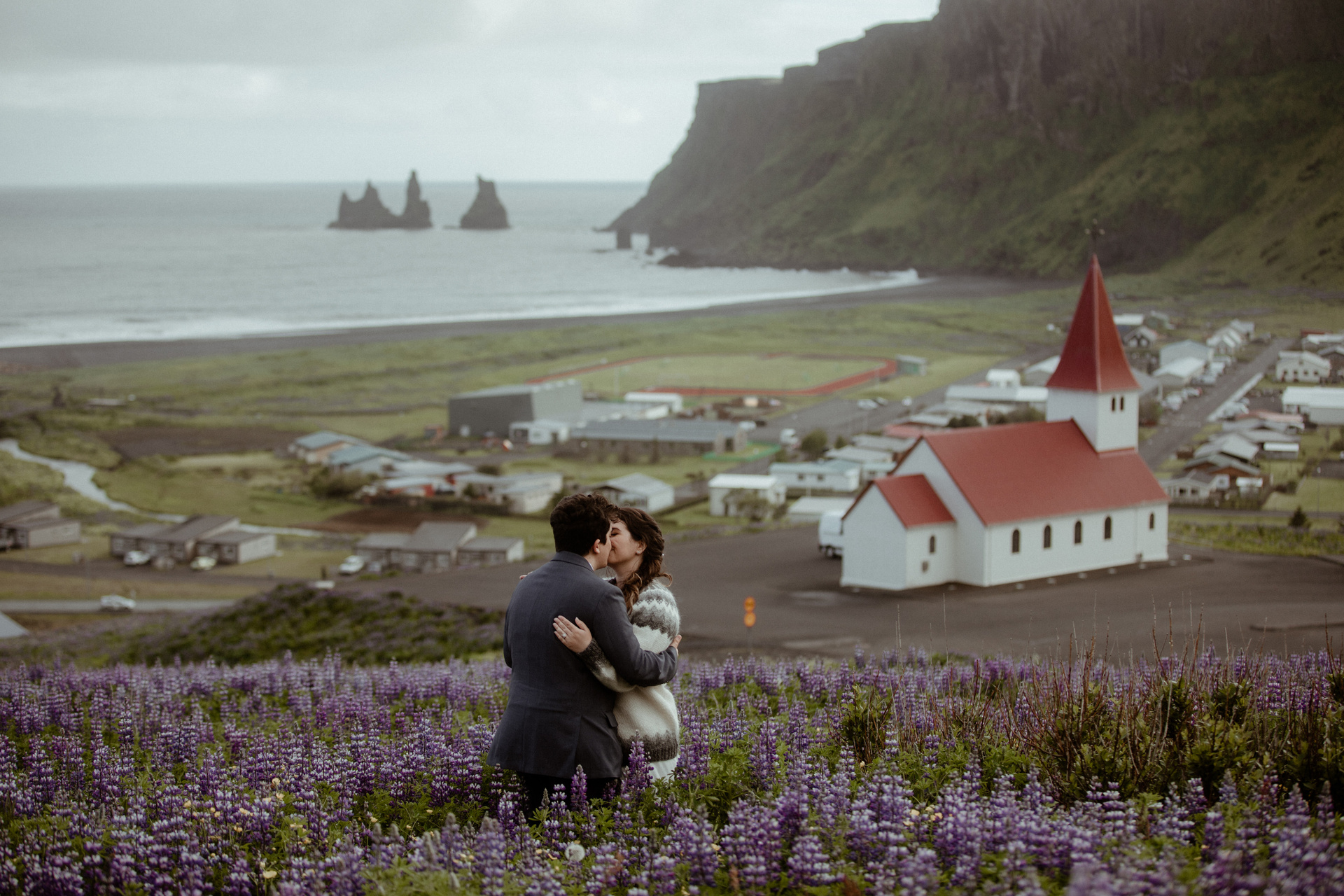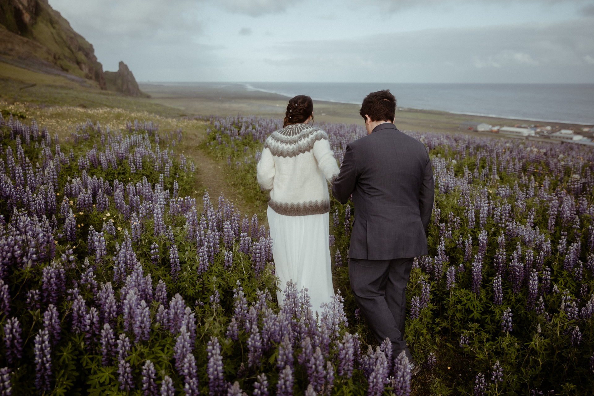 We then ventured out for some incredible wedding photos at a glacier, capturing the essence of their adventure elopement in Iceland. The blooming summer lupines added a touch of whimsy to their already picturesque day.