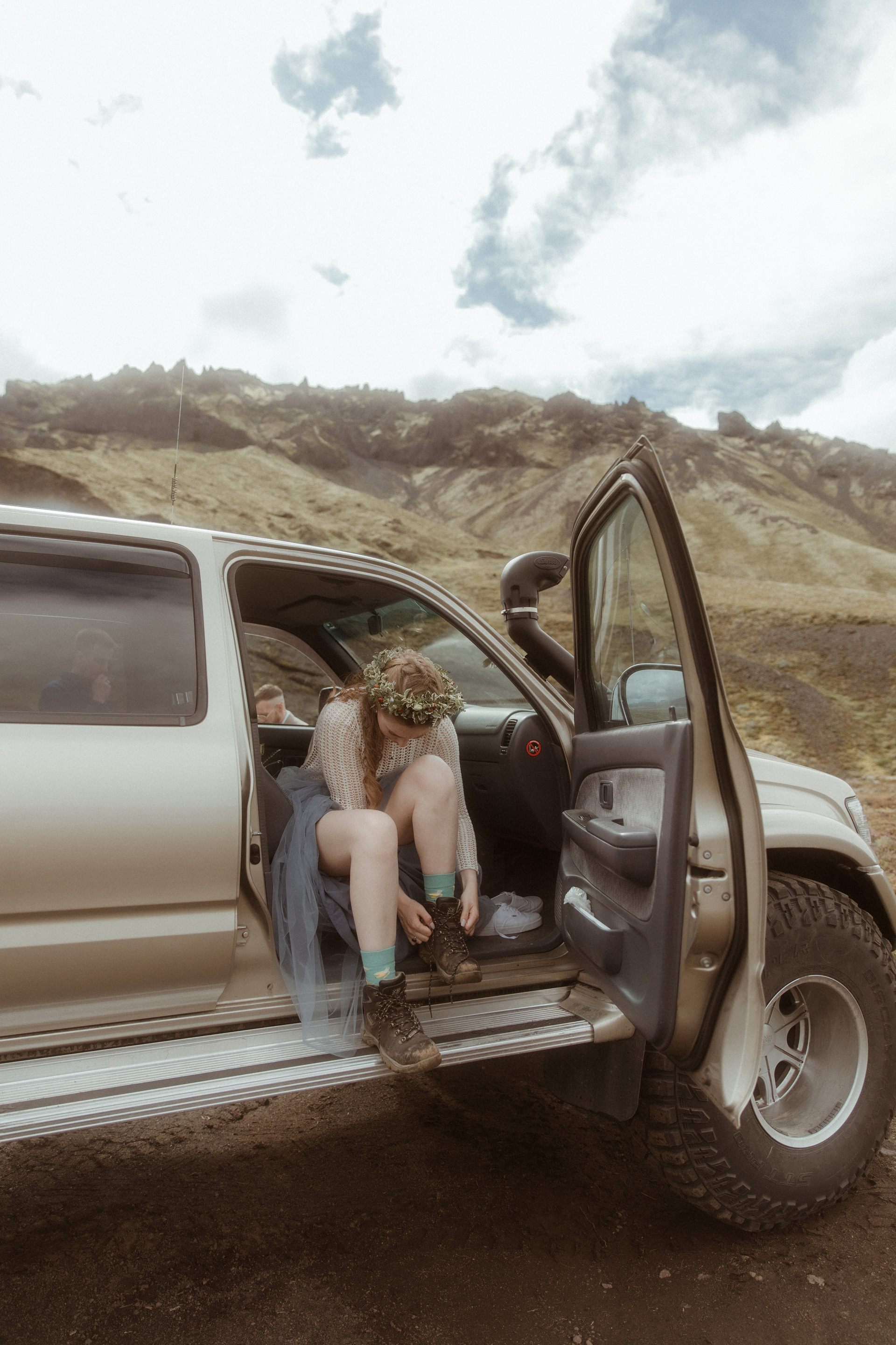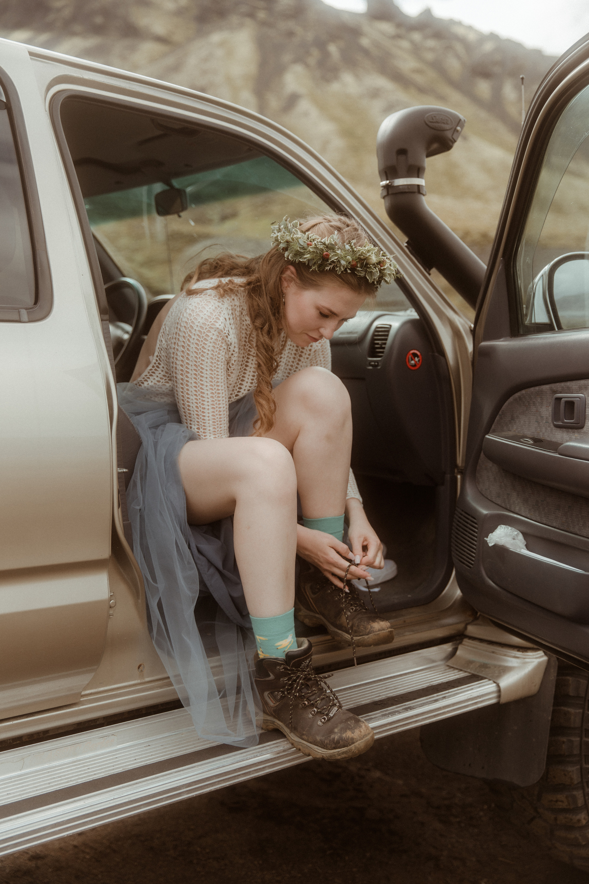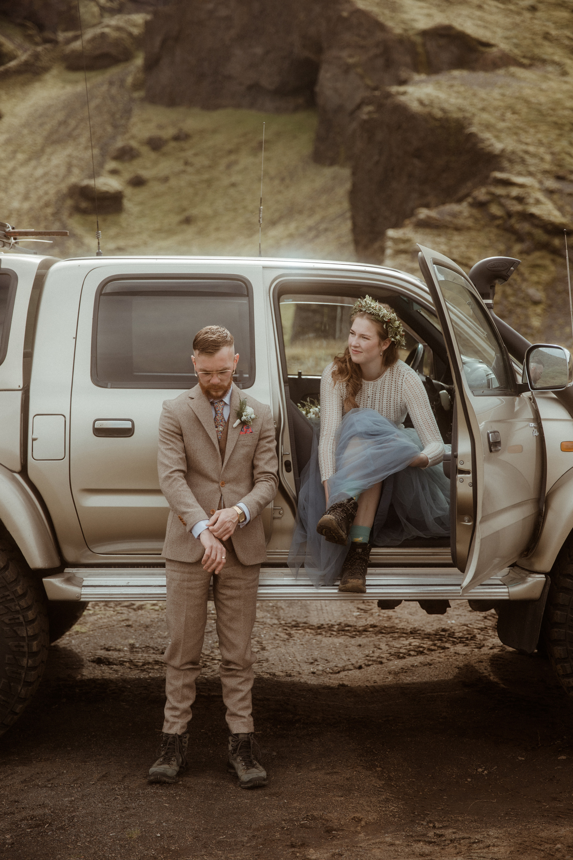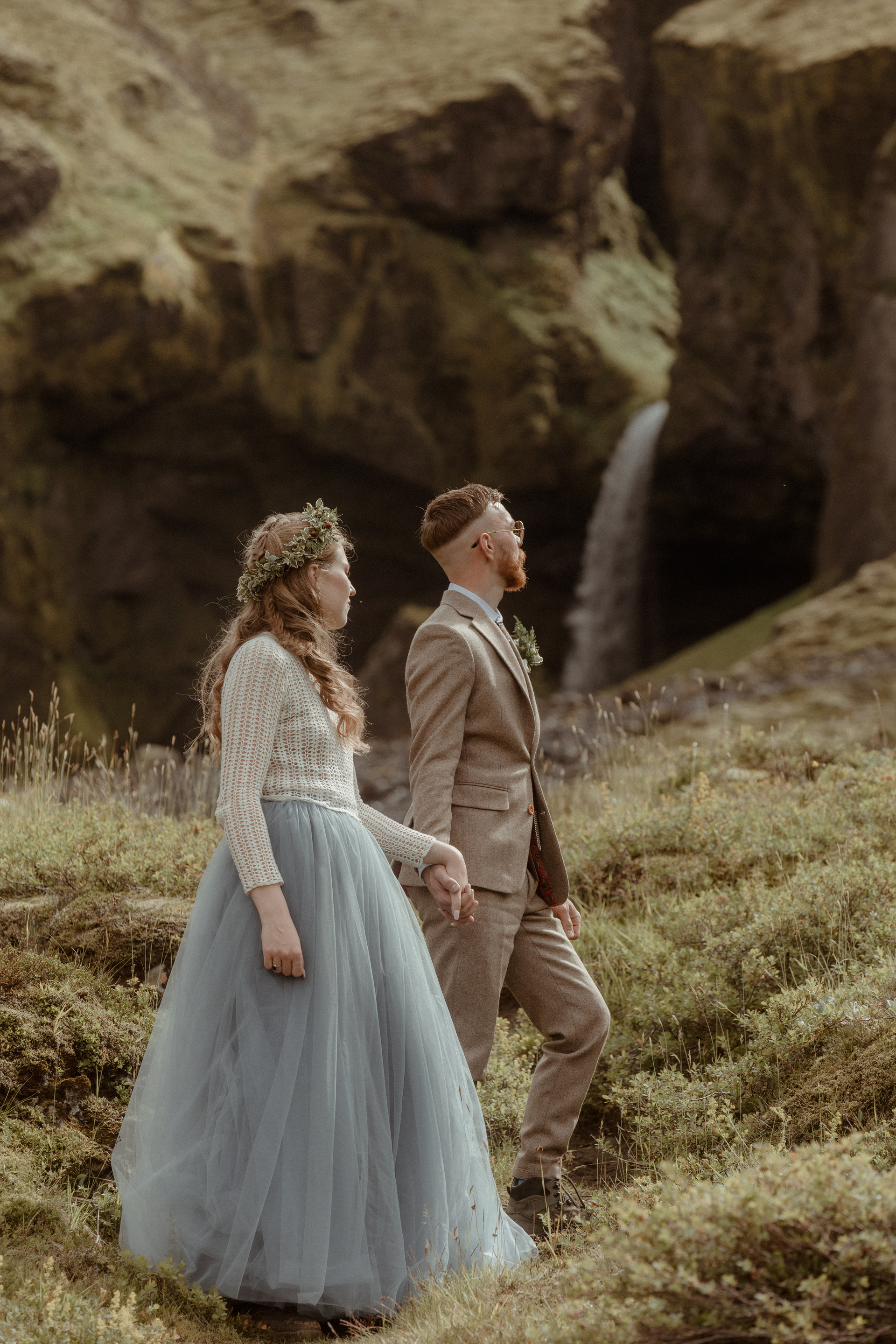 In late July, when the roads to the highlands of Iceland are open, imagine embarking on an enchanting journey. A couple, full of love and adventure, did just that! They traveled by jeep, exploring Iceland’s raw beauty and looking for perfect place for wedding photoshoot. Their first discovery was a hidden waterfall in a secluded forest, a serene spot perfect for intimate moments and reflection.