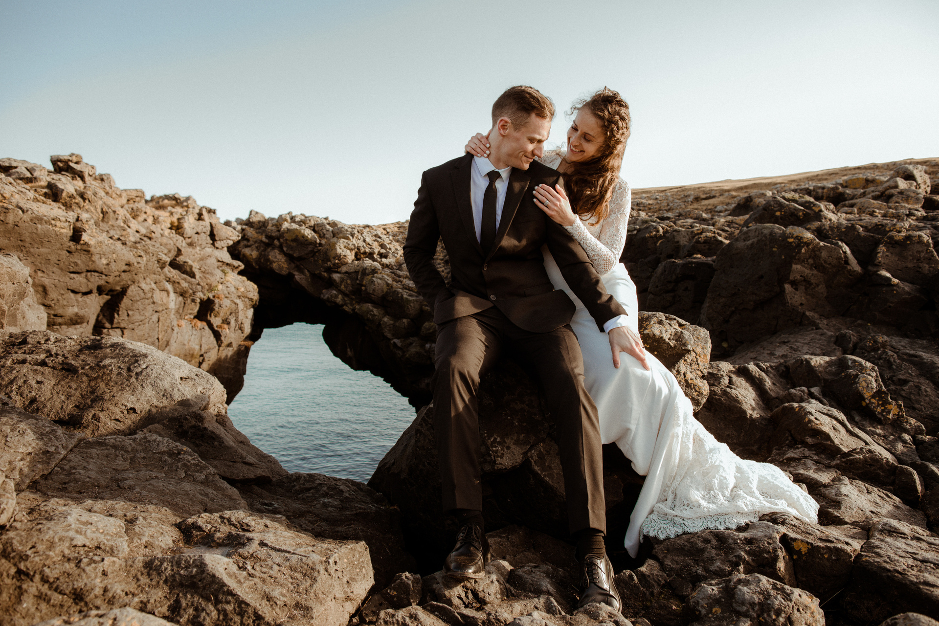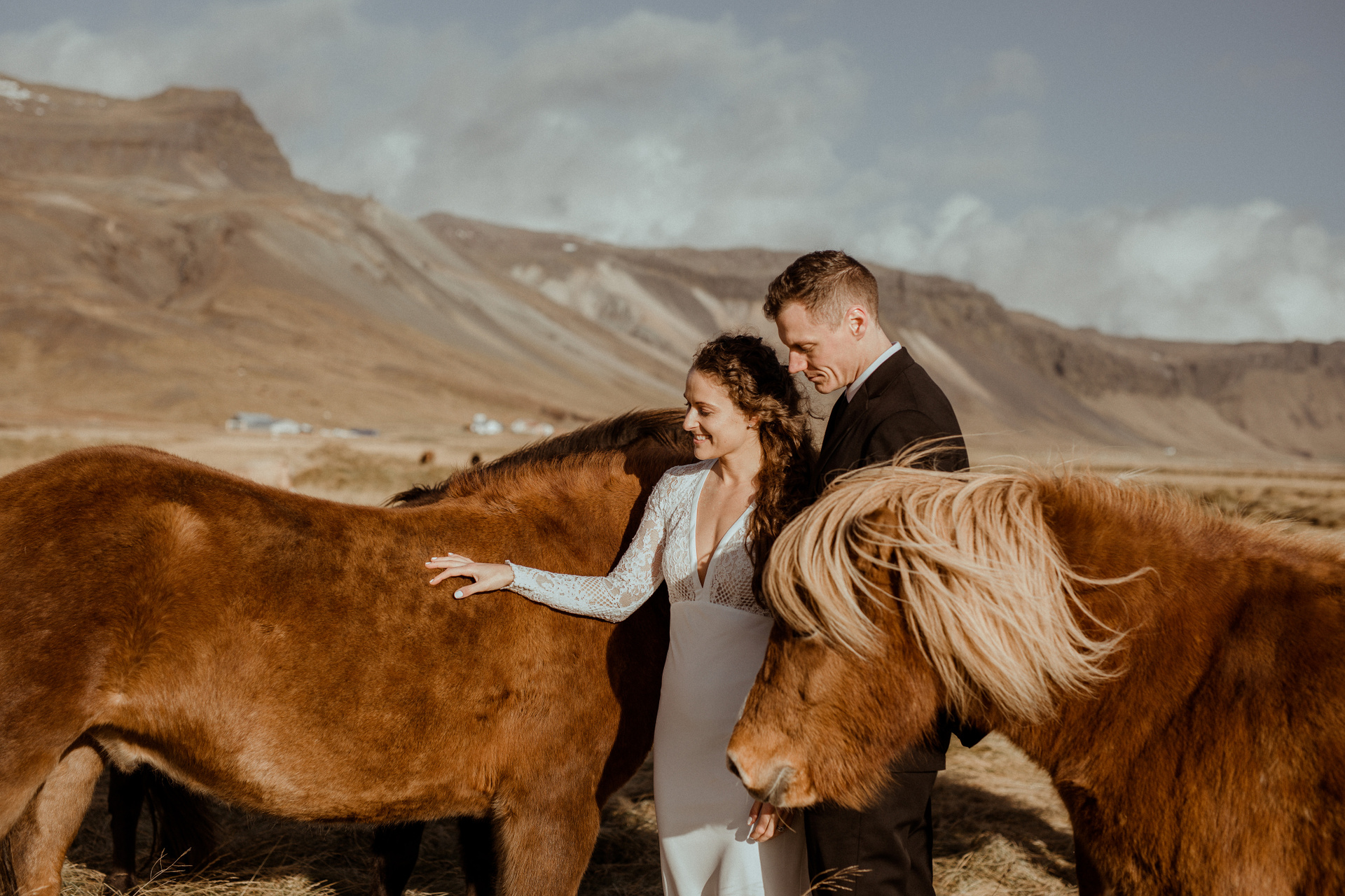 The adventure continued across the Snaeffelsness Peninsula. This part of their journey was marked by wonderful encounters, including wedding photos with Icelandic horses at a local farm and a visit to an awe-inspiring stone bridge.