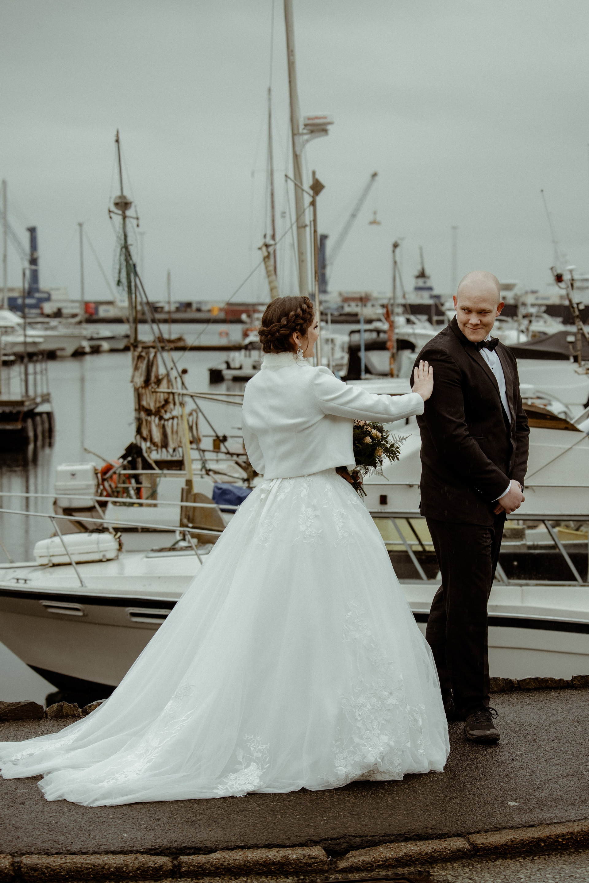 Wedding day started in Tórshavn, the capital of the Faroe Islands. They took their first look by the harbor, where the calm sea and colorful houses made for a peaceful and romantic scene. Starting the day off right, just the two of them and their daughter, taking in all the fun that was to come.