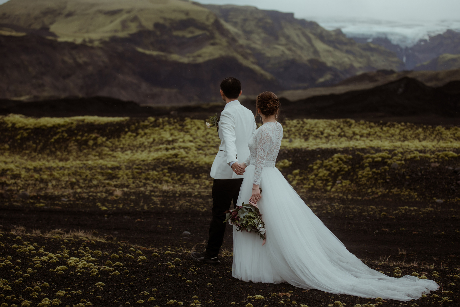 The couple had a dream to elope on a glacier in Iceland, so they embarked on an adventure of a lifetime with a private tour guide in a super jeep. The journey was a thrilling ride and set the tone for an unforgettable day. They were driving trough the field of the black sand, enjoyed view of mountains covered by moss. At the area was filmed Game of Thrones!