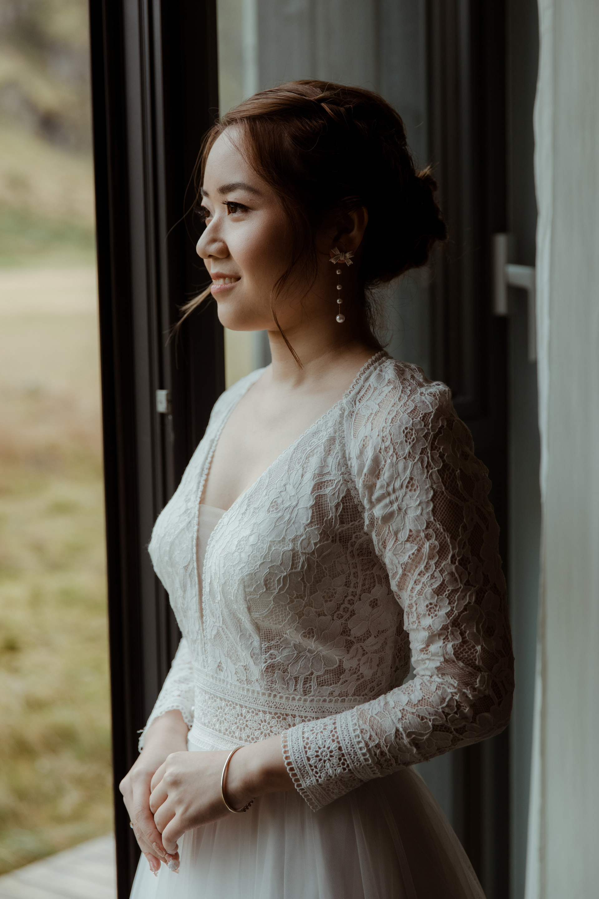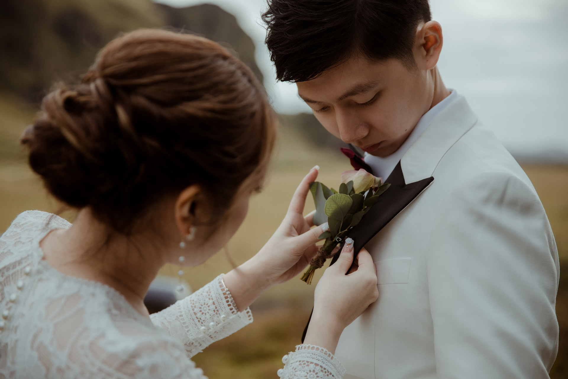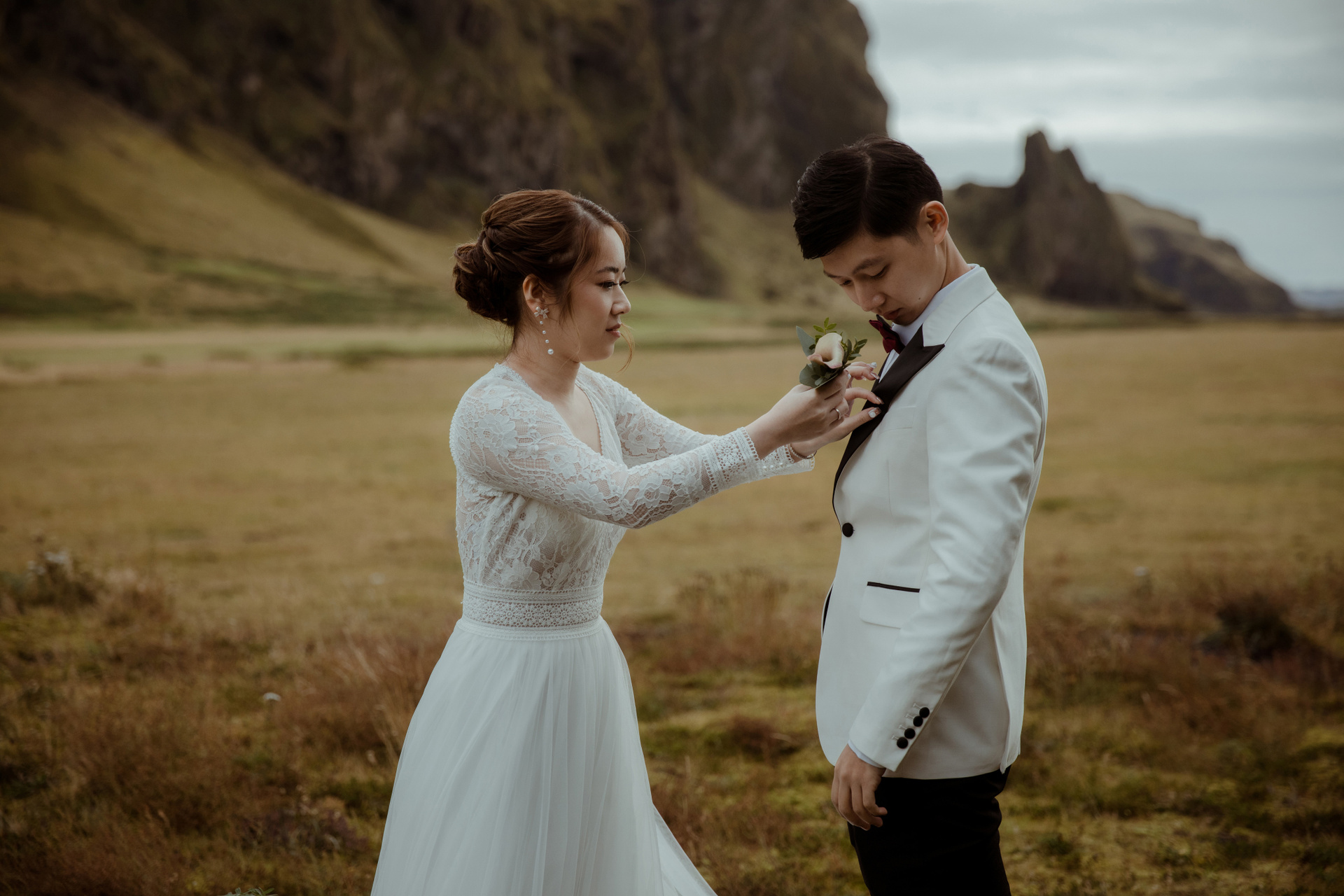 Their day started with getting ready moments in their hotel room. As the hotel in Vik was surrounded by mountains it gave them perfect backdrop for the first look.