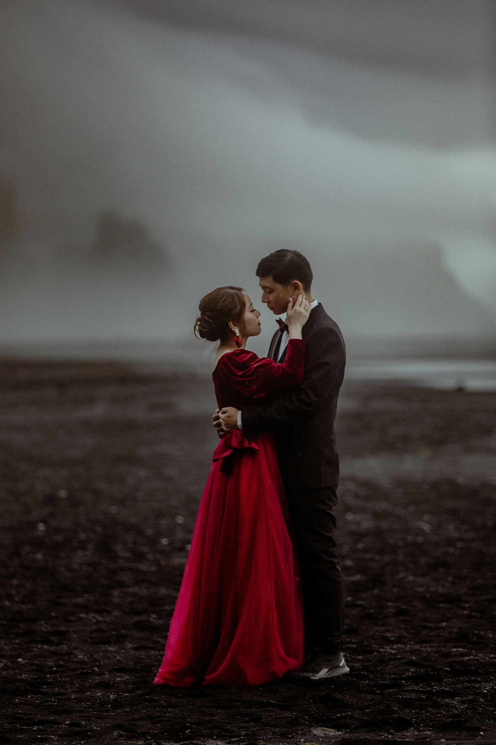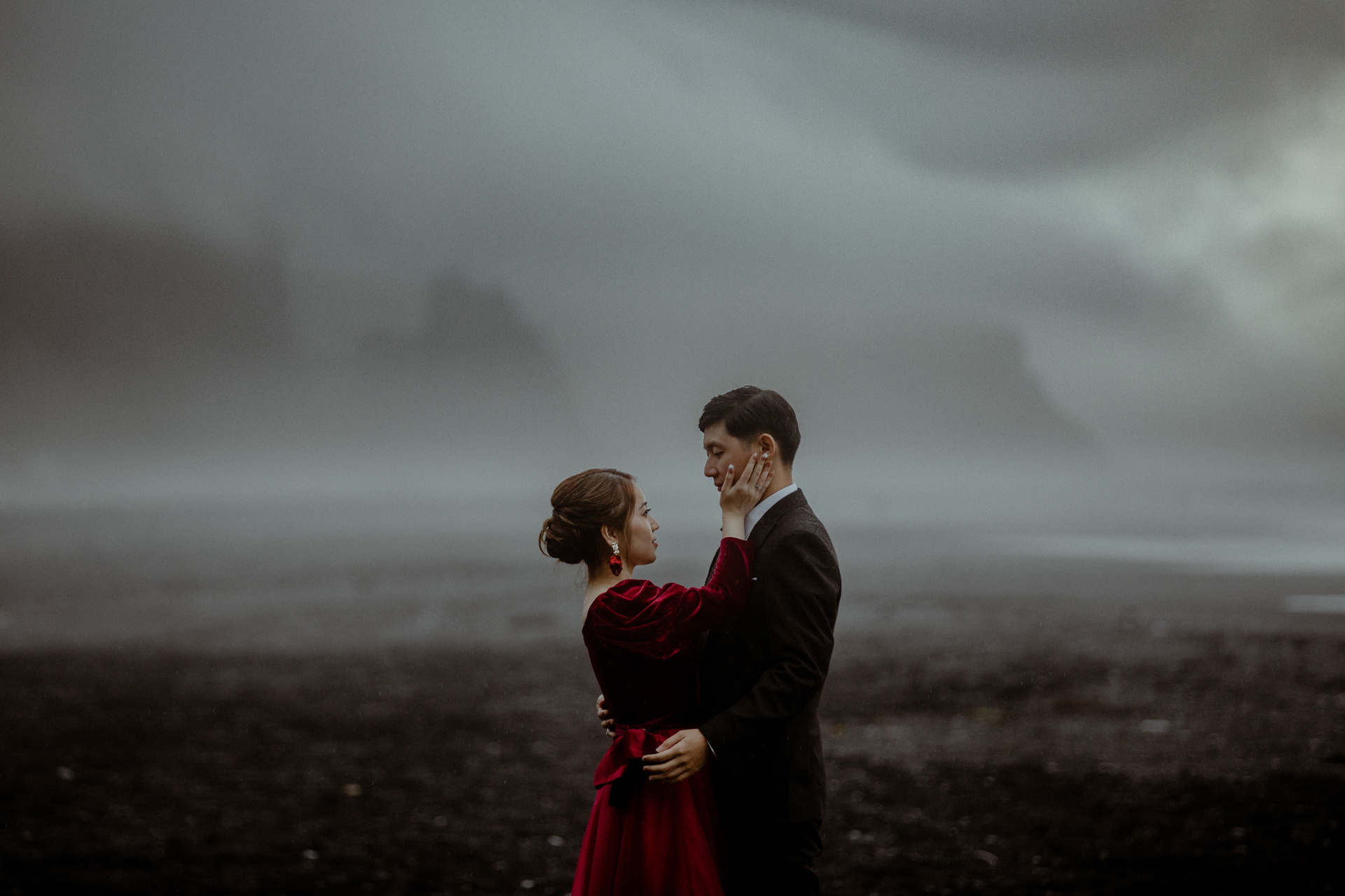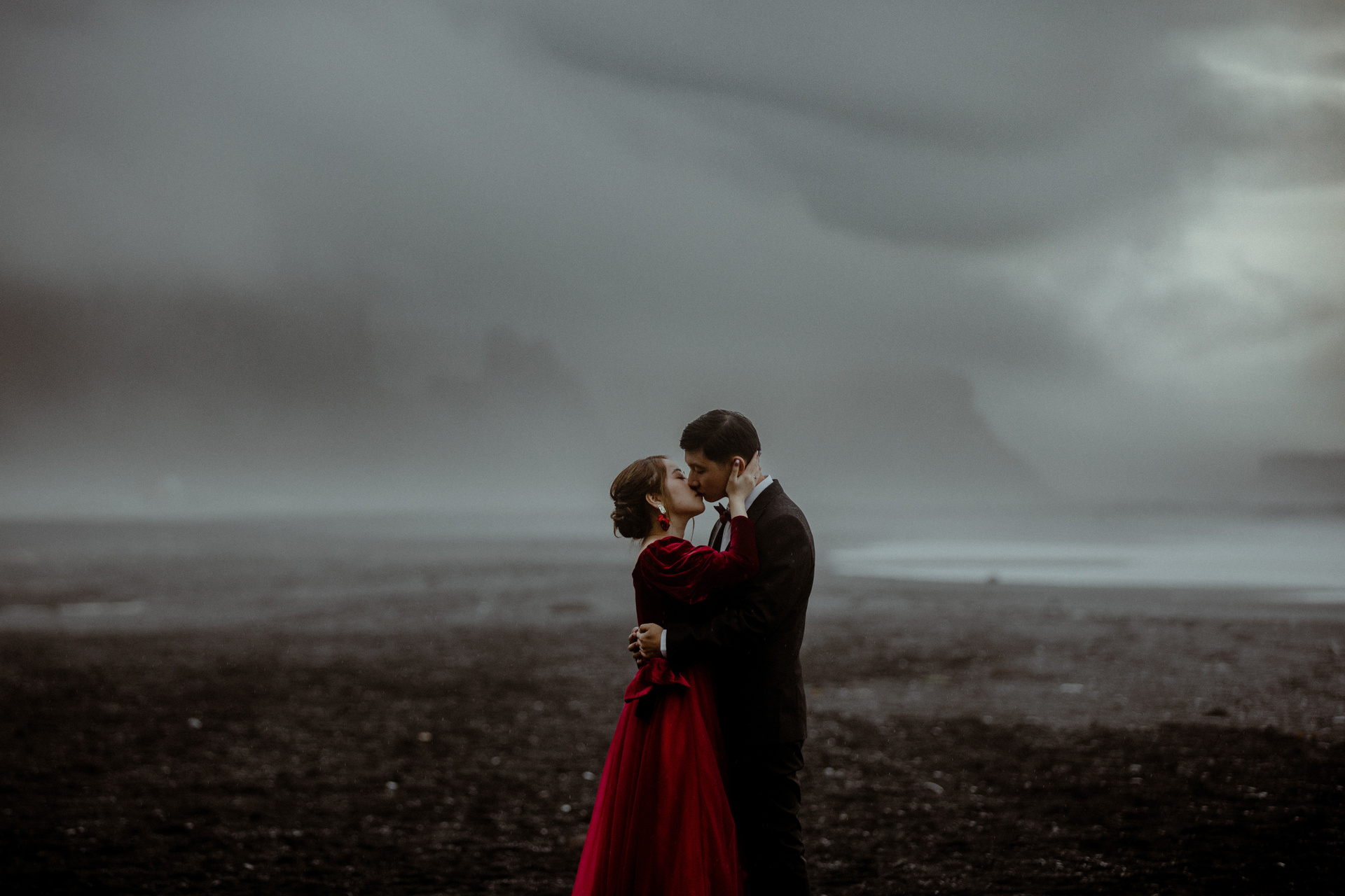After a needed break we took them for more dramatic Iceland wedding photos at private black sand beach in Vik. The contrast of the black sand and the wild ocean waves provided a stunning backdrop for the elopement photos! Suddenly the huge cloud came and added even more mysterious mood to the day.
