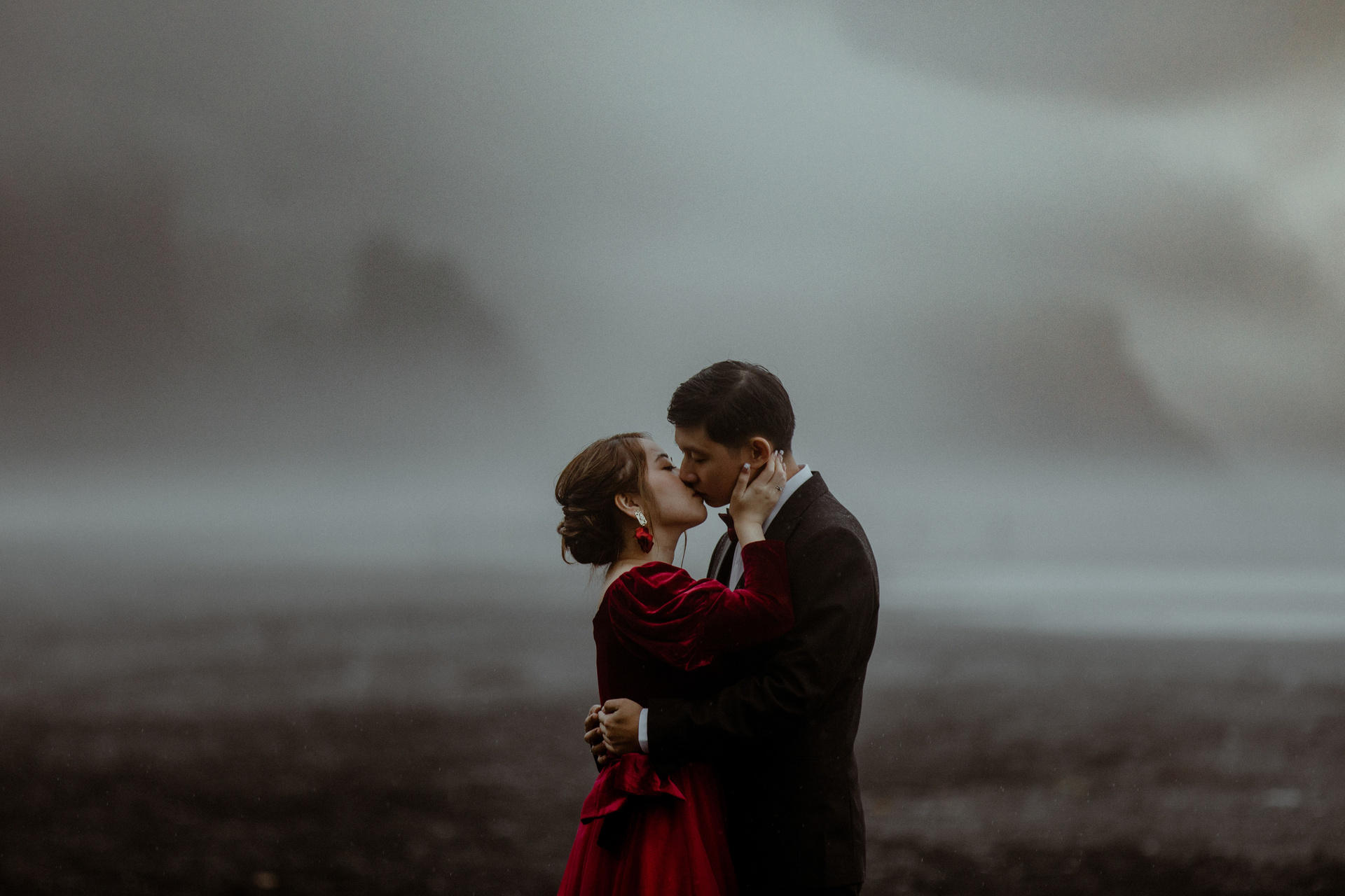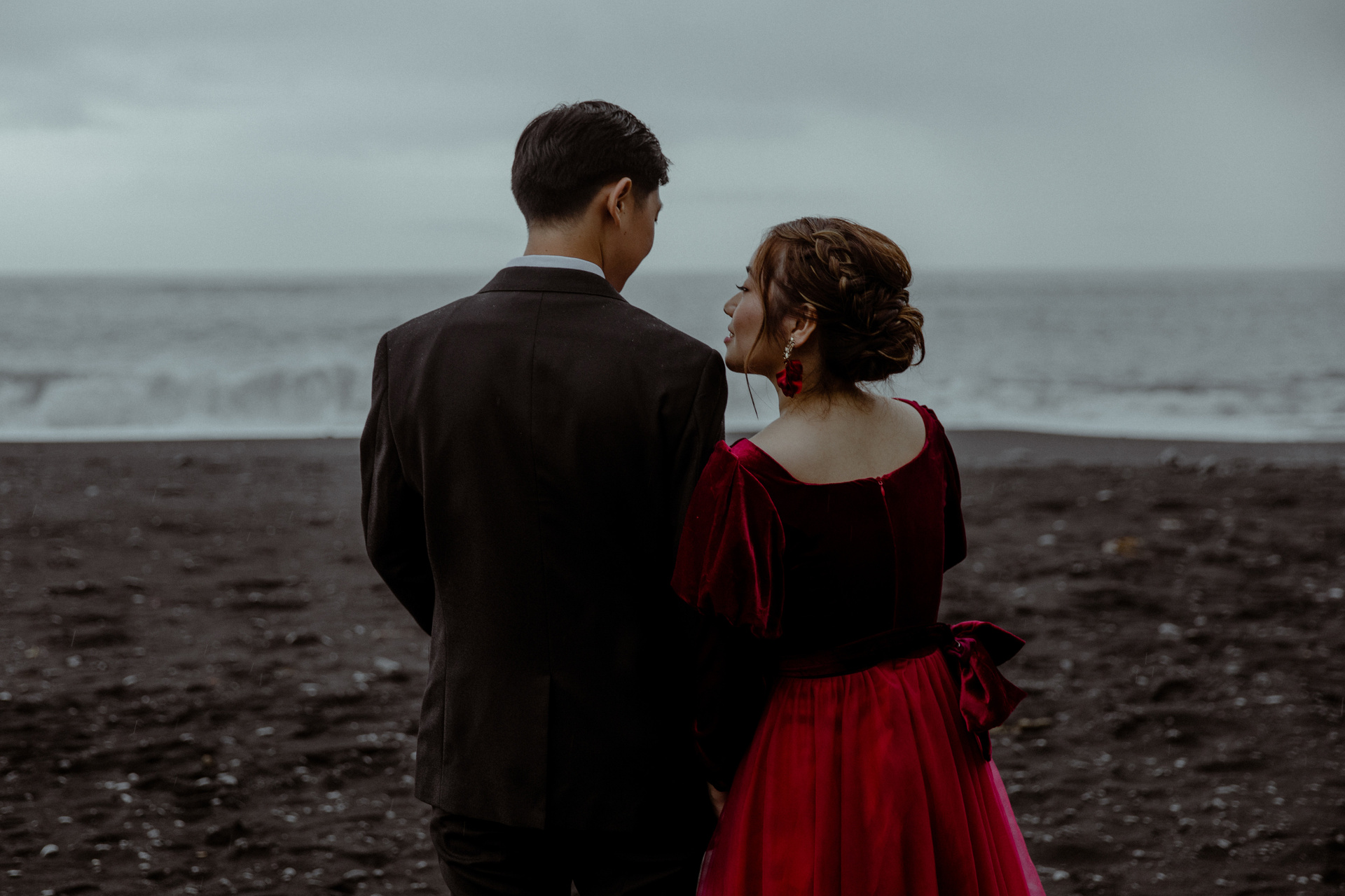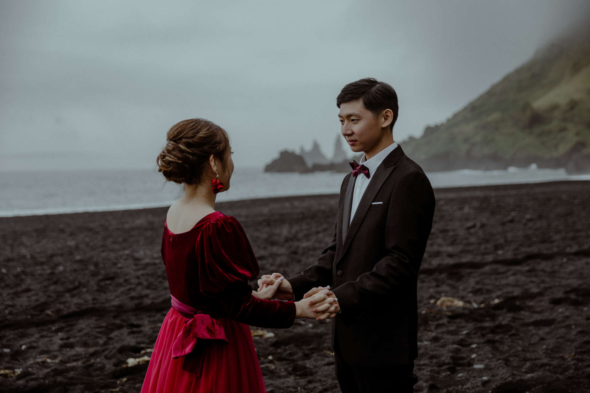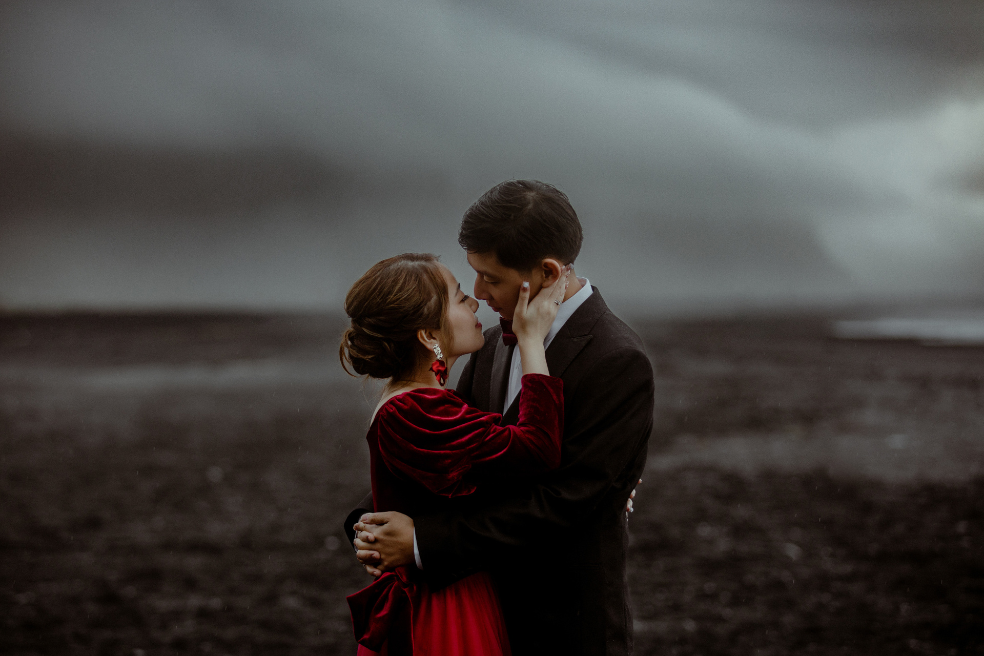 After a needed break we took them for more dramatic Iceland wedding photos at private black sand beach in Vik. The contrast of the black sand and the wild ocean waves provided a stunning backdrop for the elopement photos! Suddenly the huge cloud came and added even more mysterious mood to the day.