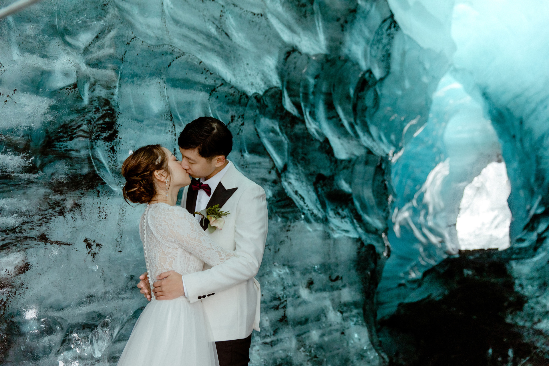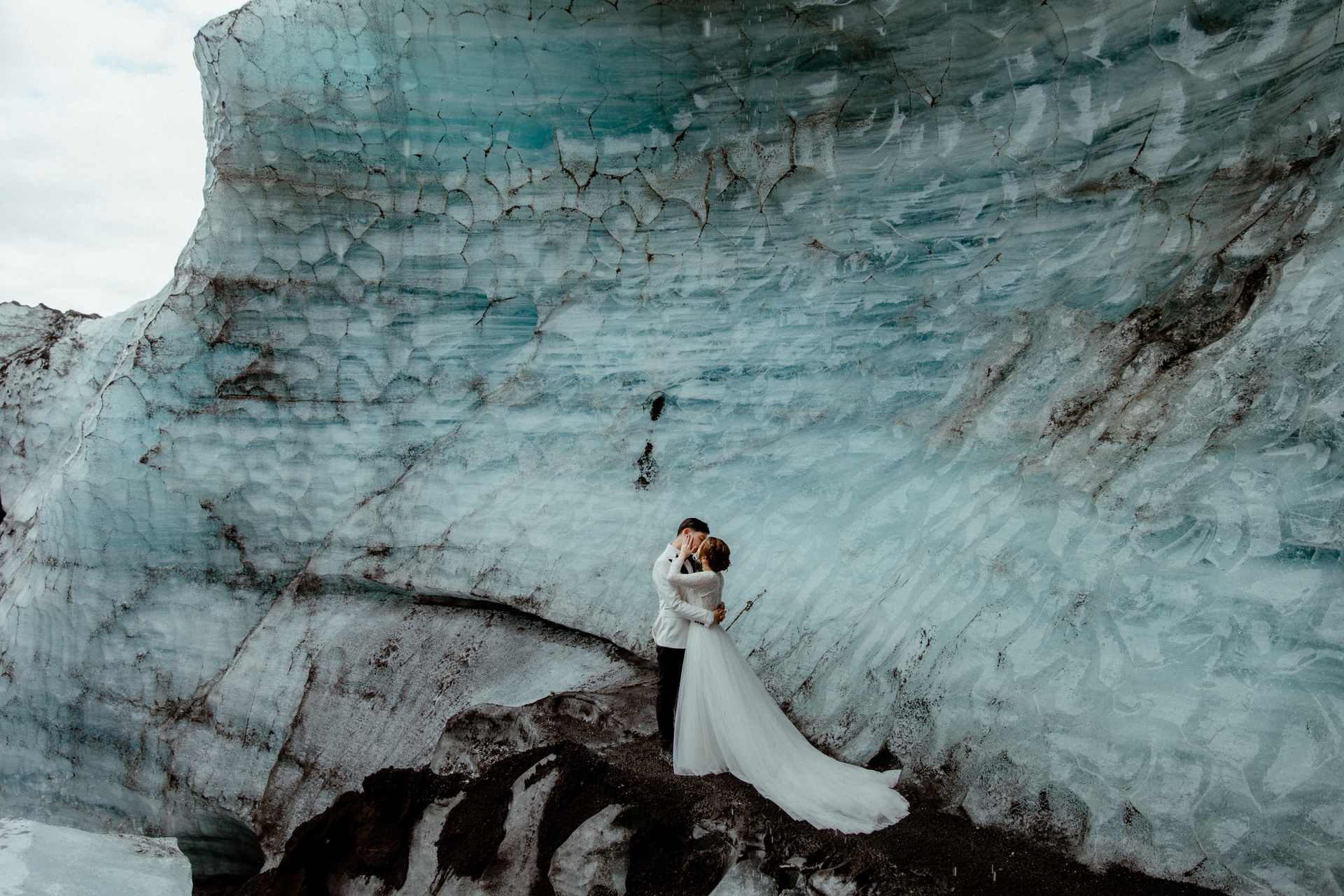 We were so happy capture every moment of this unique and unforgettable glacier elopement in Iceland on the photos and video. After the ceremony, we hiked on a glacier and found another crystal blue ice cave. It was a perfect setting for their ice cave elopement in Iceland.