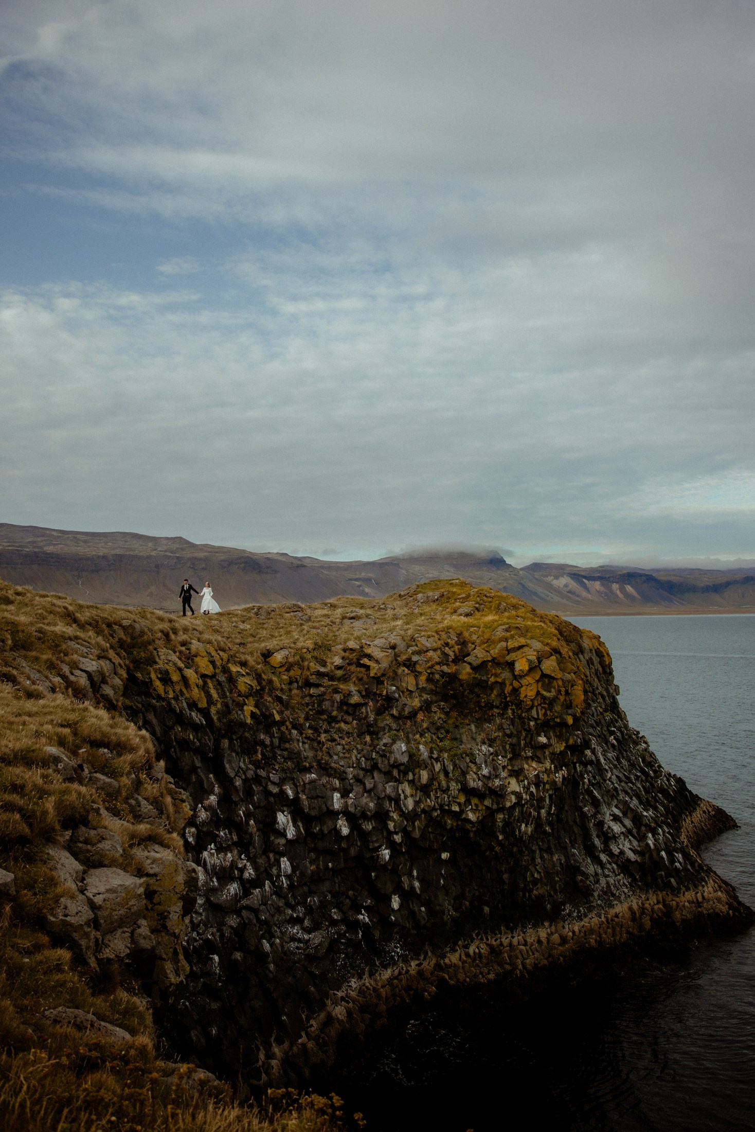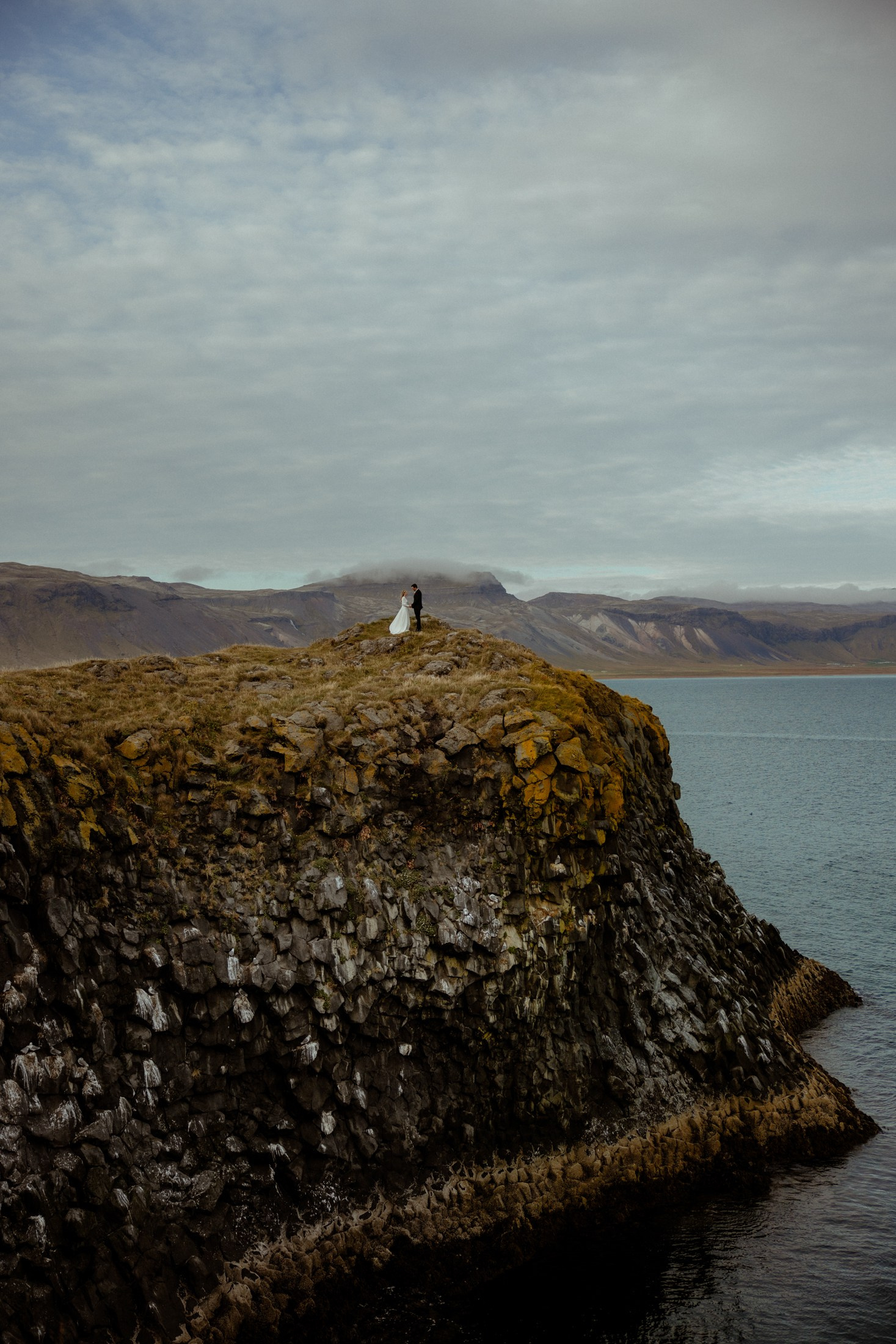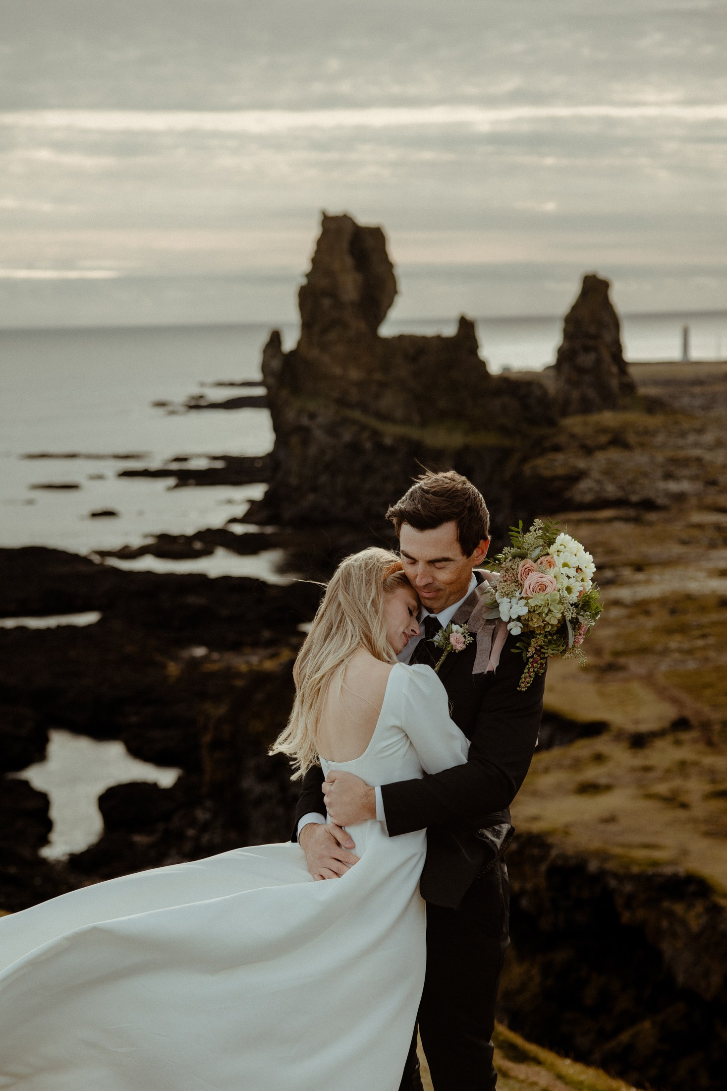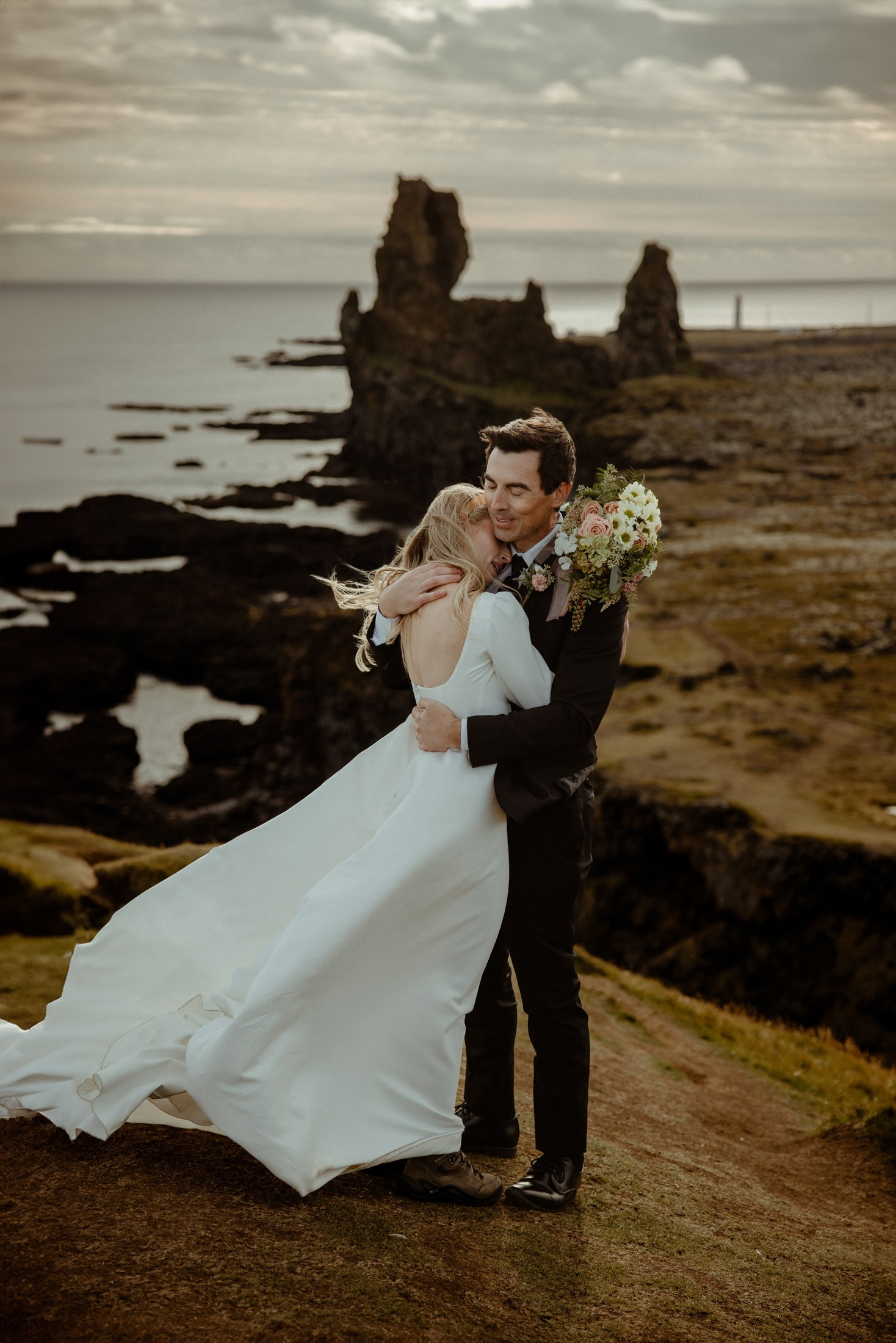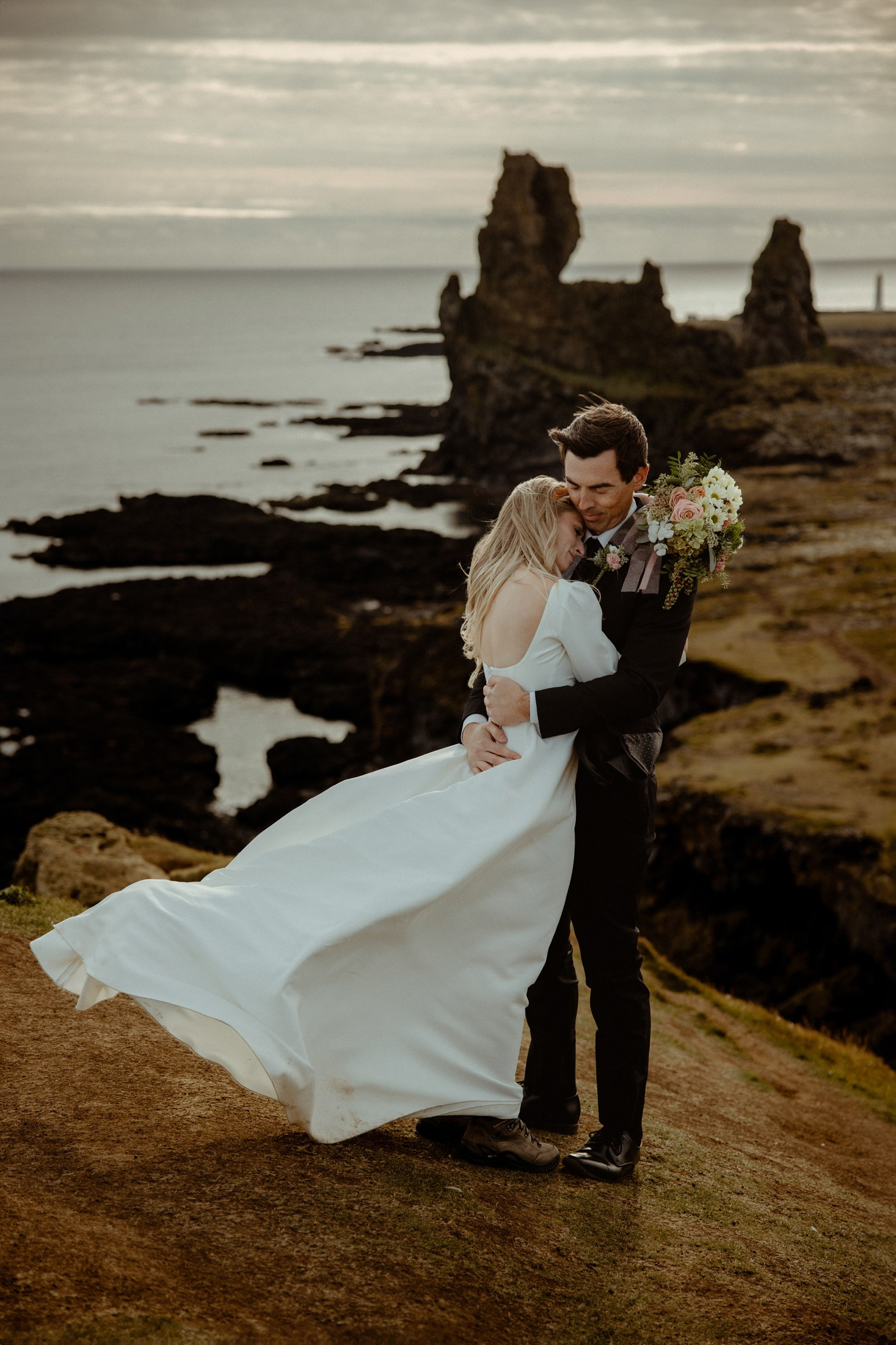 They stood against the wind at Londrangar cliff hugging each other. This is what an Iceland wedding photo should feel like— honest and full of feelings.