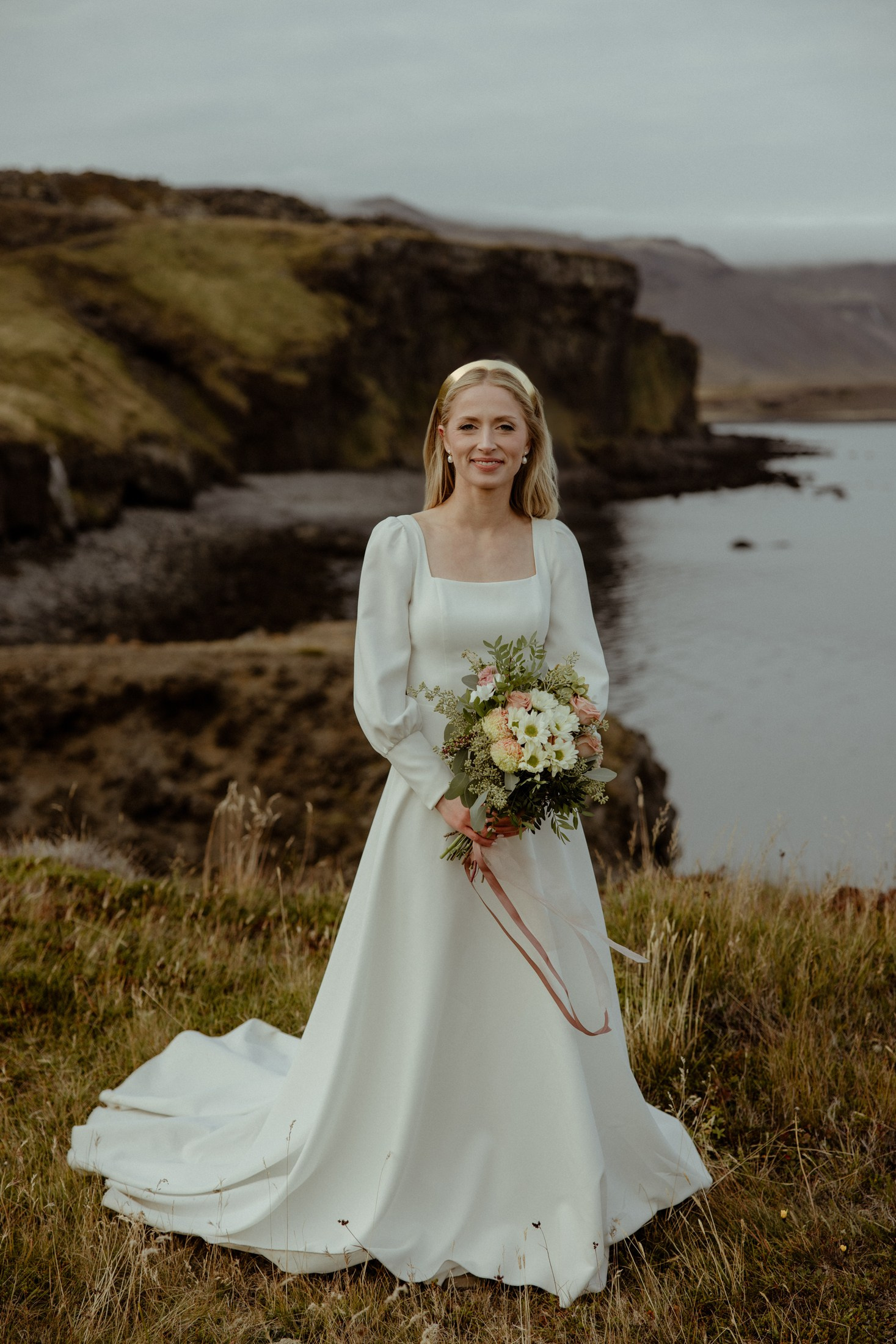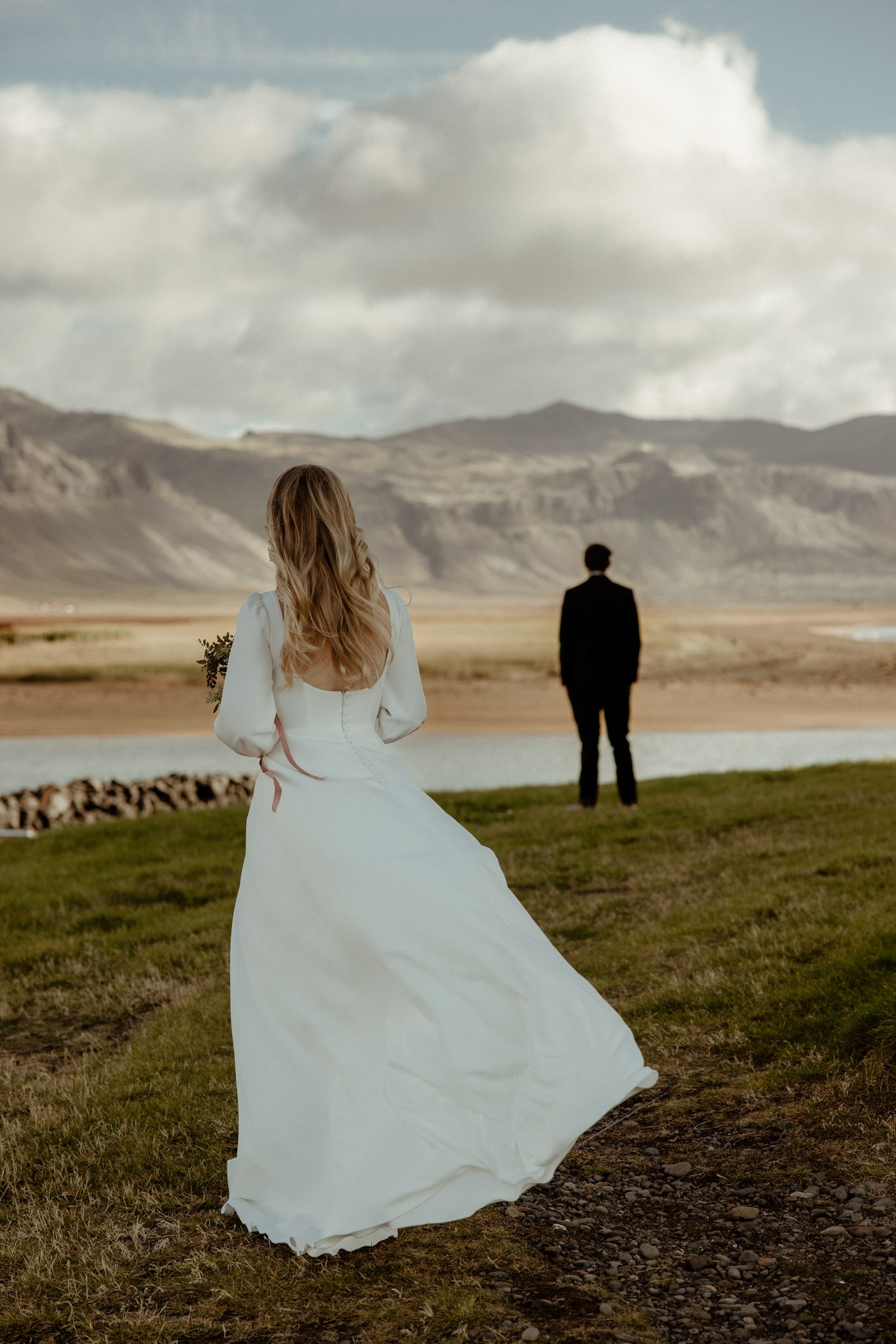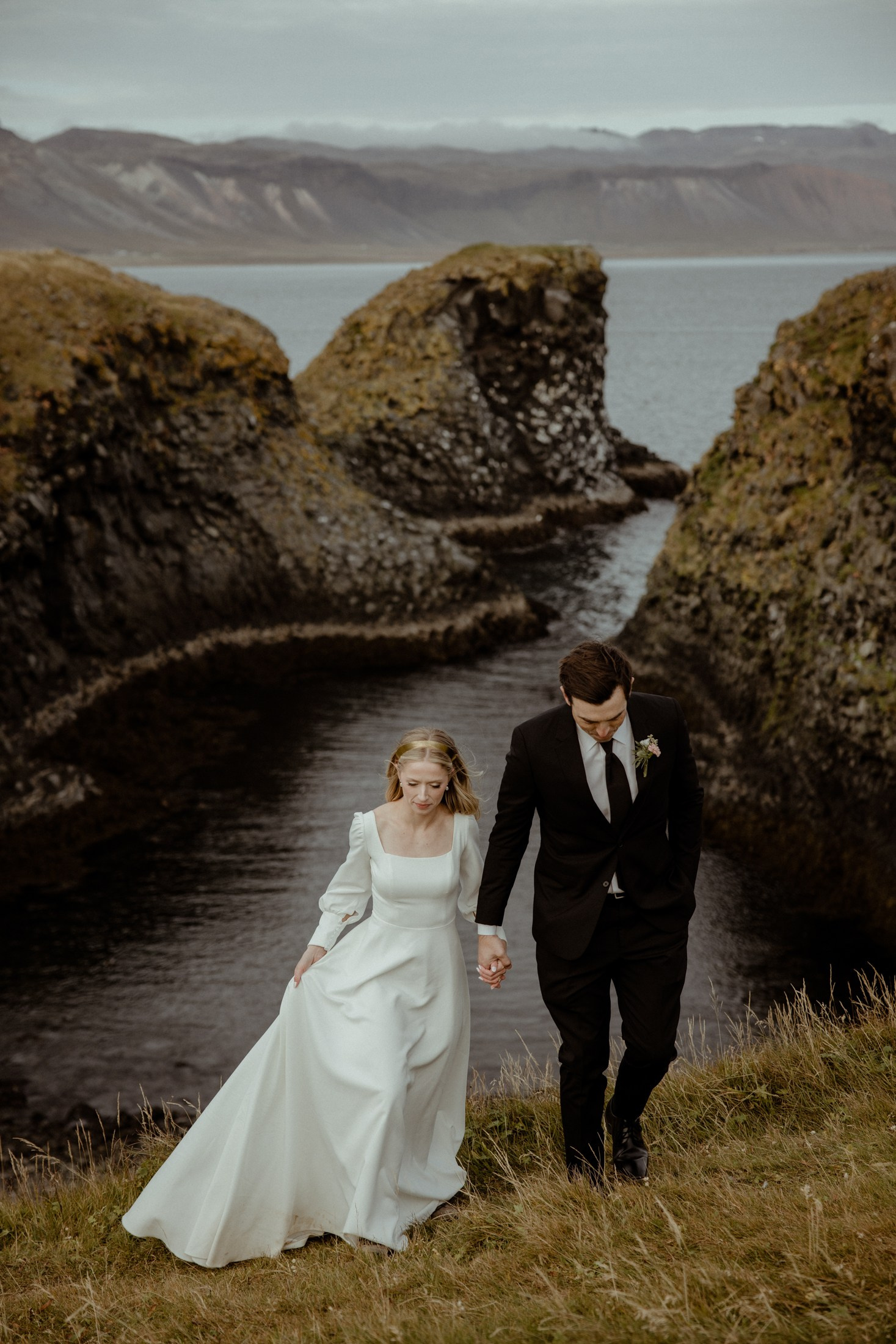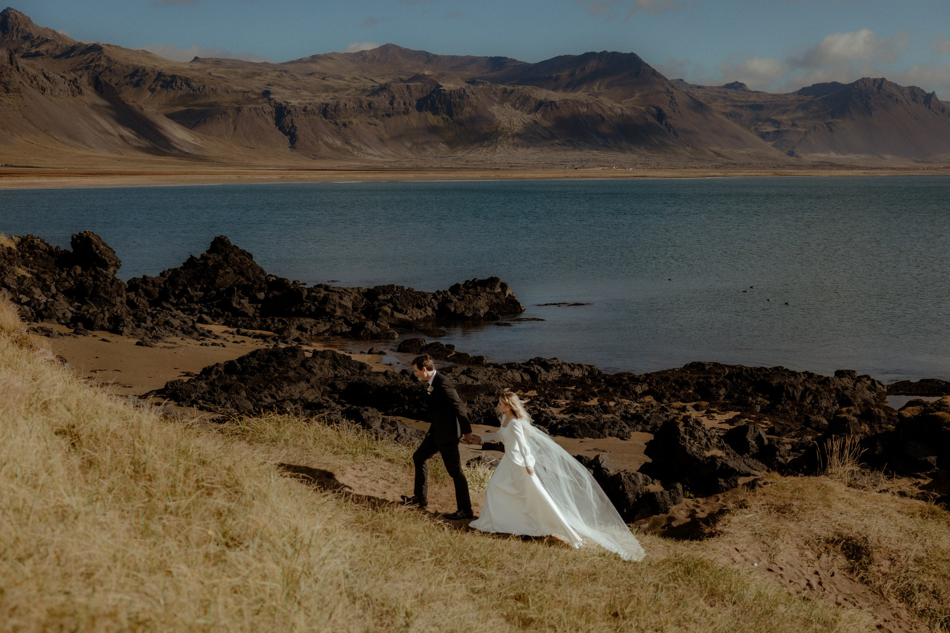 They hiked to a quiet spot with a view of the famous black church. This is a fantastic choice if you are thinking about a Budir black church Iceland wedding; close enough for those dramatic shots, but secluded enough for a truly intimate ceremony.