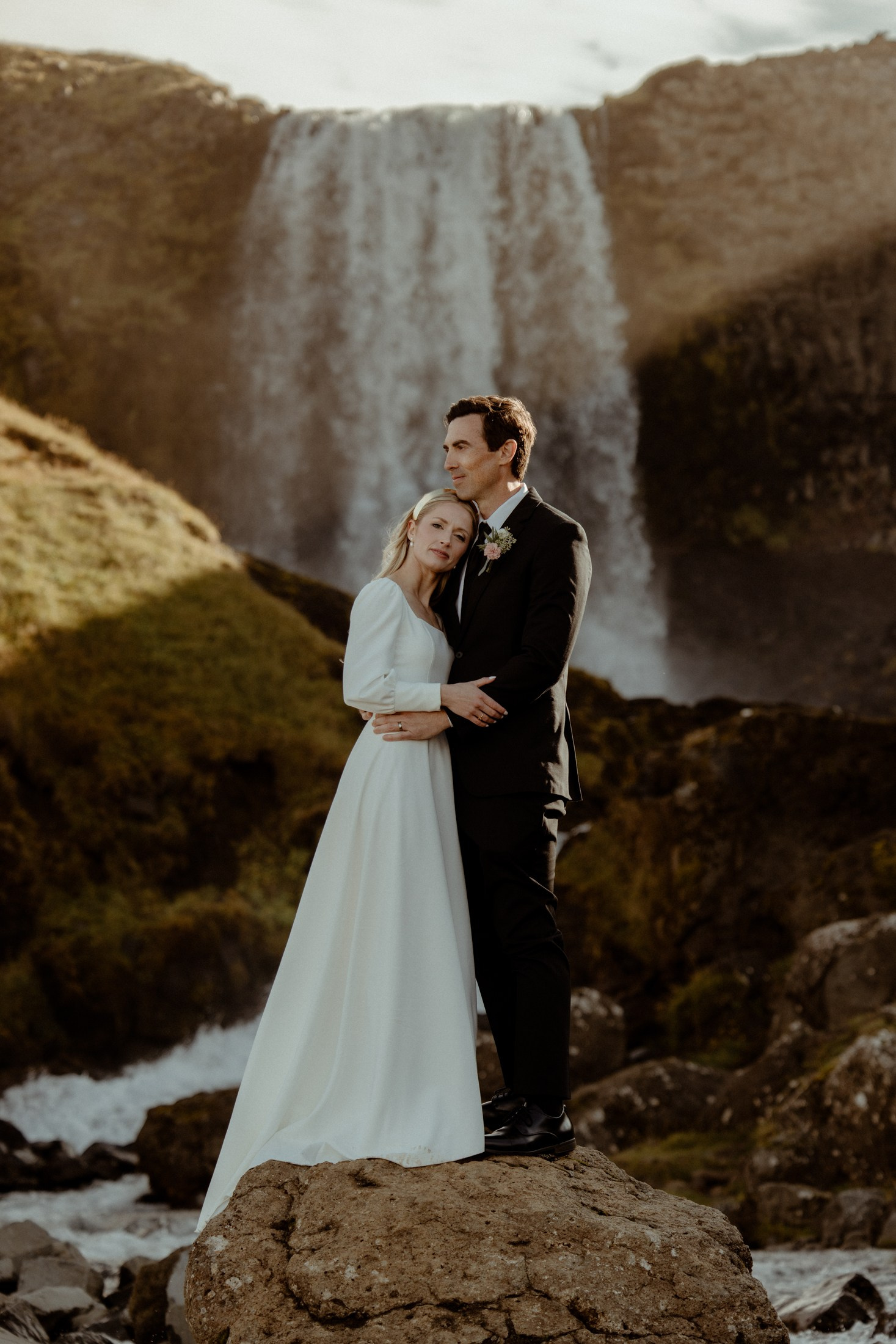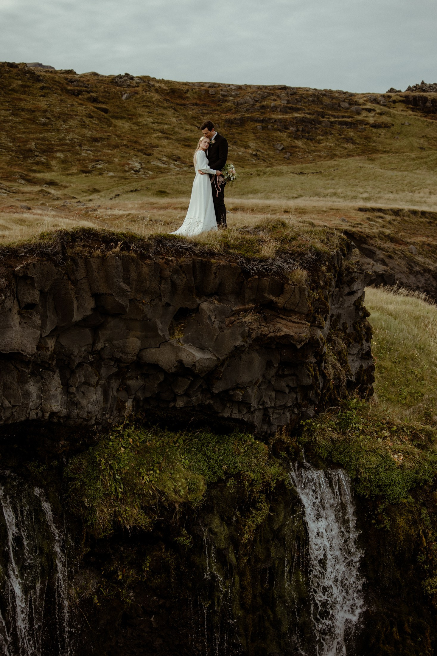 They ended their Iceland elopement day at a hidden spot —a cliffside above a waterfall. It felt unreal, like the world had stopped just for them. Perfect setting for epic Iceland wedding photoshoot.