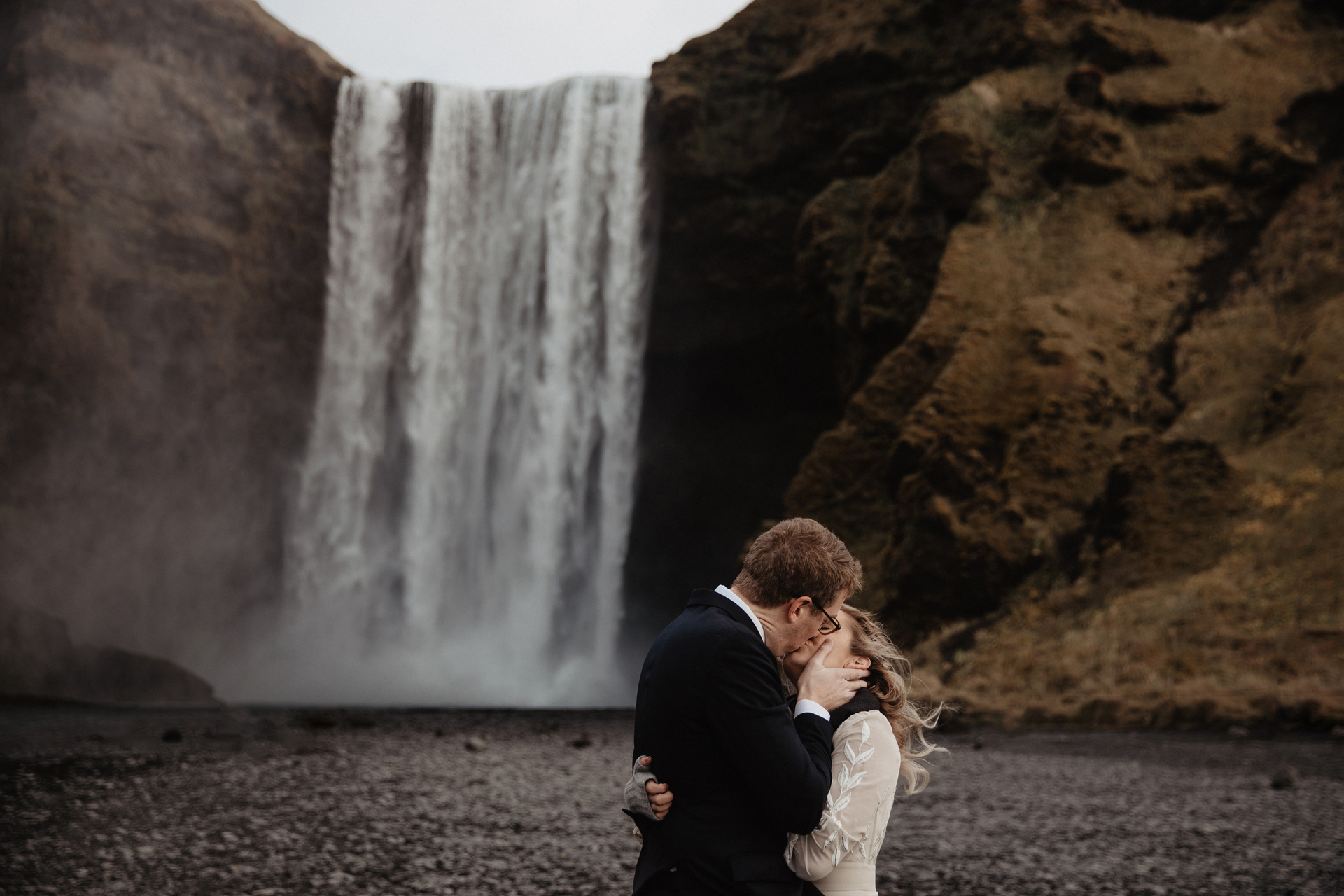 The morning began with a gathering in a cozy Scandinavian-style Icelandic apartment, where, while the bride was preparing, the groom finished writing the last words in his oath. After that, we drove along Iceland’s South Coast and stopped to take photos in amazing places along the road. Of course, we took photos next to the stunning and majestic Skogafoss waterfall, its height reaches 60 meters!