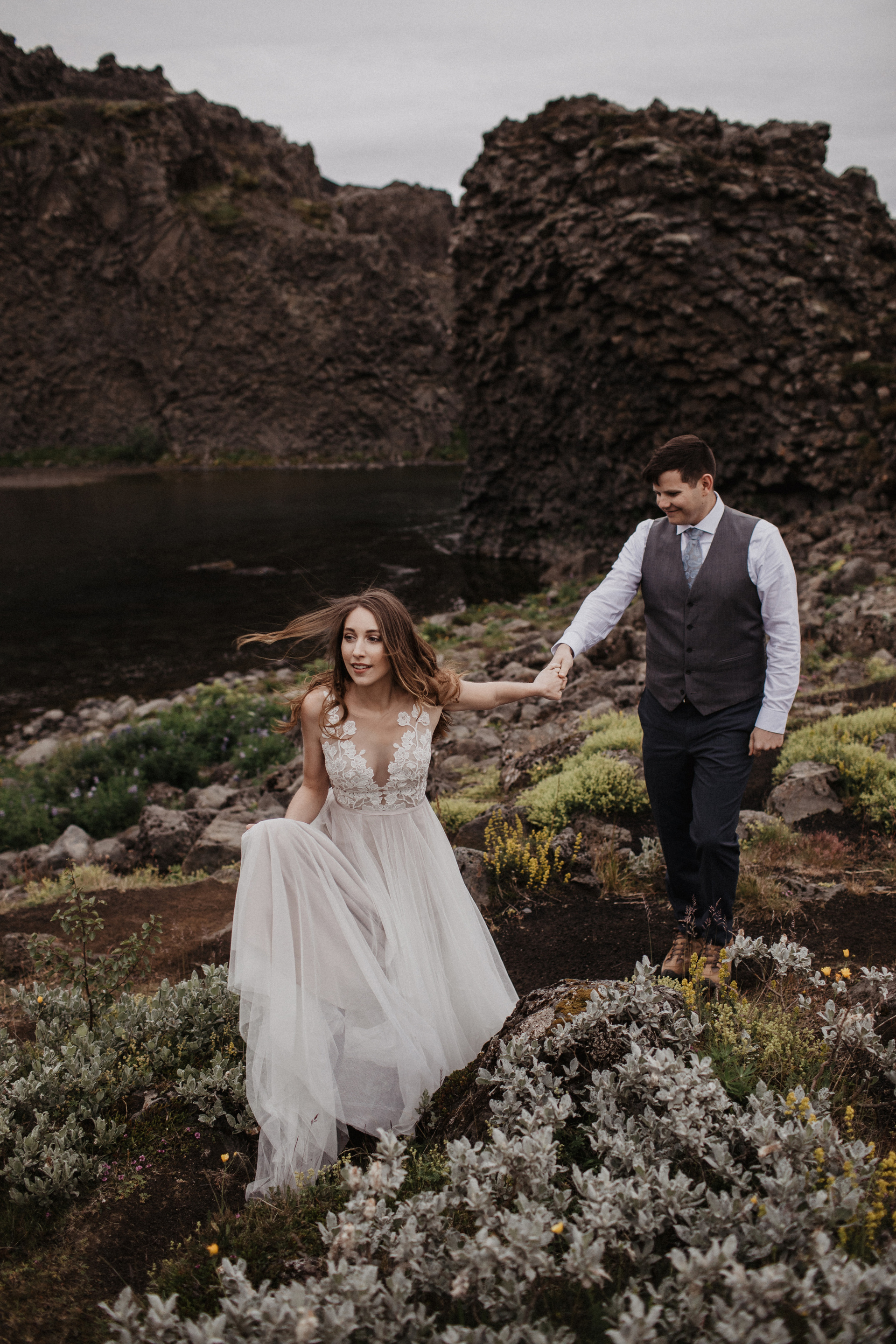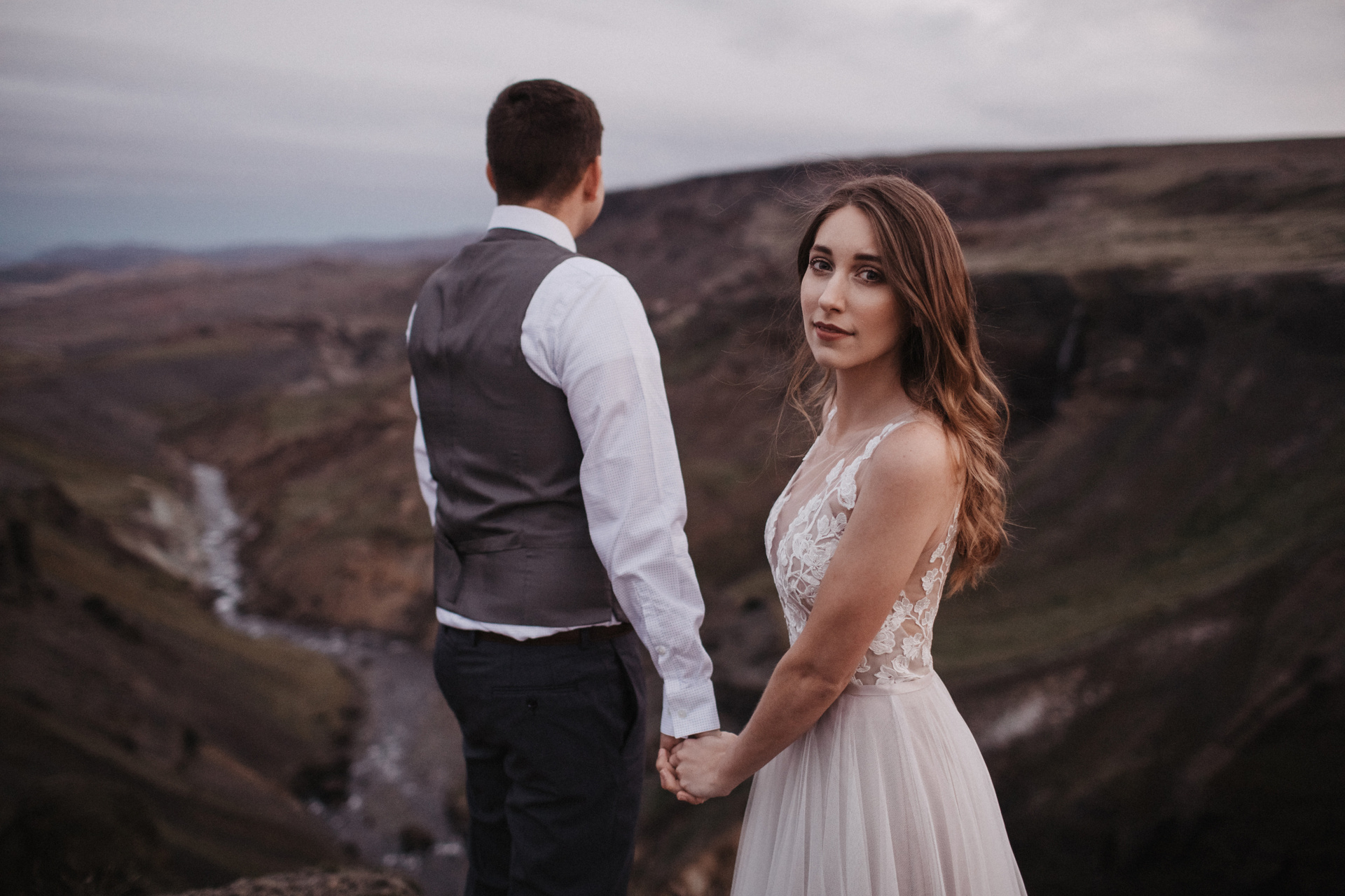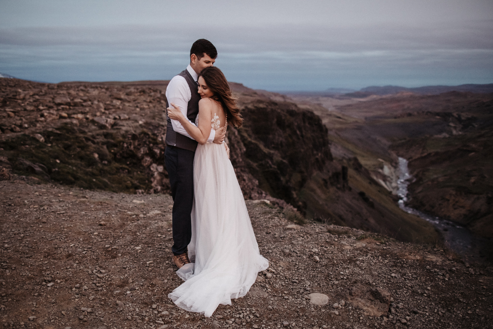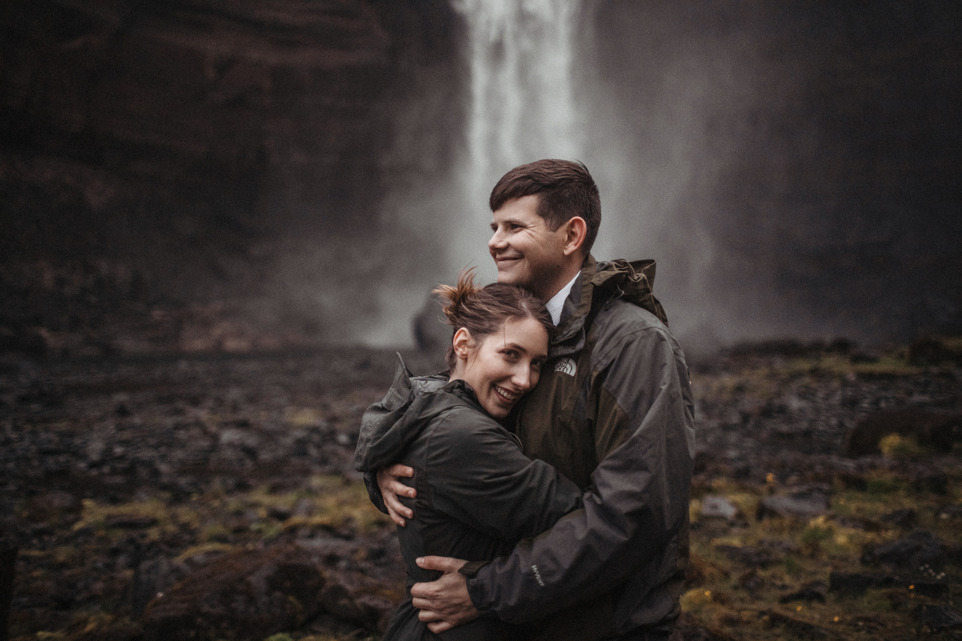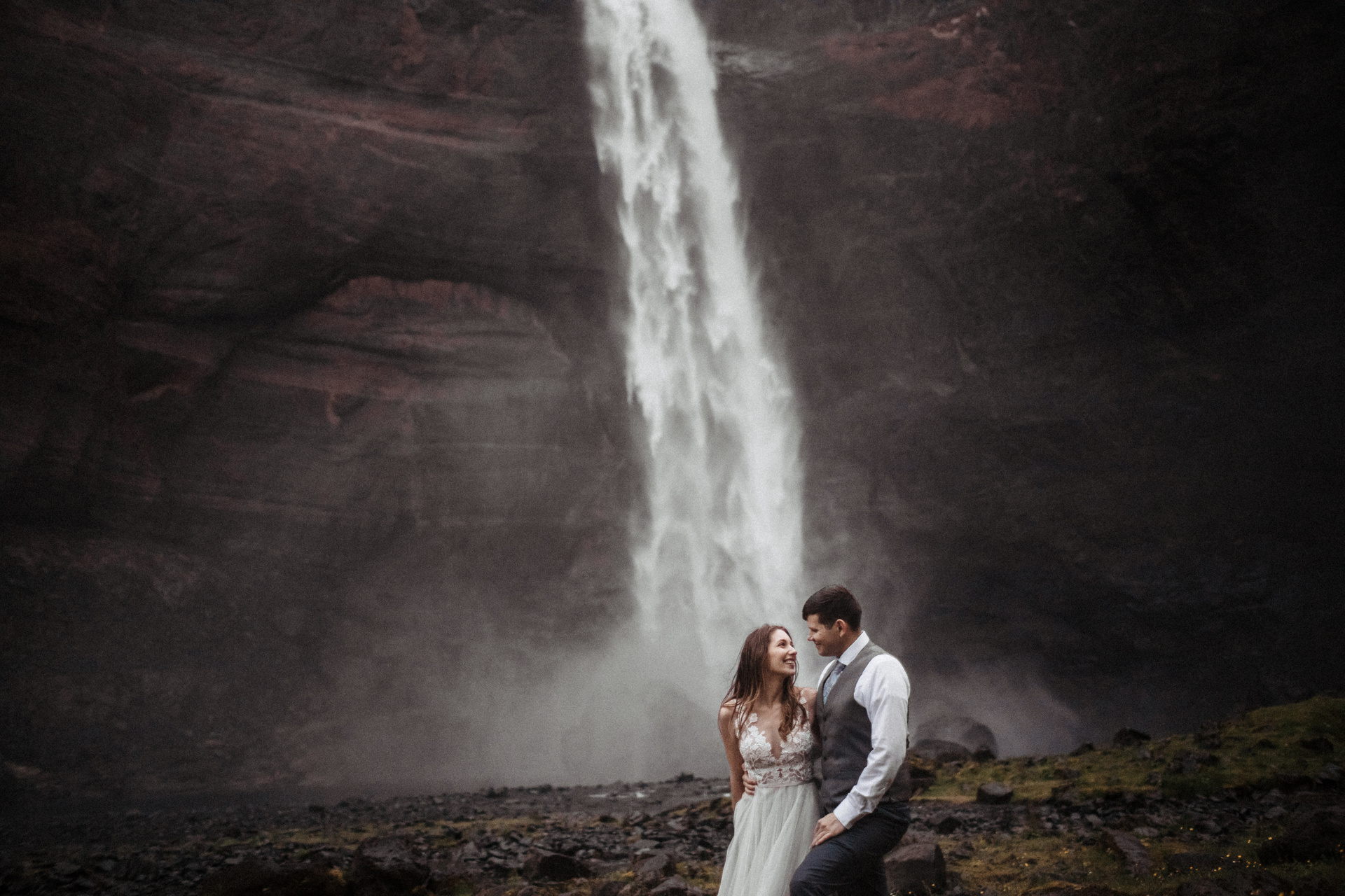 Their adventure elopement in Iceland led them on a moonlit journey to the breathtaking Haifoss Waterfall. As they stood in front of this towering natural wonder, the night’s mist and the thunderous sound of the waterfall enveloped them, marking an exhilarating and memorable start to their lifelong journey together.