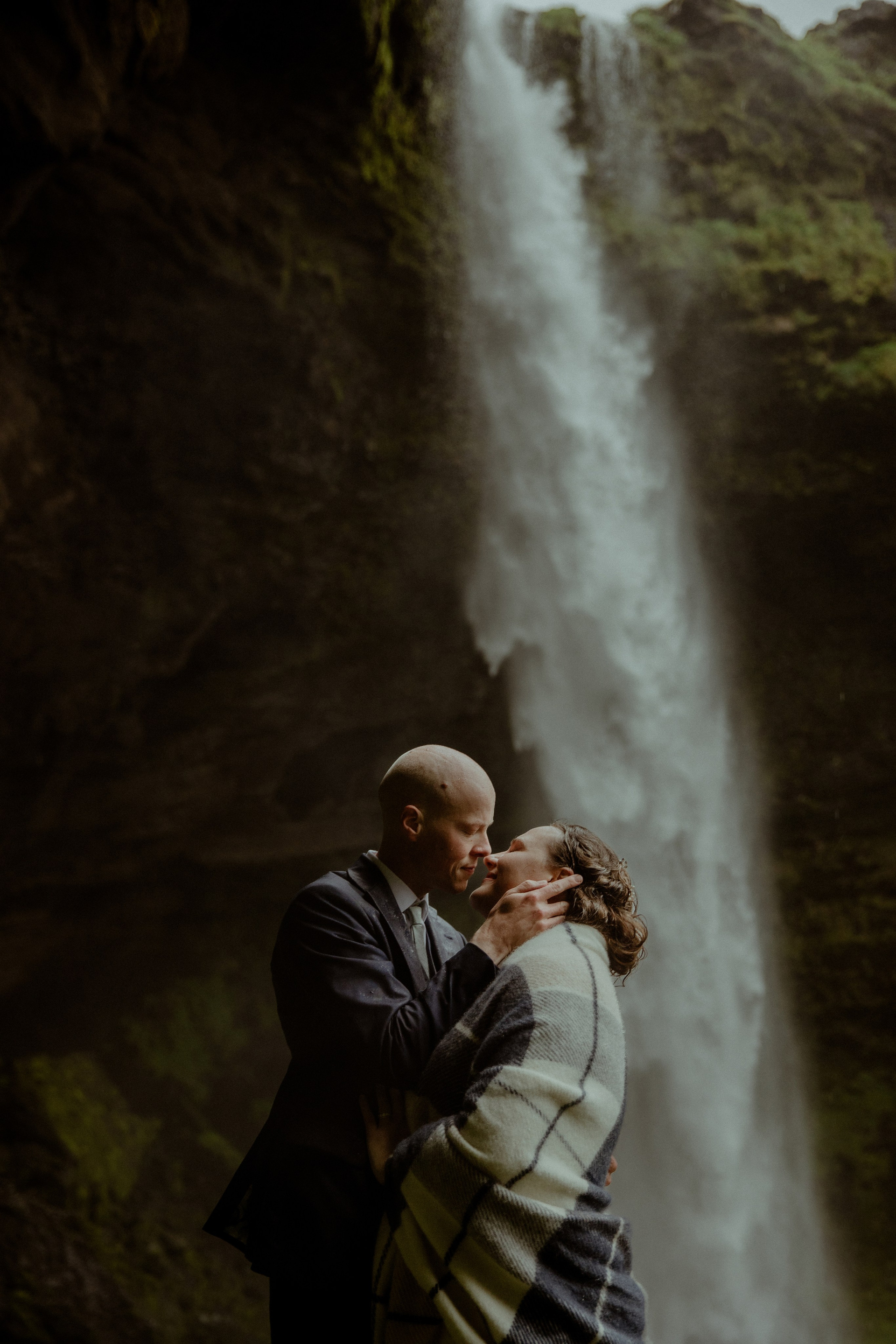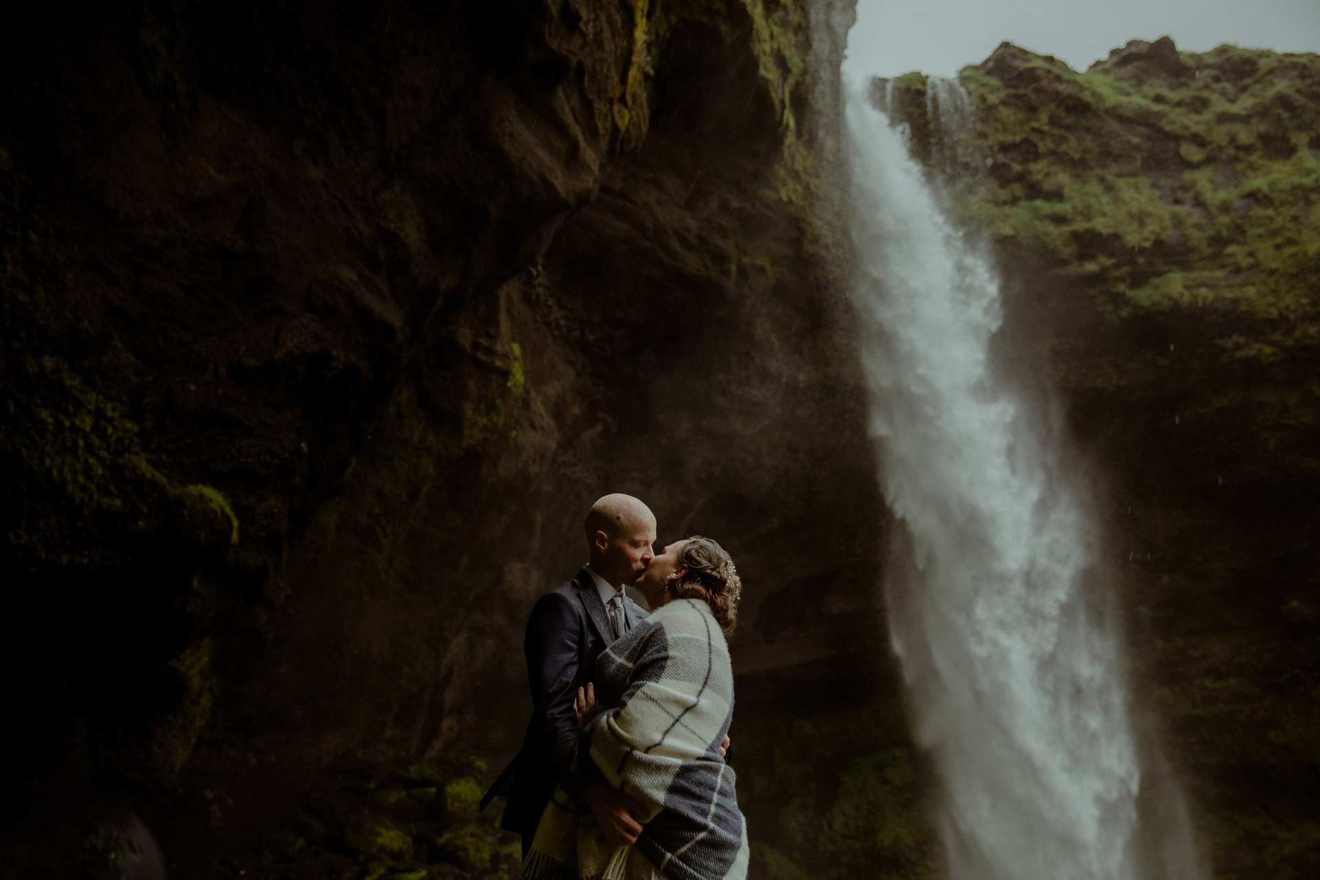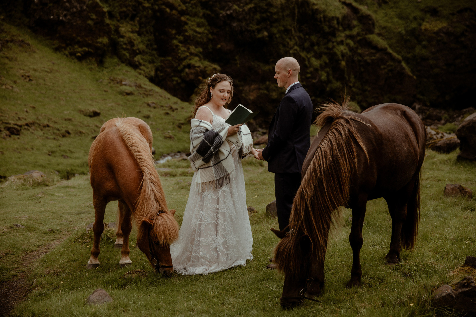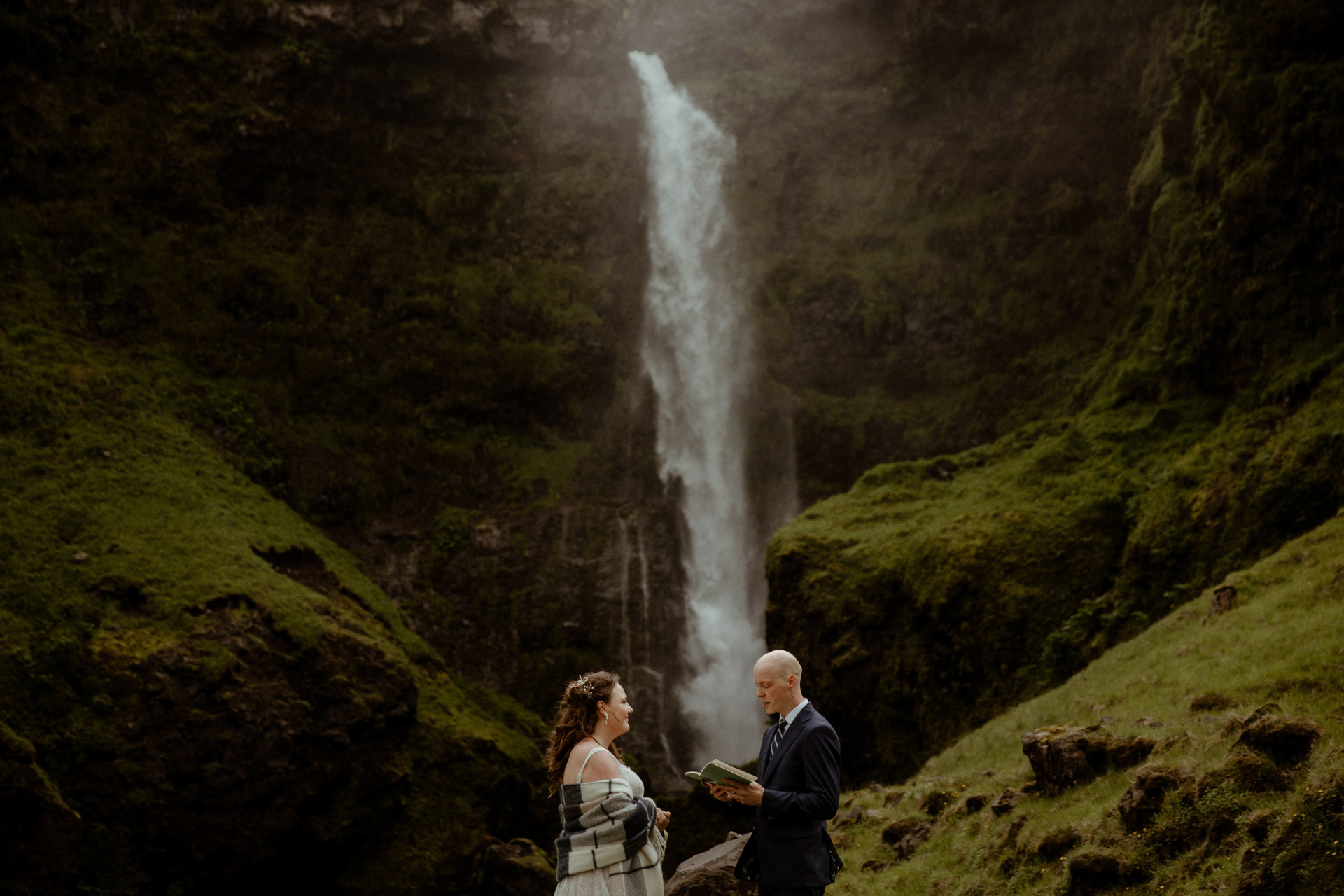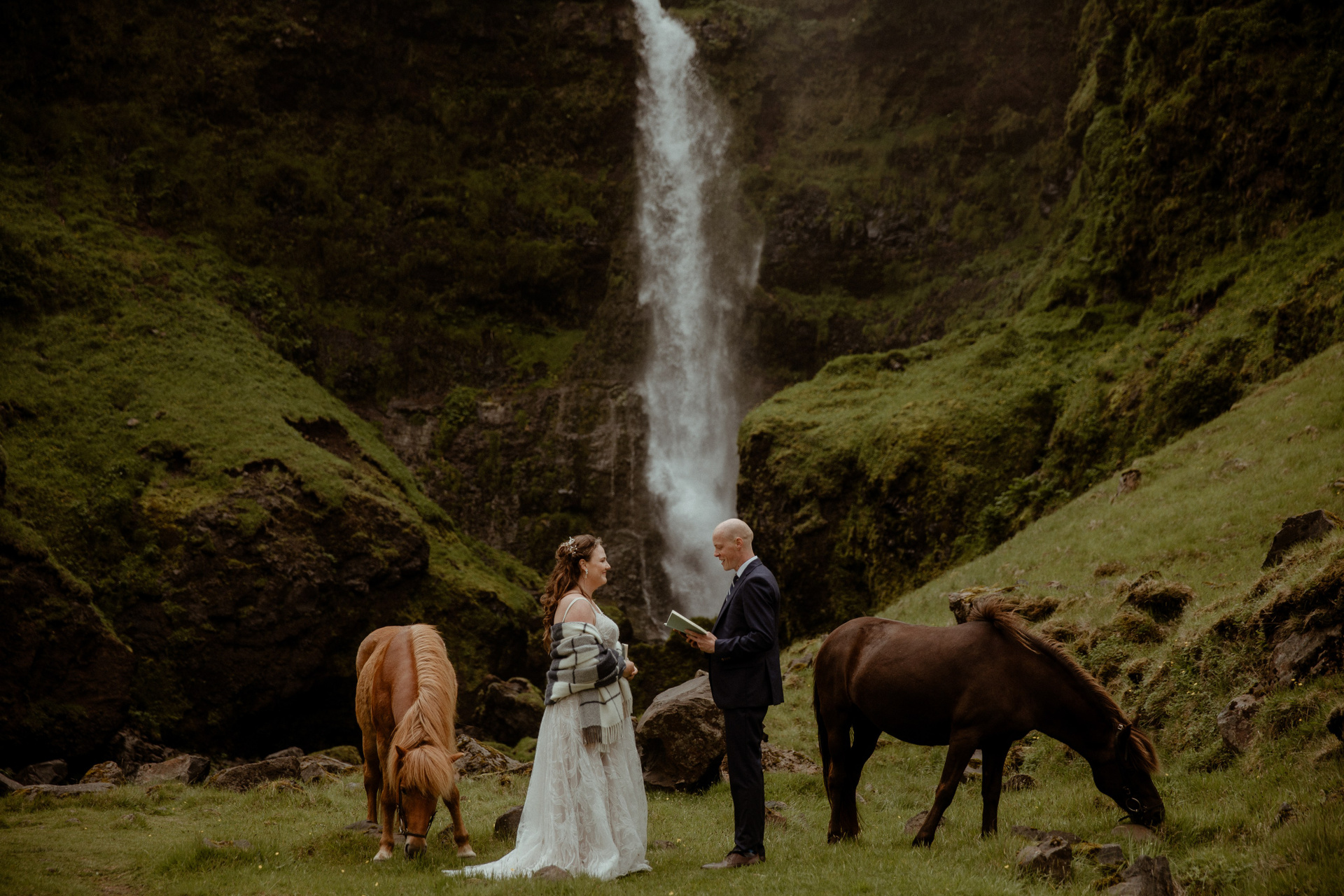 Then came the ceremony by a hidden waterfall, where the real magic happened! Our couple, standing hand in hand, with Icelandic horses as their only audience, made their promises to each other. The soft rain that started to fall only added to the intimacy and magic of their Iceland elopement, creating a beautiful, otherworldly scene.