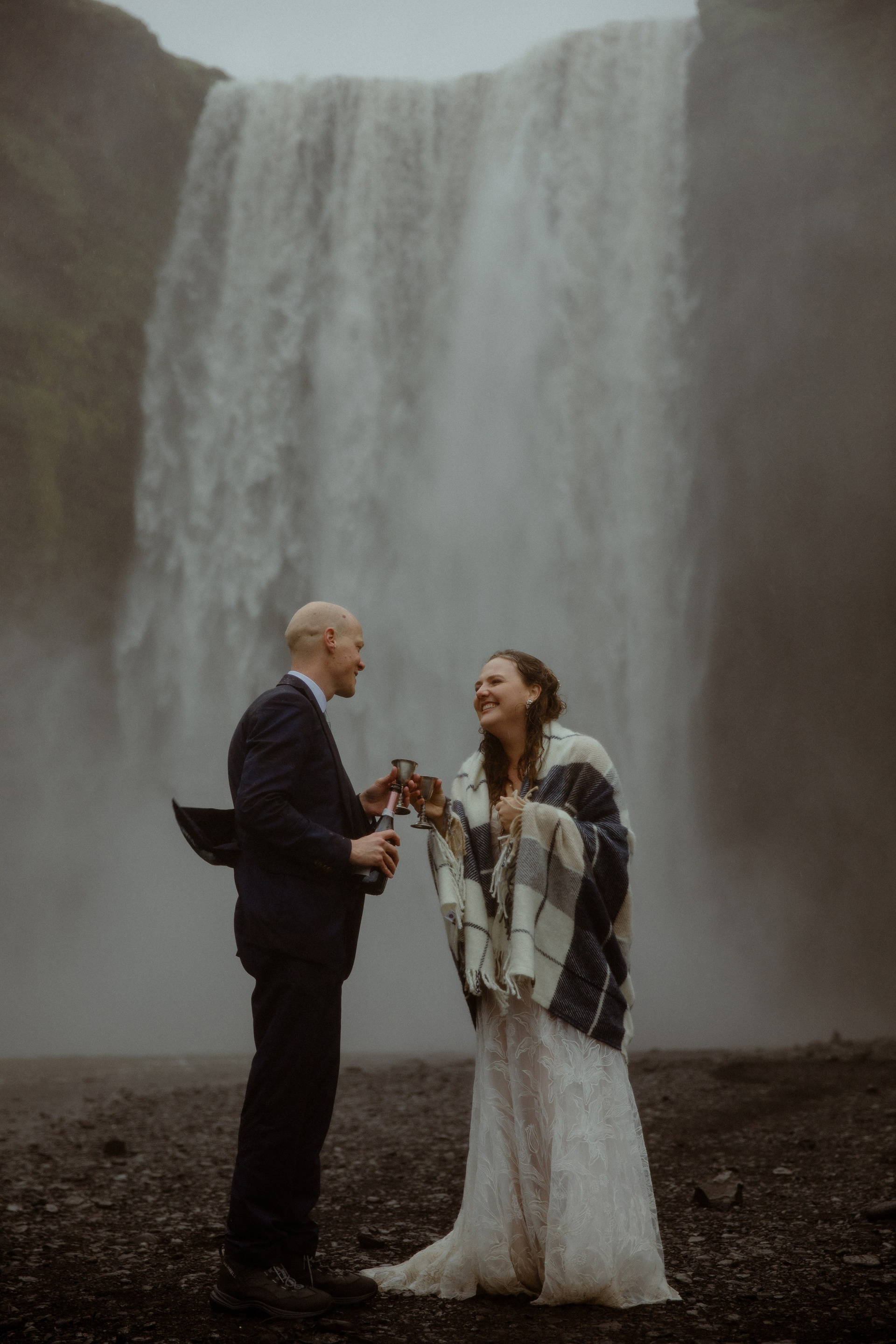 Their adventure didn’t stop at the vows! We ventured to Skogafoss, where, against the roaring backdrop, they popped open a bottle of champagne, laughing and toasting to their future! Soaked but ecstatic, they embodied the spirit of an adventure elopement in Iceland.