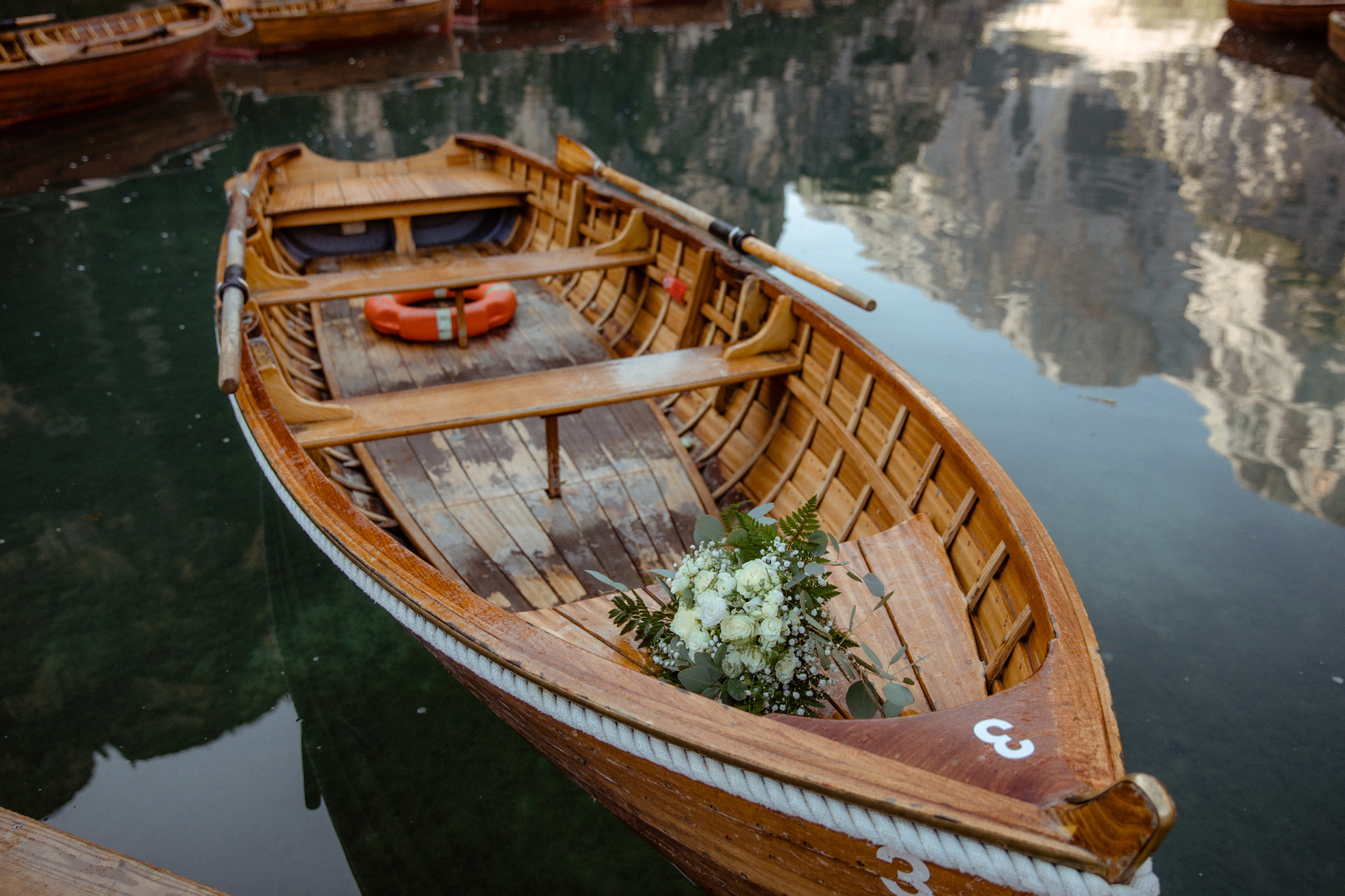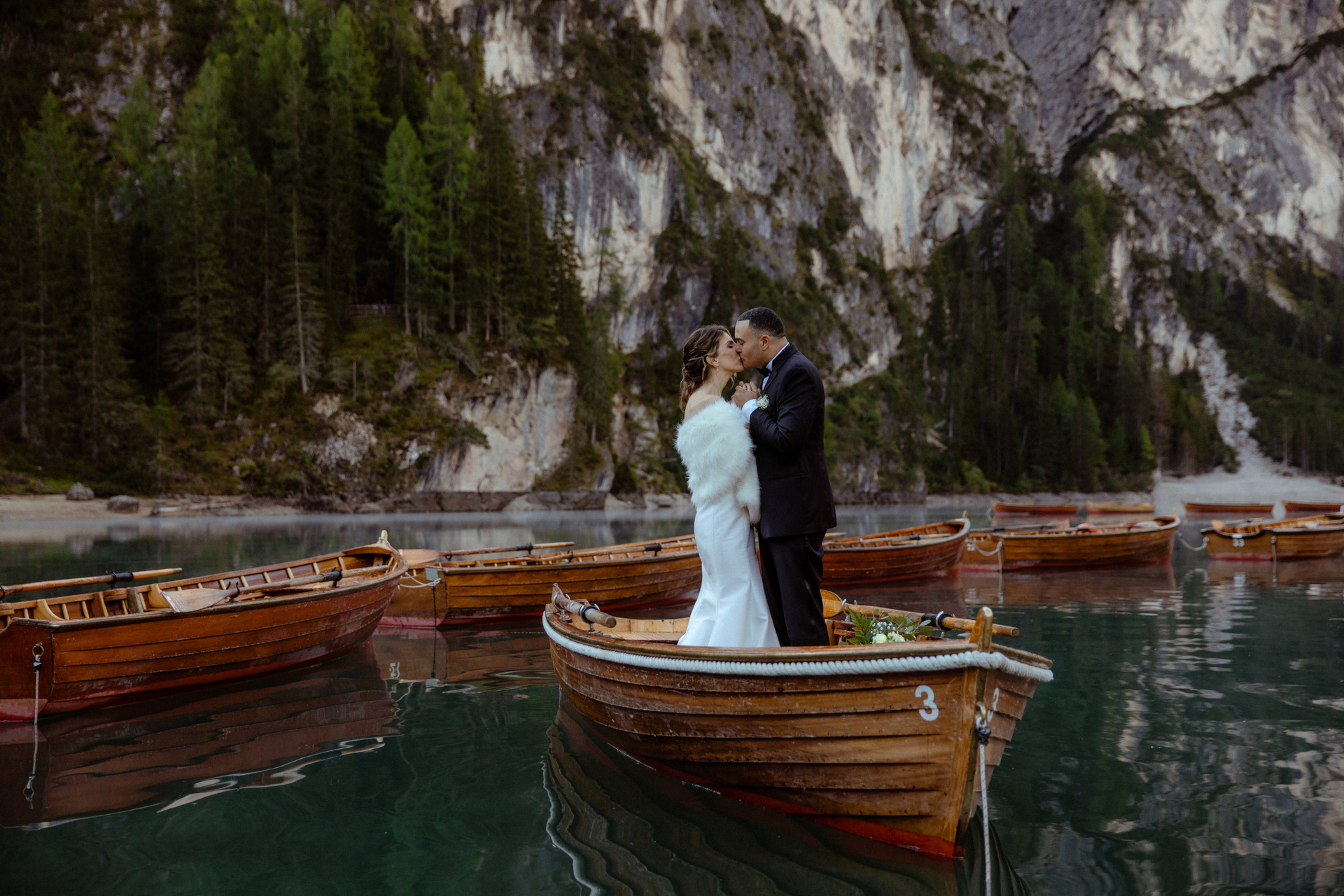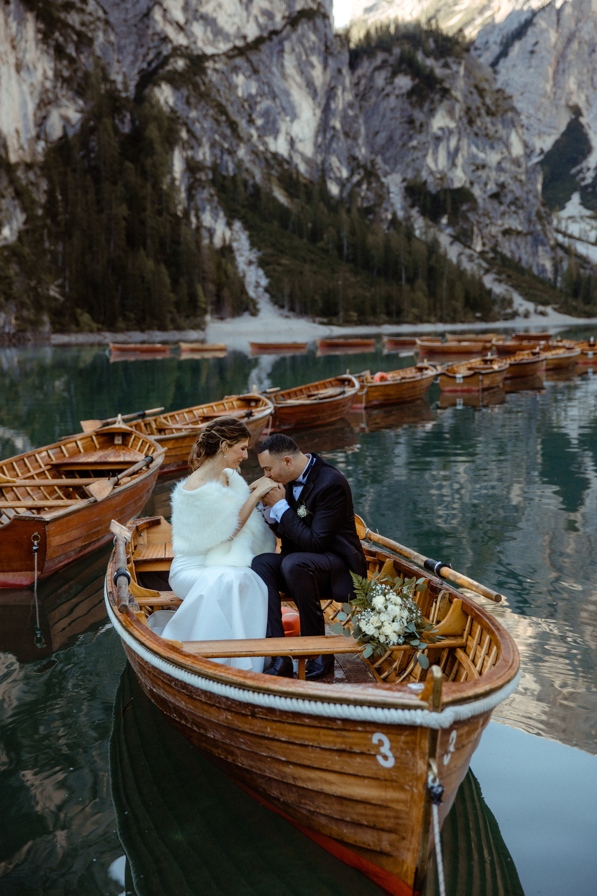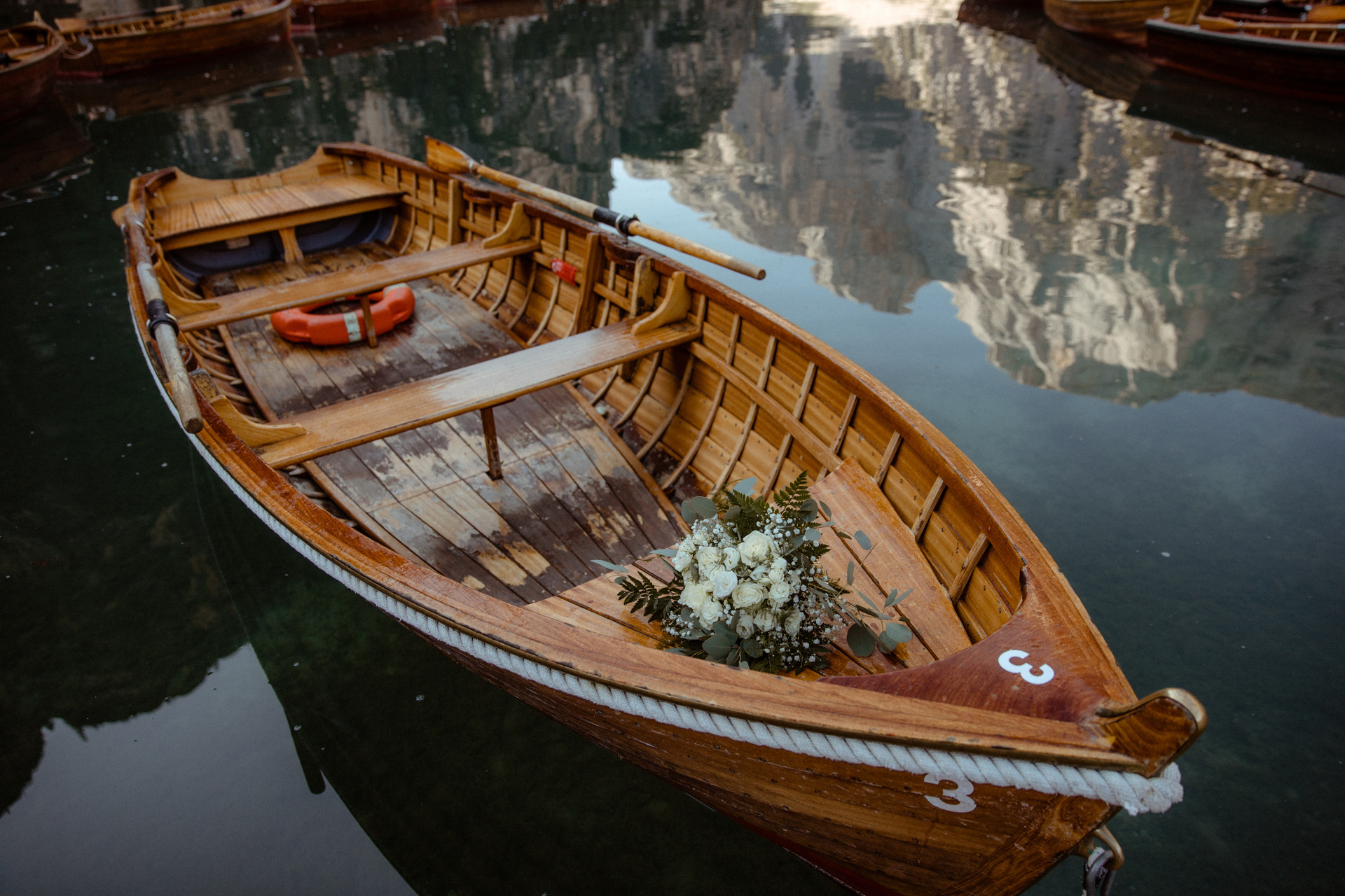 Their wedding day started at sunrise with a stunning first look at Lago di Braies. They celebrated their love with cymbolic ceremony after. Exchanged vows in a romantic ceremony on that Italian lake, where they rented a vintage wooden boat after to row to the middle for a truly unique experience!