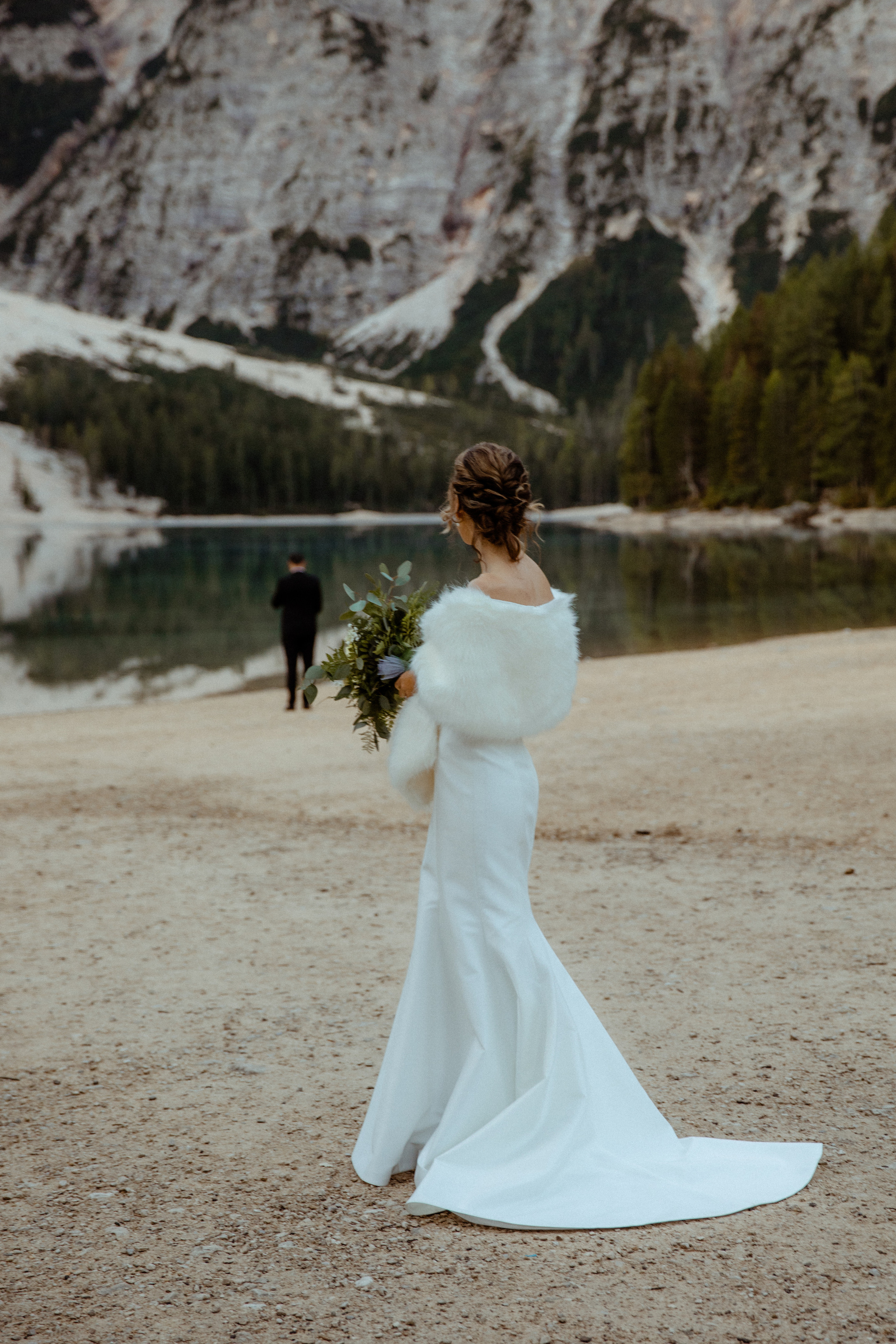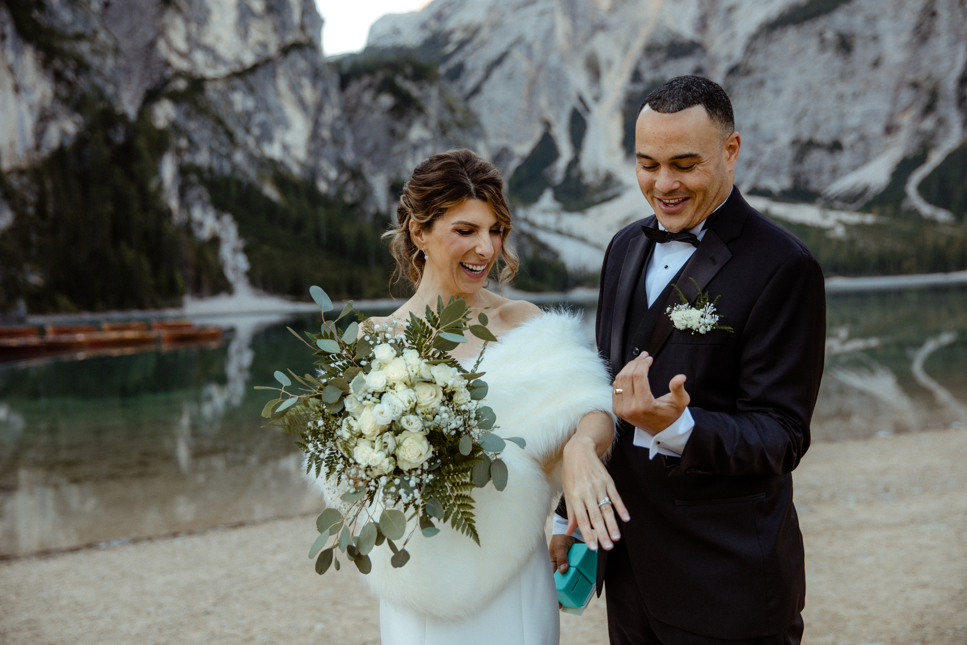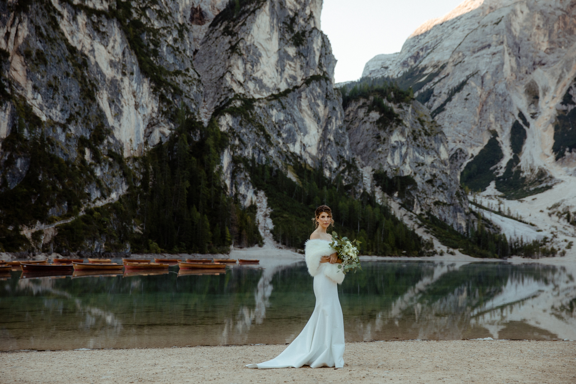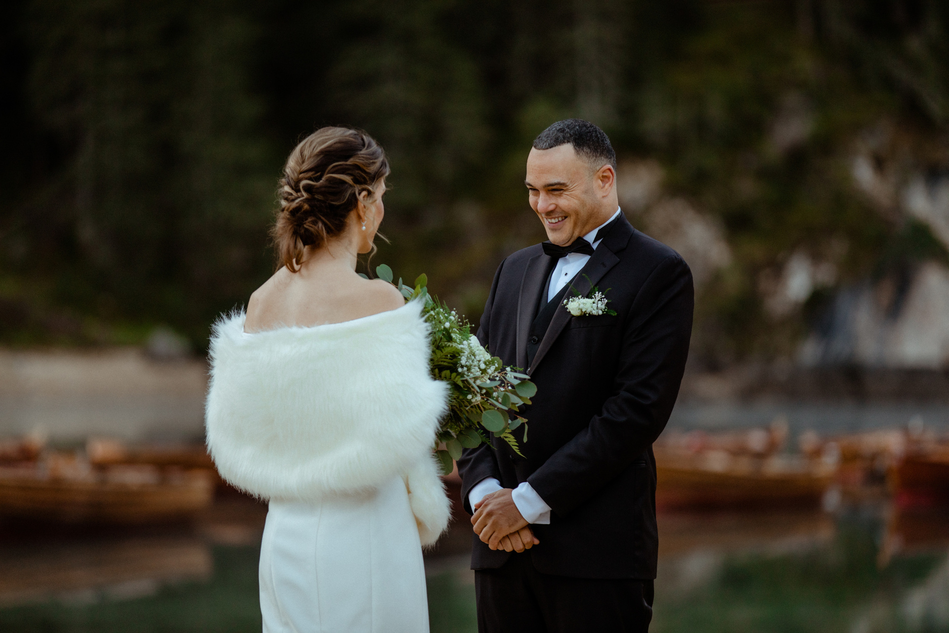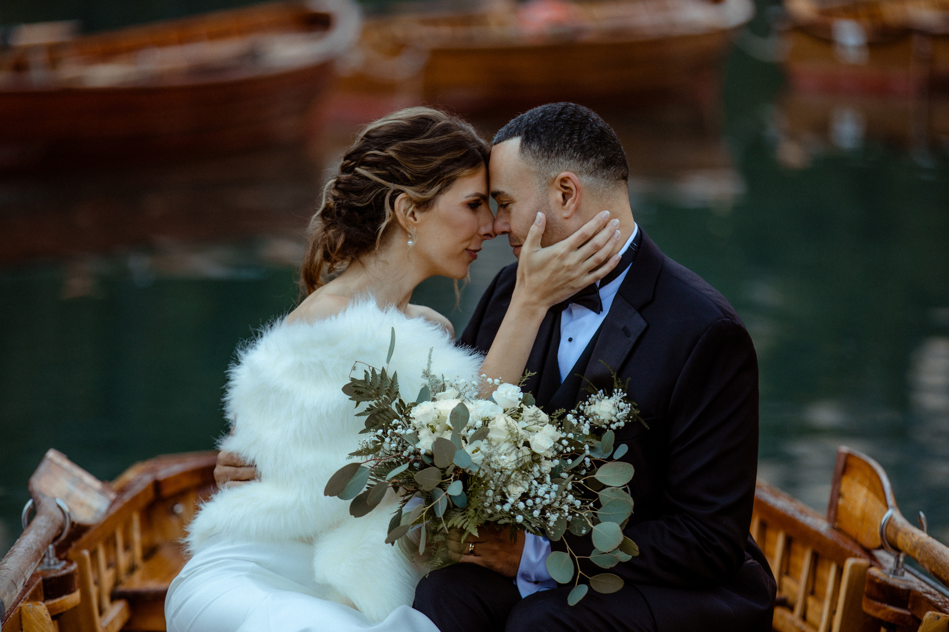 Their wedding day started at sunrise with a stunning first look at Lago di Braies. They celebrated their love with cymbolic ceremony after. Exchanged vows in a romantic ceremony on that Italian lake, where they rented a vintage wooden boat after to row to the middle for a truly unique experience!