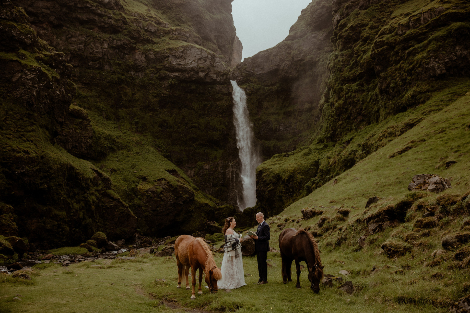 Seljalandsfoss offers a unique experience where you can walk behind the waterfall, creating a truly magical setting for your ceremony or photos. The play of light through the waterfall’s mist adds an ethereal quality to your Iceland elopement.